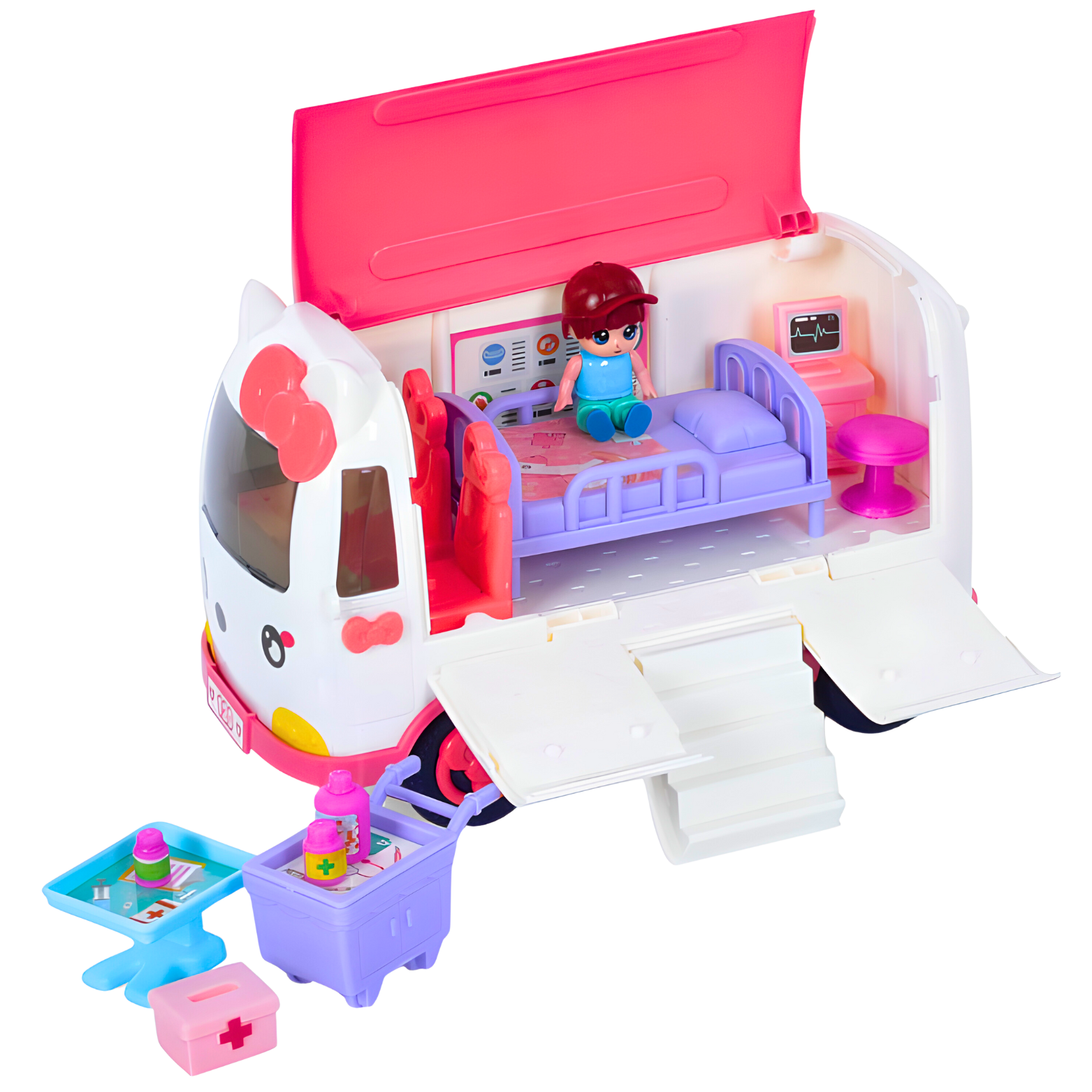 Uroczy design i dbałość o detale przyciągnie wzrok każdego i zainteresuje na długi czas. Ta zabawka doskonale sprawdzi się zarówno podczas samodzielnej zabawy, jak i odgrywania scenariuszy z przyjaciółmi. Pojazd jest otwierany, a w jego wnętrzu znajduje się gabinet, w którym jest wszystko co potrzebne do prawidłowego diagnozowania i leczenia pacjentów. Poza biurkiem lekarza, w zestawie znajduje się szafka z tacką, leki i łóżko na którym odpocząć może mały pacjent. Ten uroczy ambulans to idealna zabawka dla każdego, kto lubi leczyć swoje lalki i misie i w przyszłości chciałby zostać lekarzem.