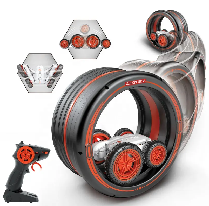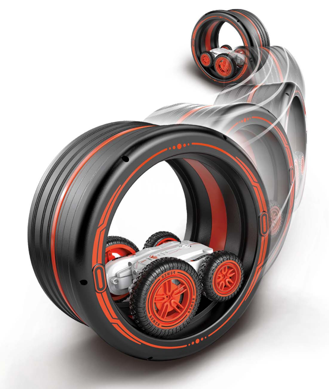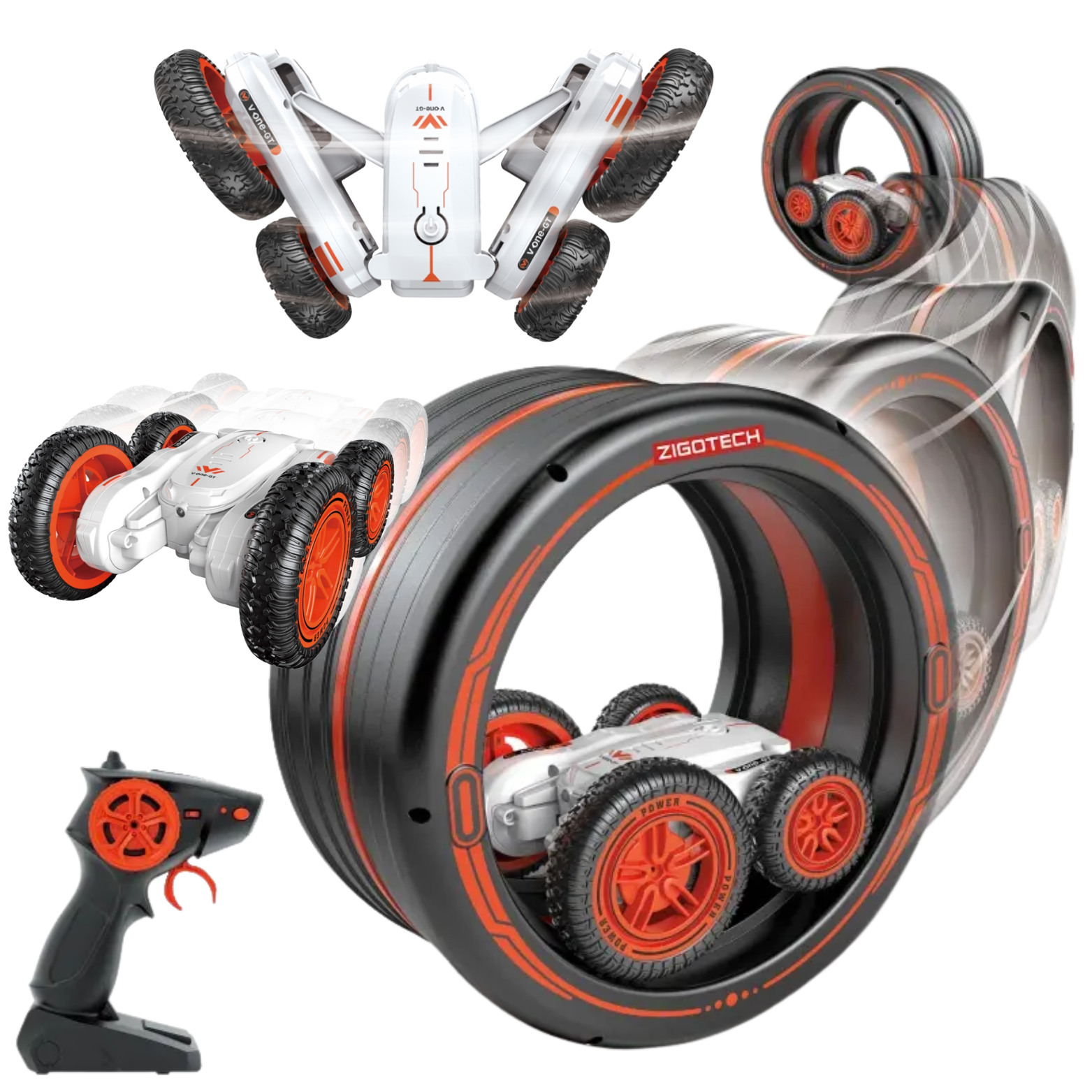 Zdalnie sterowany, szybki się samochód z kołem kaskaderskim. Całość ma unikalną konstrukcję, która pozwala mu wykonywać akrobacje na dwóch kołach, obracać się z dużą prędkością i pokonywać przeszkody. Zestaw zawiera koło kaskaderskie, którym można jeździć, kręcić razem z samochodem lub wykorzystać jako kaskader do przeskoczenia.