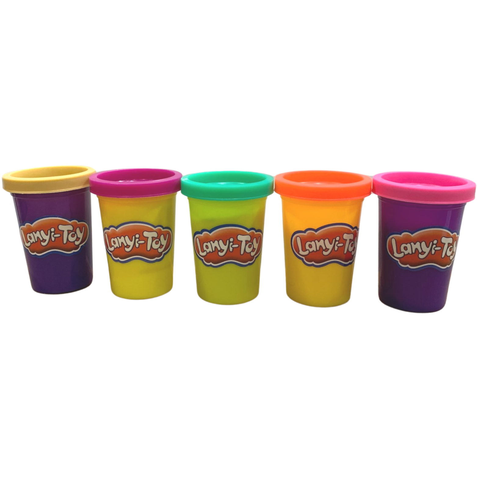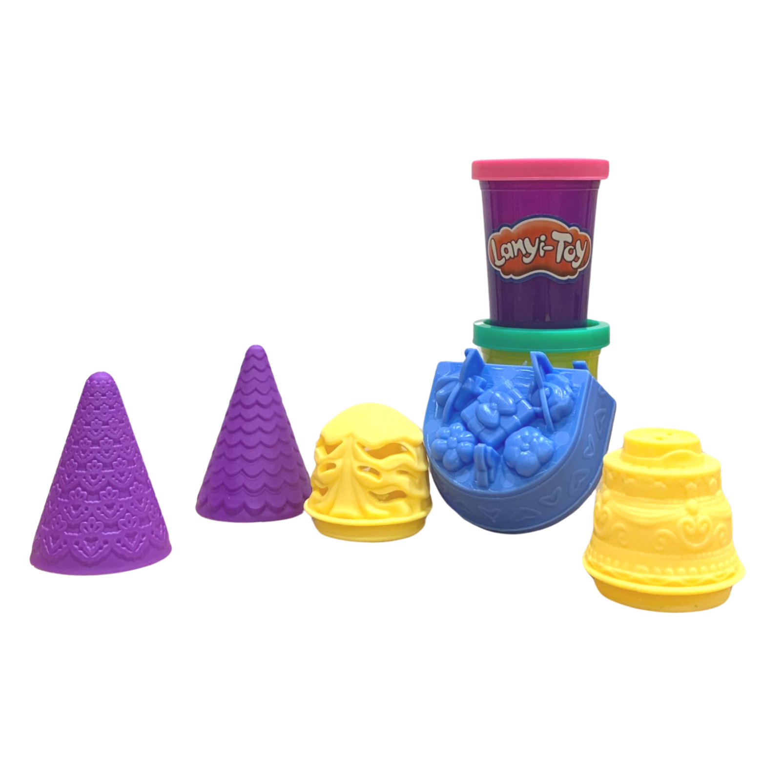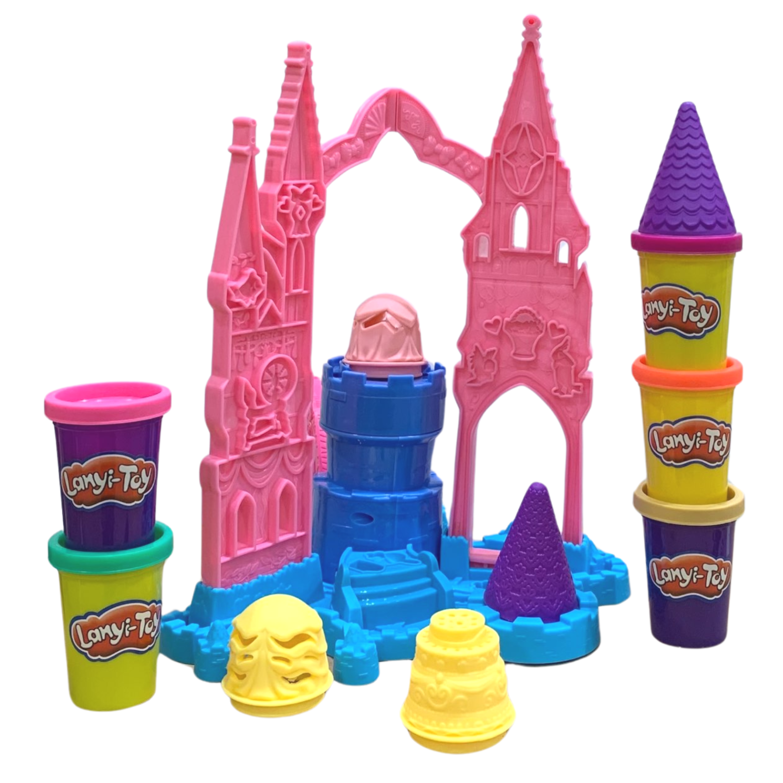 Zestaw zawiera różnokolorową ciastolinę, która służy jako materiał do tworzenia różnych elementów w zamku.