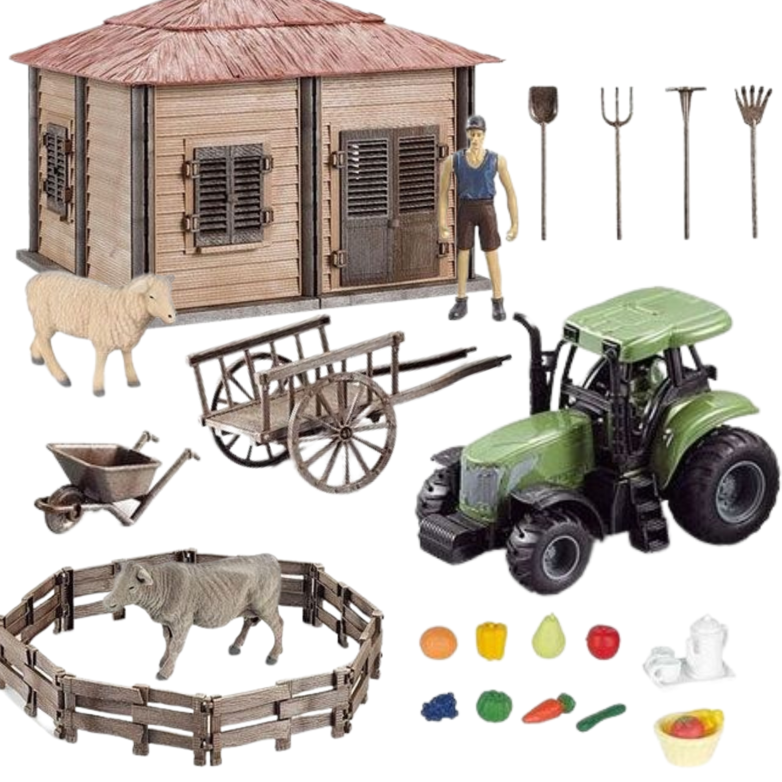 Traktor to niezbędny sprzęt na farmie. Dziecko może nim przewozić zwierzęta, przyczepiać wózek budowalny i wykonywać różne prace rolnicze. Zestaw zawiera narzędzia rolnicze, takie jak łopata, widły i grabie. Dzięki nim można pomóc w pracach na farmie i utrzymać ją w doskonałym stanie. Oprócz tego na farmie znajdują się taczki, wózek.