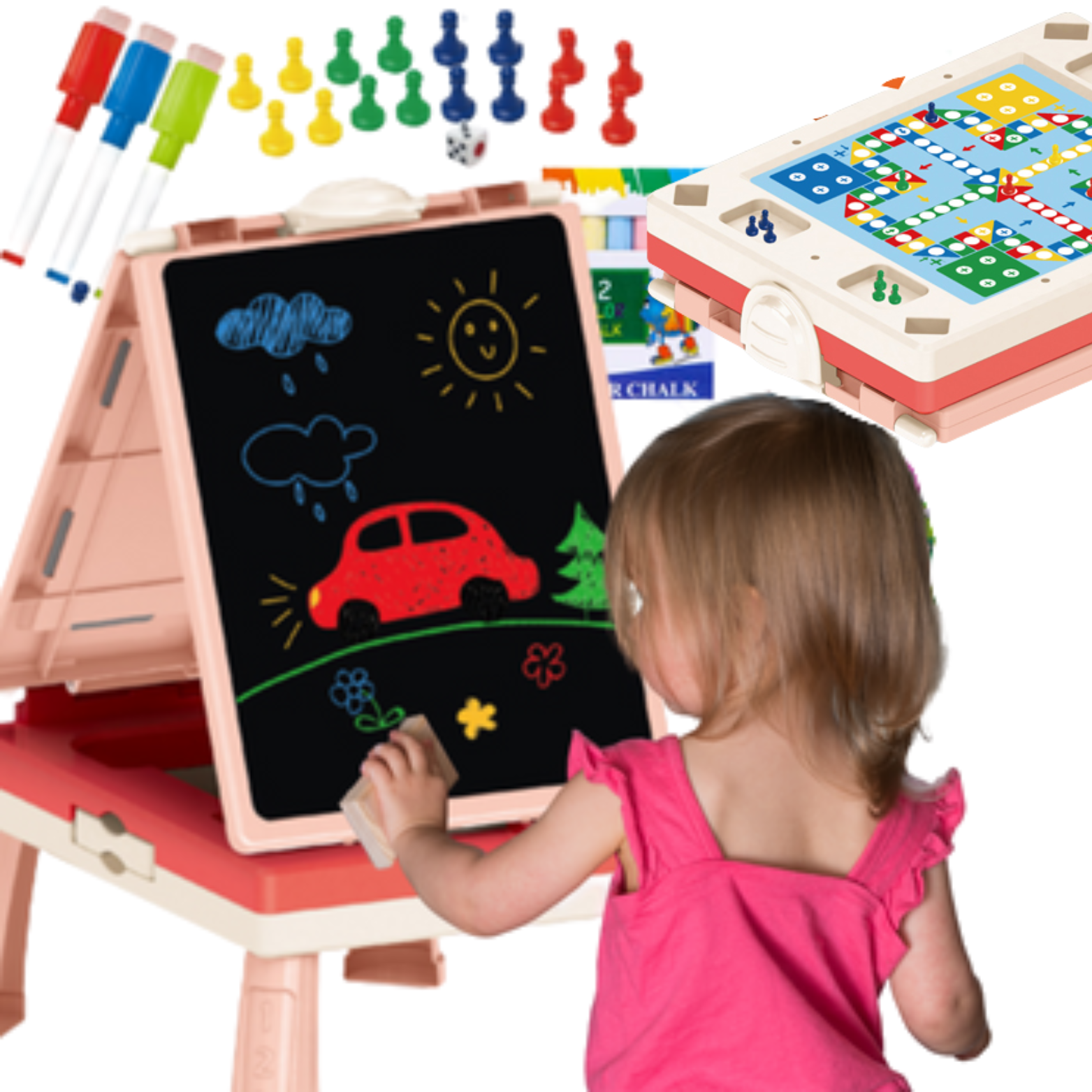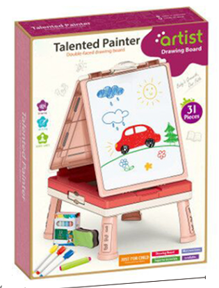 ZESTAW do malowania 2w1 będzie idealną rozrywką dla przyszłego artysty! Dzięki niemu dziecko będzie mogło rozwinąć swoje zdolności artystyczne! Zestaw posiada tablicę dwustronną: kredową ( do pisania kredą ) oraz magnetyczną (do pisania markerami).Tablica została wyposażona w różne przybory małego artysty. Dzięki tym elementom, komplet nie sprawi żadnej trudności, a dziecko będąc na początku swojej przygody z malowaniem również będzie mógł się nauczyć rysować!