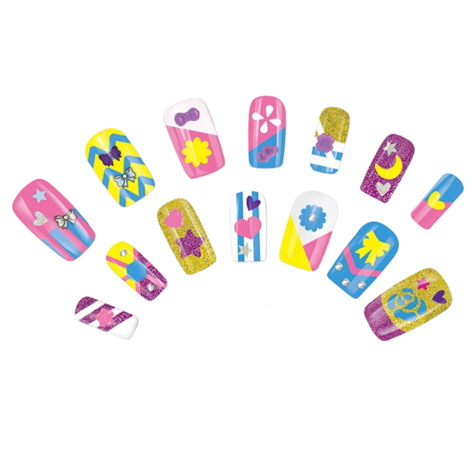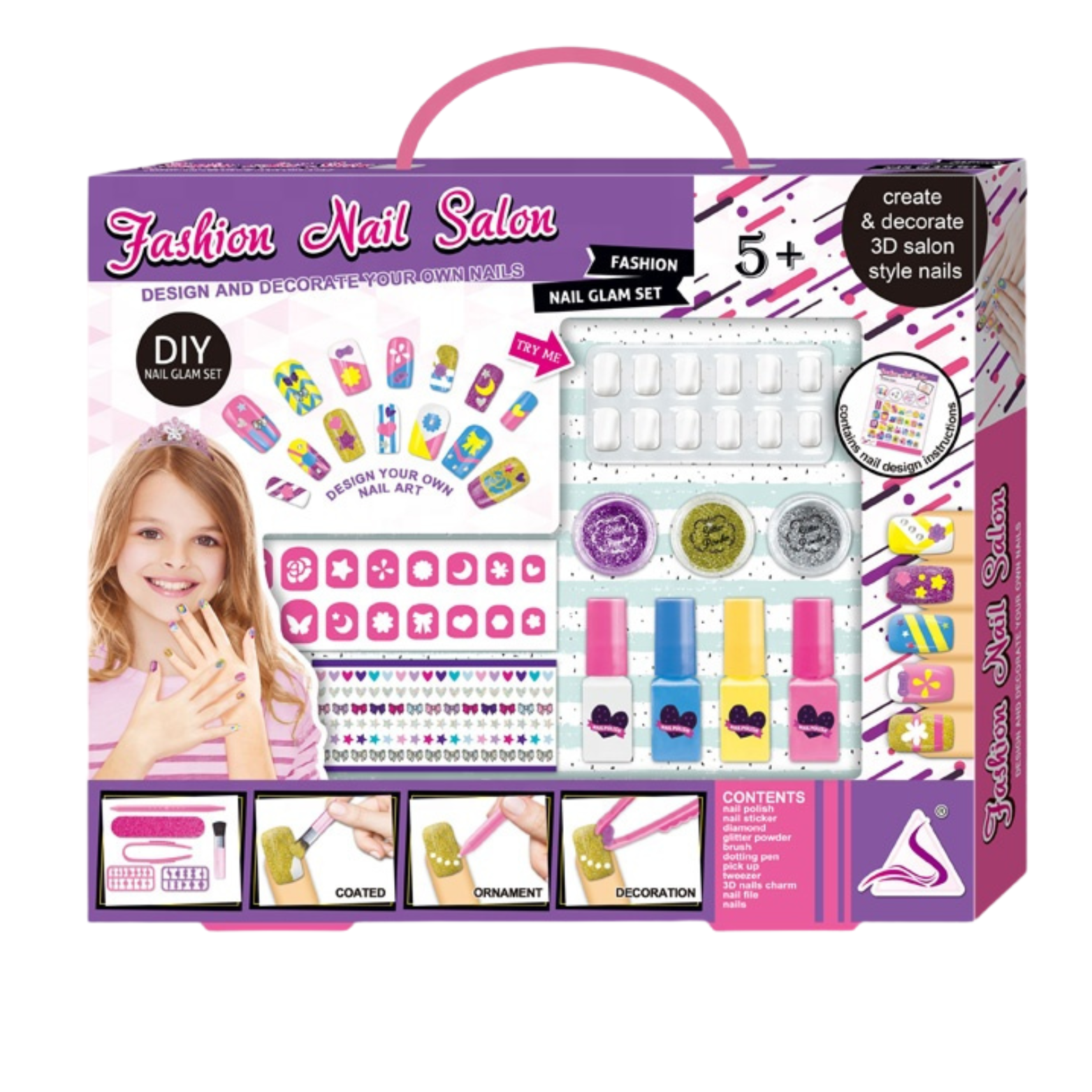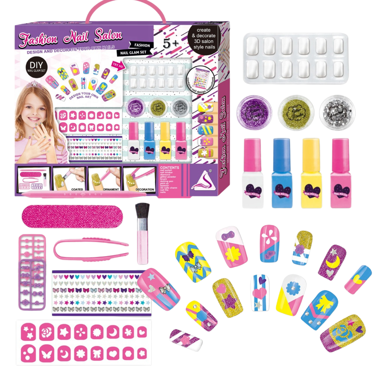 W zestawie znajdują się 4 różnokolorowe lakiery do paznokci oraz 3 pojemniki z brokatem, co pozwala dzieciom wybierać spośród wielu kolorów i stylów.
