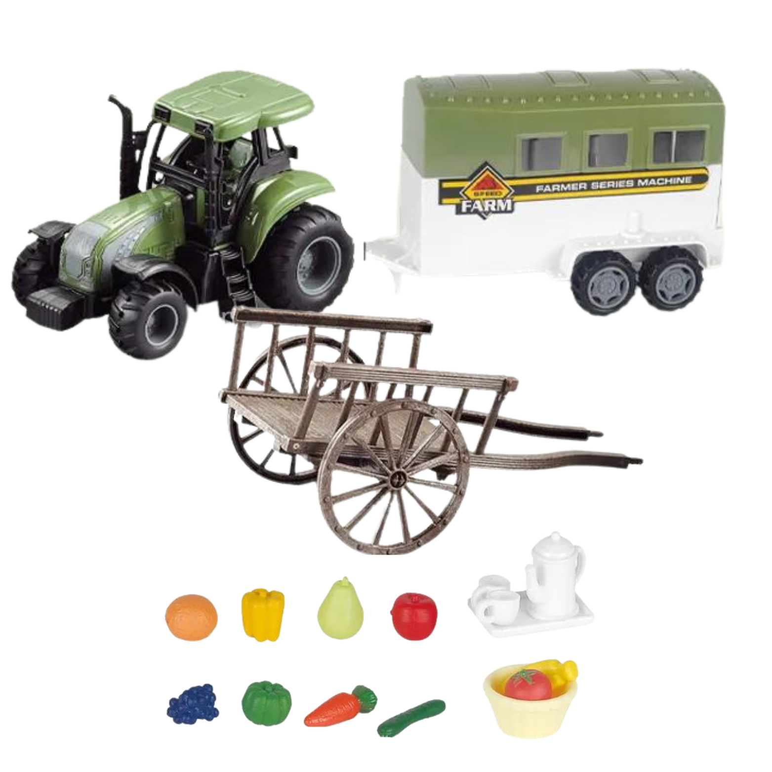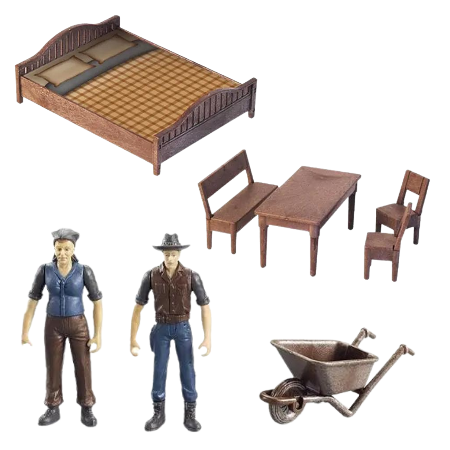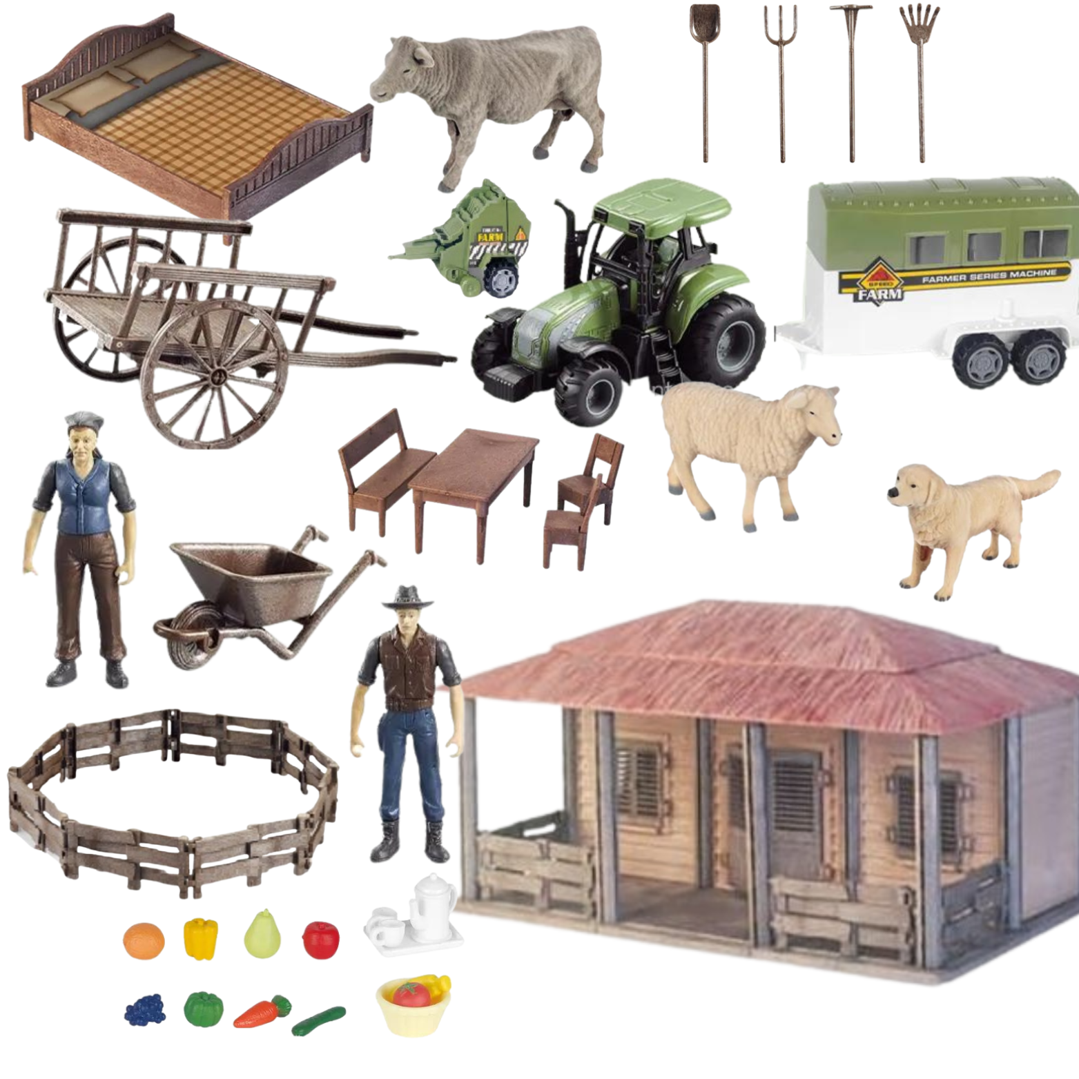 Zestaw zawiera wiele elementów, które umożliwiają dziecku stworzenie swojego własnego wiejskiego świata. Dzięki różnorodnym akcesoriom, takim jak domek, narzędzia rolnicze, stół, krzesła, ławka, łóżko i wiele innych, maluch może tworzyć swoje opowieści i symulować życie na farmie.