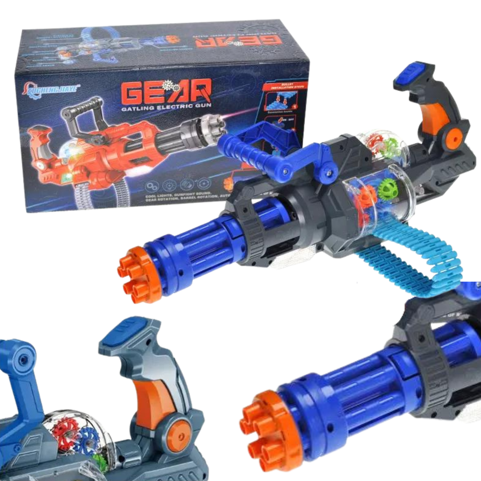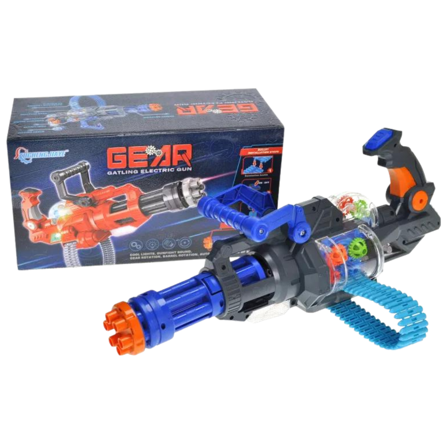 Granatnik sześciolufowy posiada efekty świetlne oraz dźwiękowe. Przy naciśnięciu na spust słychać odgłosy strzelania oraz wykonywany jest pokaz jasnych, wielokolorowych świateł. Karabin posiada również imitacje podawania nabojów i obrotu karabinu maszynowego, co urozmaica zabawę.