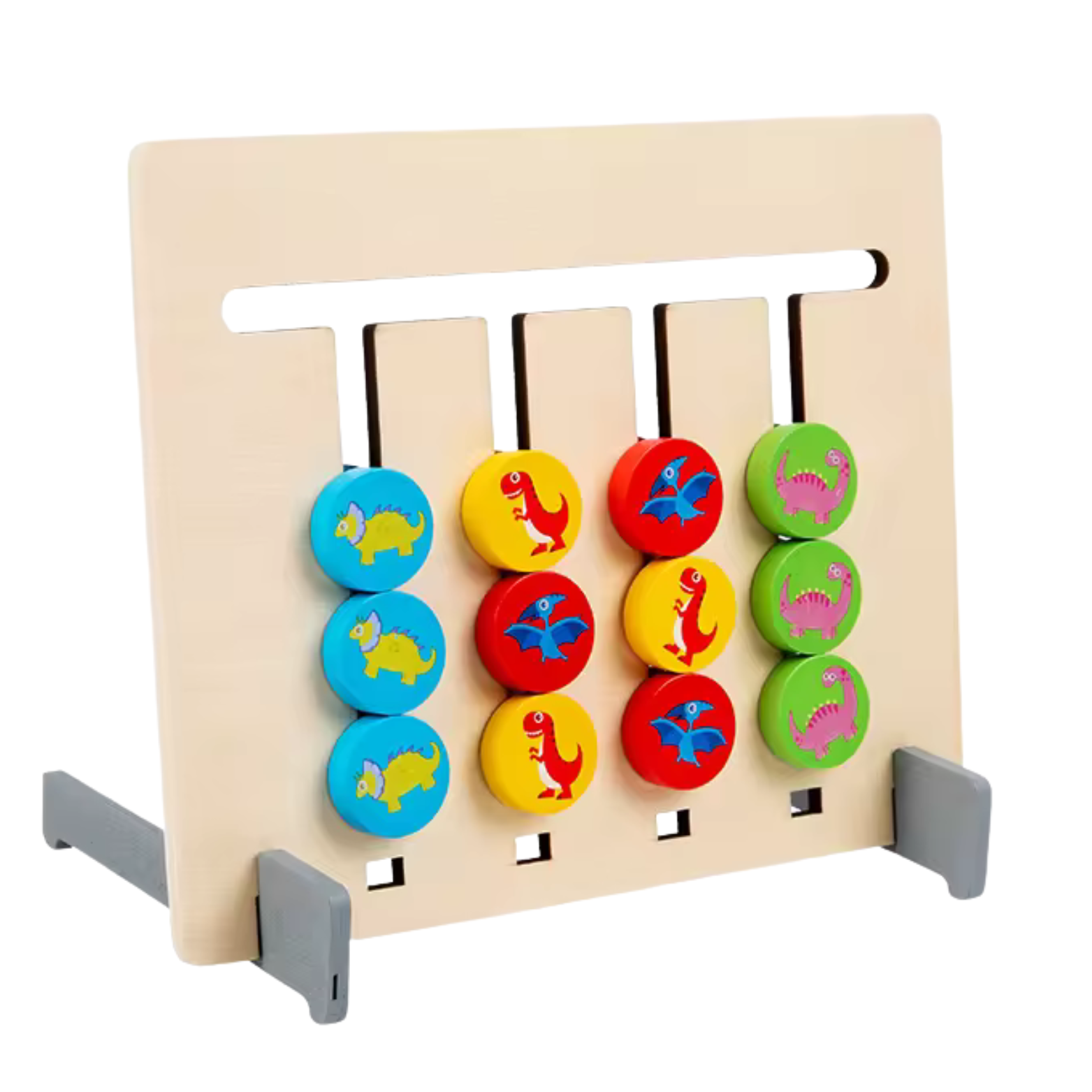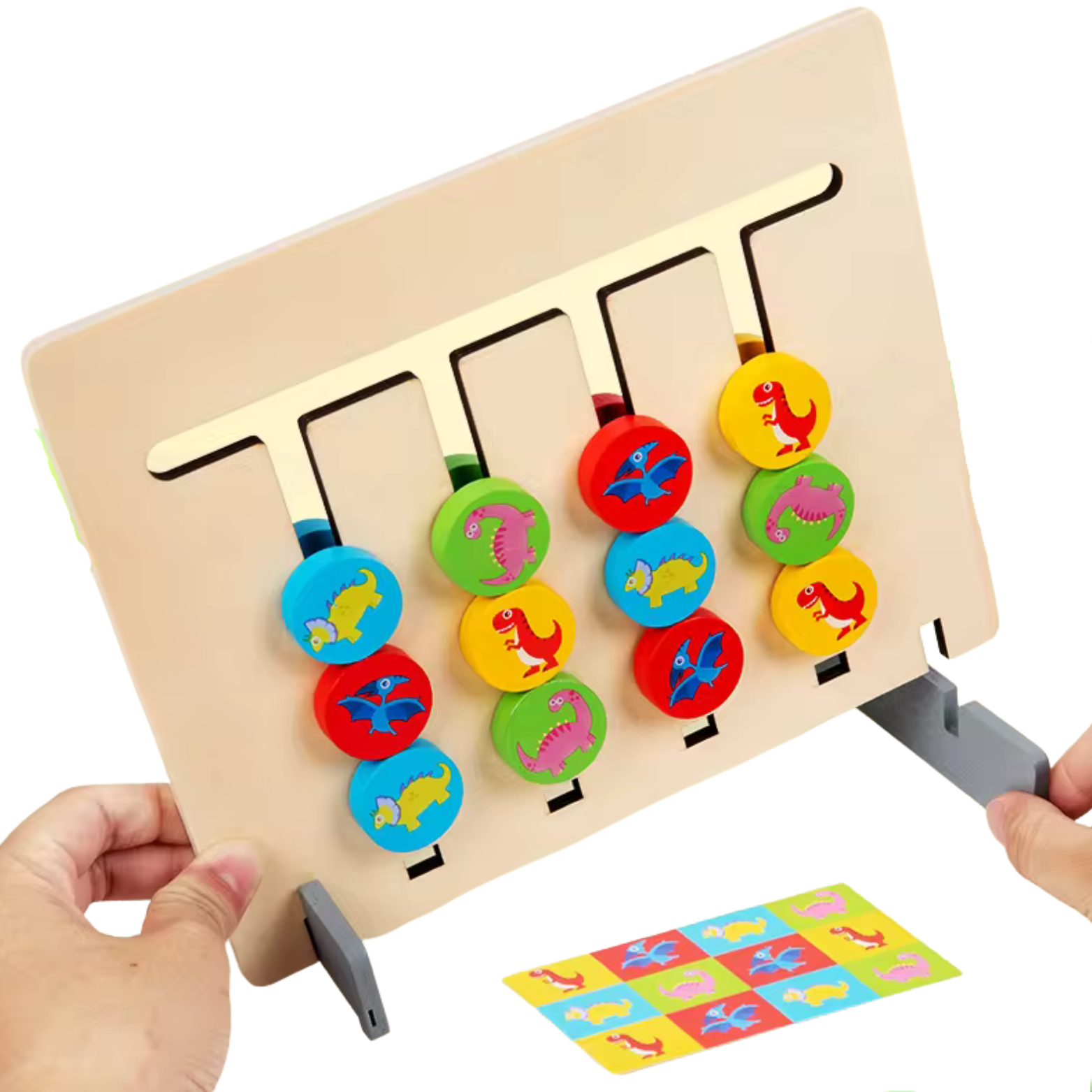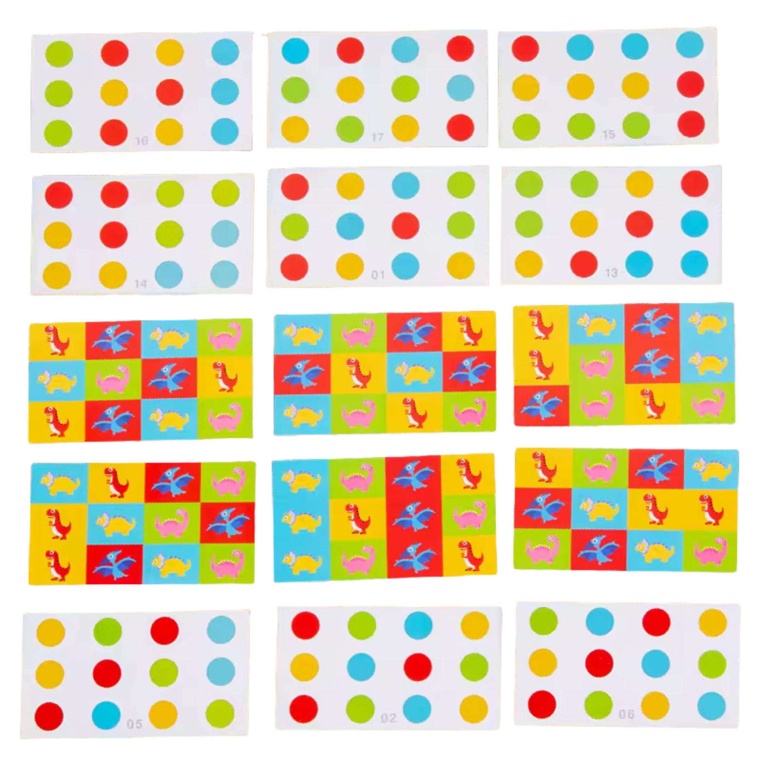 Klocki: kolorowe klocki posiadają z jednej strony urocze dinozaury, które dodają zabawnego elementu do gry. Każdy kolor ma innego dinozaura, a te również należy ułożyć według obrazka na karcie. Na drugiej stronie znajdują się czyste klocki, dzięki czemu młodszych dzieciom będzie łatwiej w nauce dopasowywania kolorów.