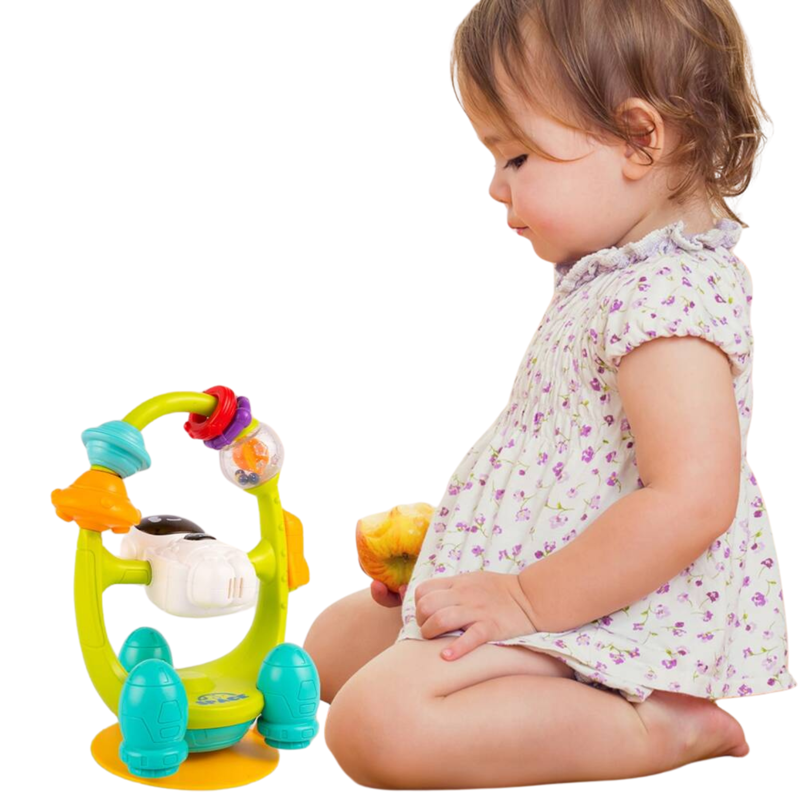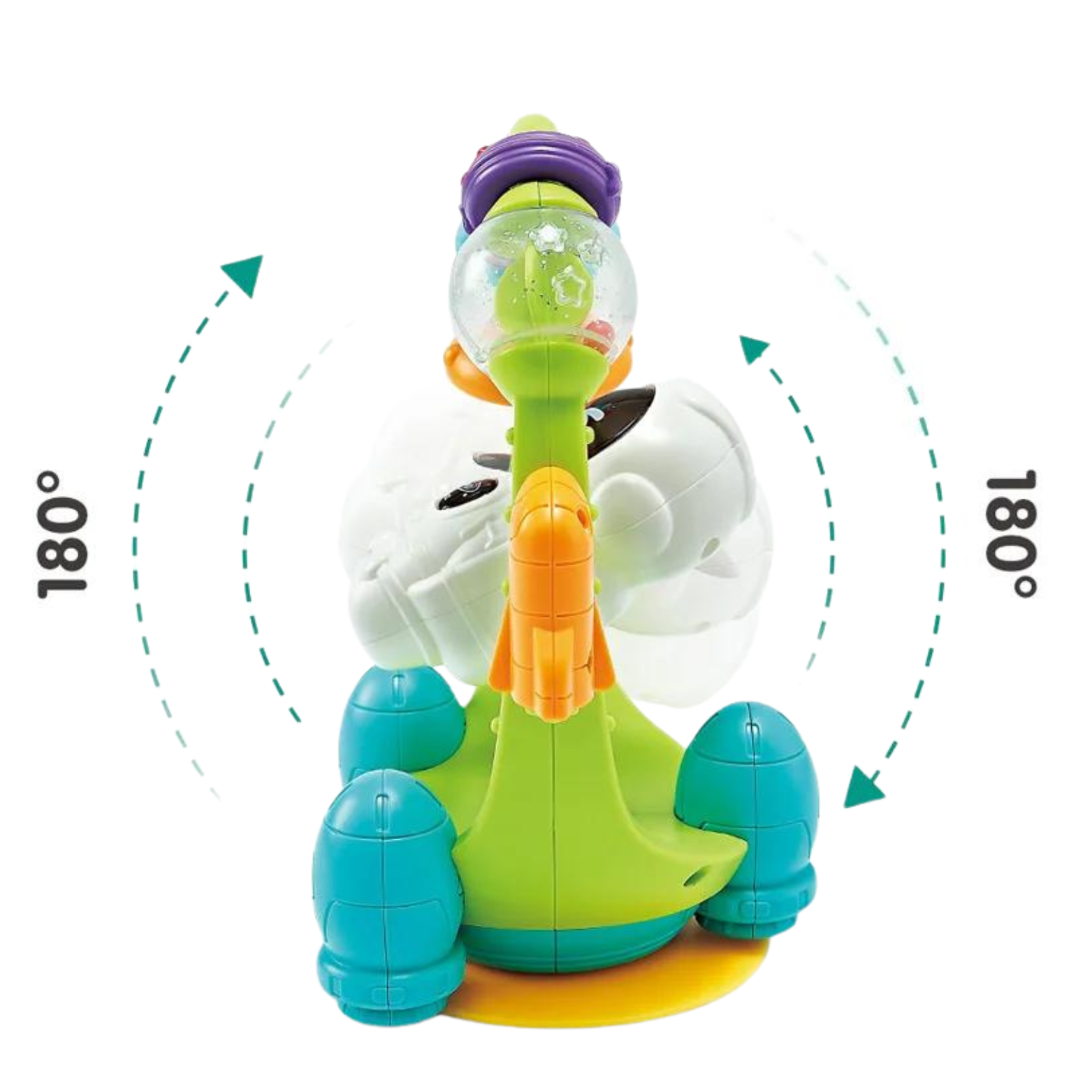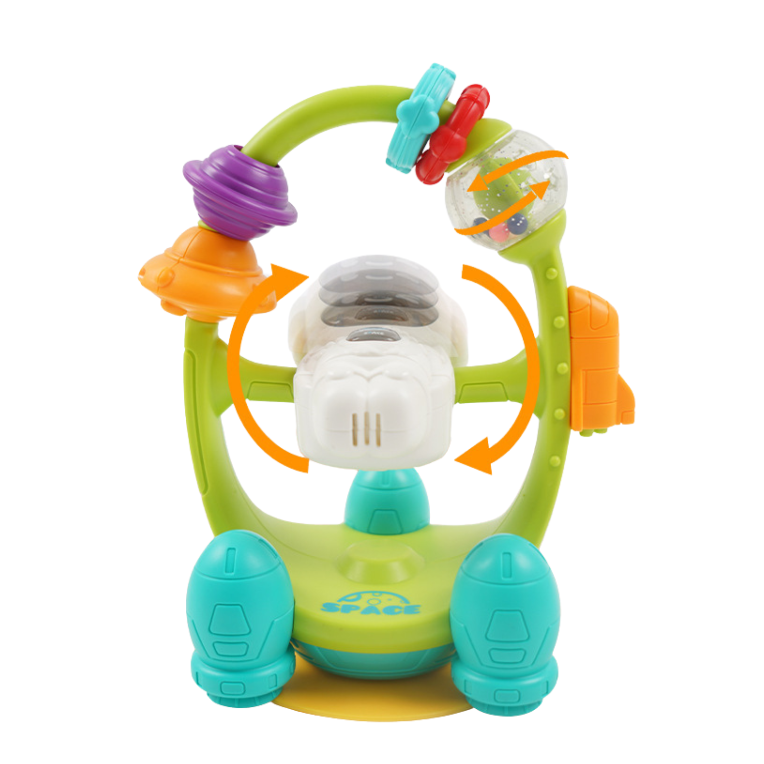 Astronautę można obracać o pełne 360 stopni, co umożliwia interaktywną i dynamiczną zabawę, rozwijającą zdolności motoryczne i koordynację ruchową. Duża przyssawka umożliwia przytwierdzenie zabawki do płaskiej powierzchni, co zapobiega przypadkowemu przesuwaniu się. To idealne rozwiązanie dla ruchliwych maluchów.