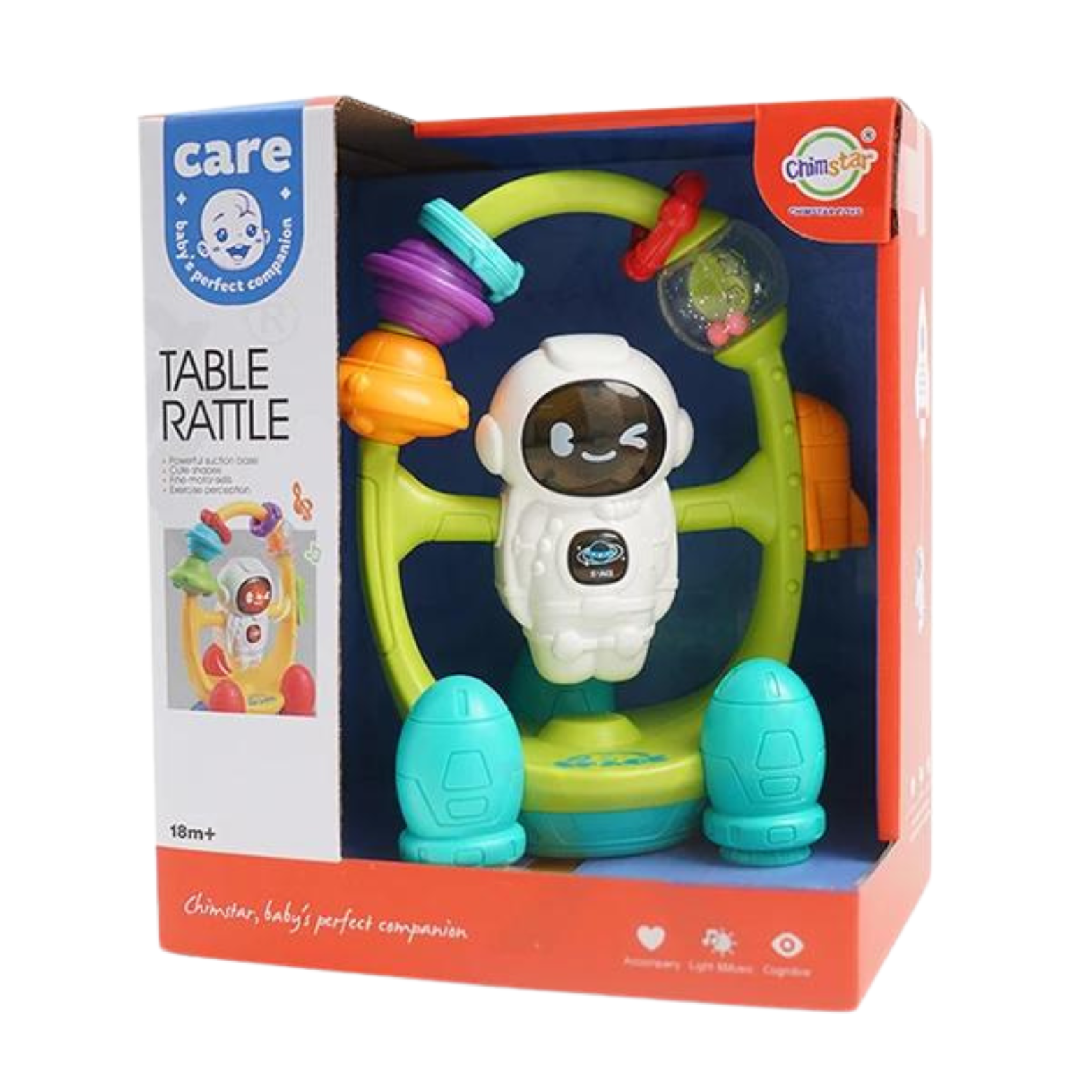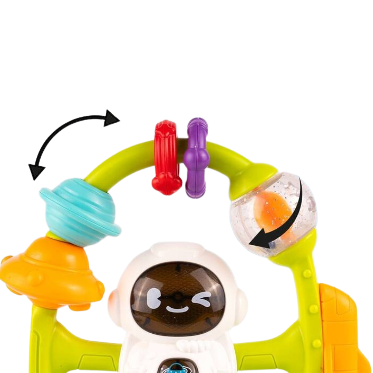 Grzechotka umieszczona koło astronauty to dodatkowy element zachęcający do zabawy. Jej obracający się ruch 360 stopni dostarcza dodatkowych bodźców sensorycznych. Zabawka z motywem astronauty pomoże w rozwoju wyobraźni u dziecka, rozwijaniu jego zainteresowań i poznawczych umiejętności.