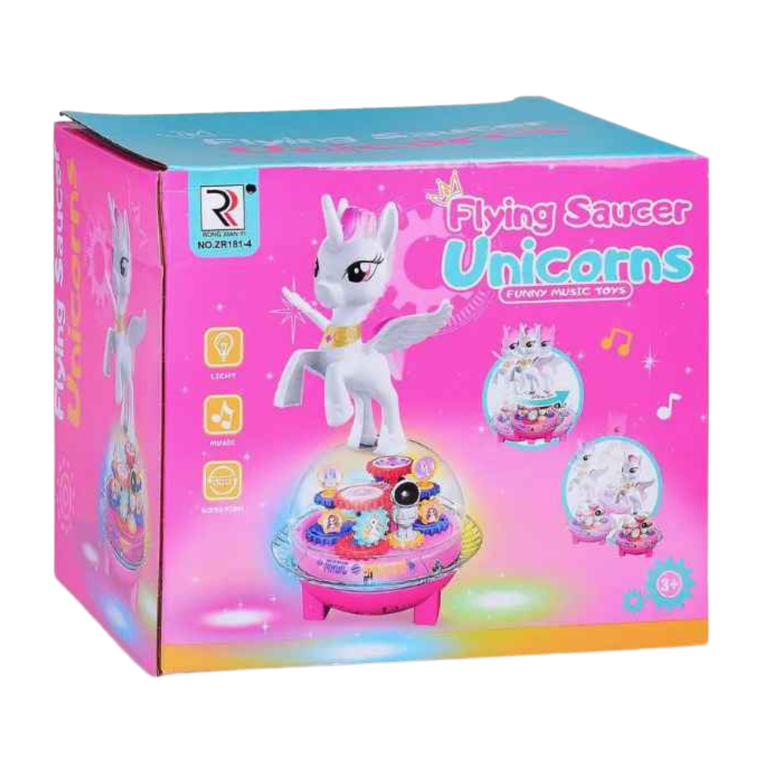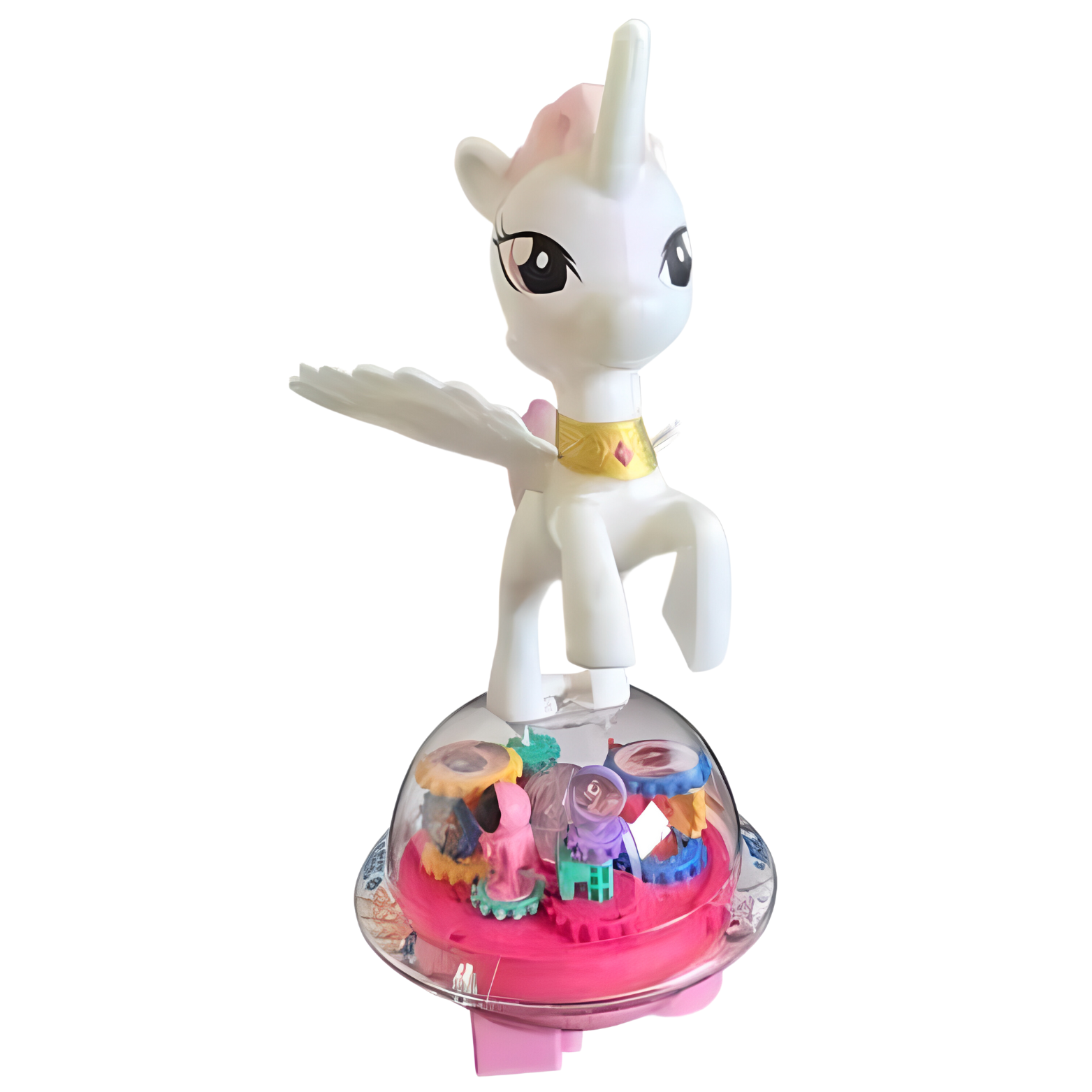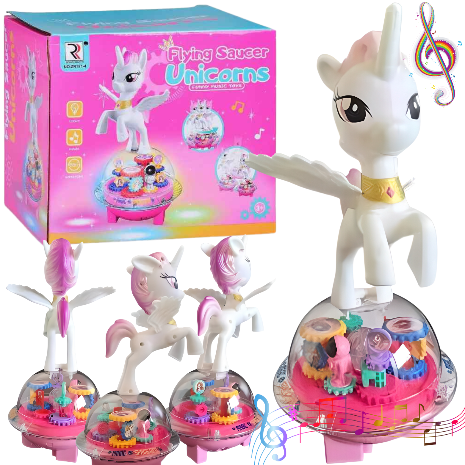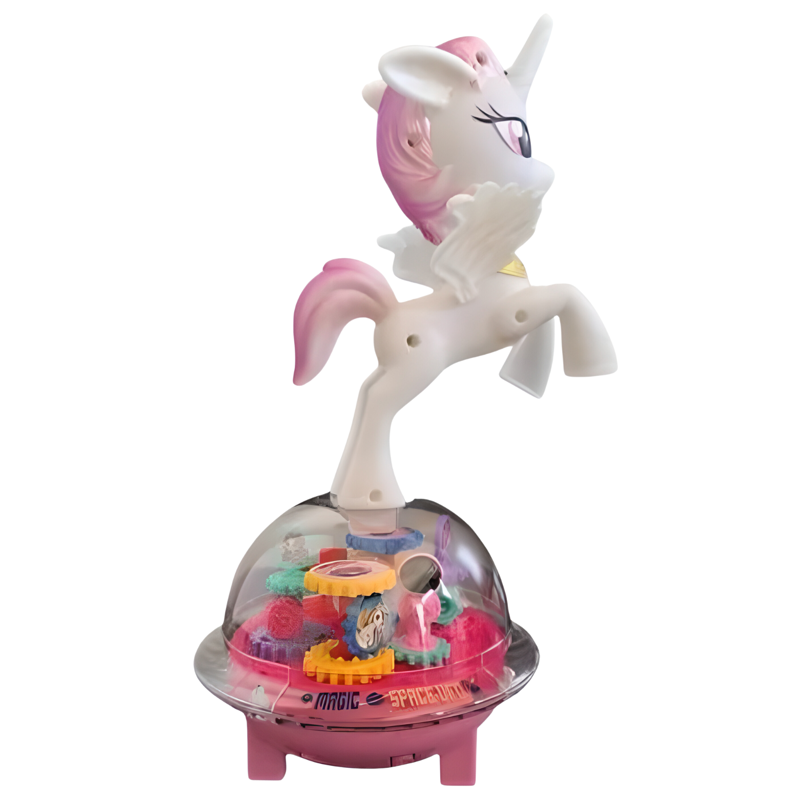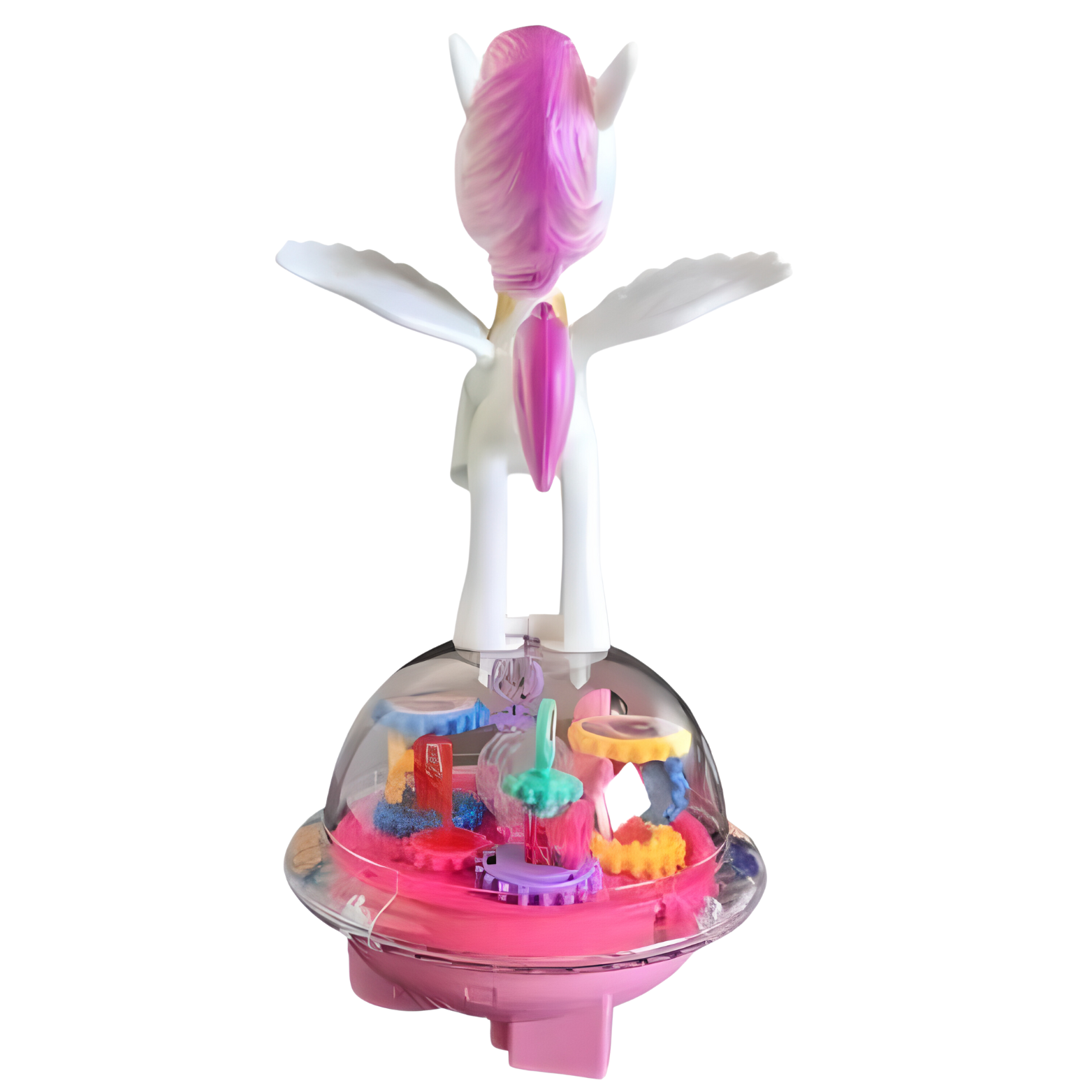 Obroty o 360° i przemieszczanie się: Pegaz na kuli zapewnia dynamiczną i interaktywną zabawę dzięki możliwości obrotu o 360° i przemieszczania się. Dziecko może obserwować, jak jednorożec tańczy wokół siebie, co rozwija jego zdolności motoryczne i koordynację ruchową.