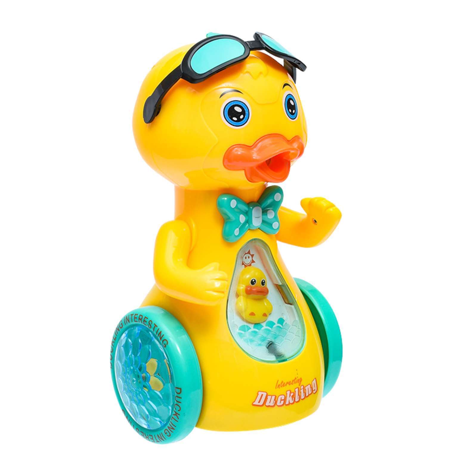 Kaczka może stać w miejscu lub poruszać się i przemieszczać do przodu, do tyłu. Dodatkowo porusza rękami i okularami. Poruszając się wypuszcza parę wodną. Interaktywna kaczuszka zachęci dzieci do ruchu i aktywnej zabawy. Melodie wydobywające się z zabawki są dodatkową atrakcją i umilają dziecięcą zabawę.