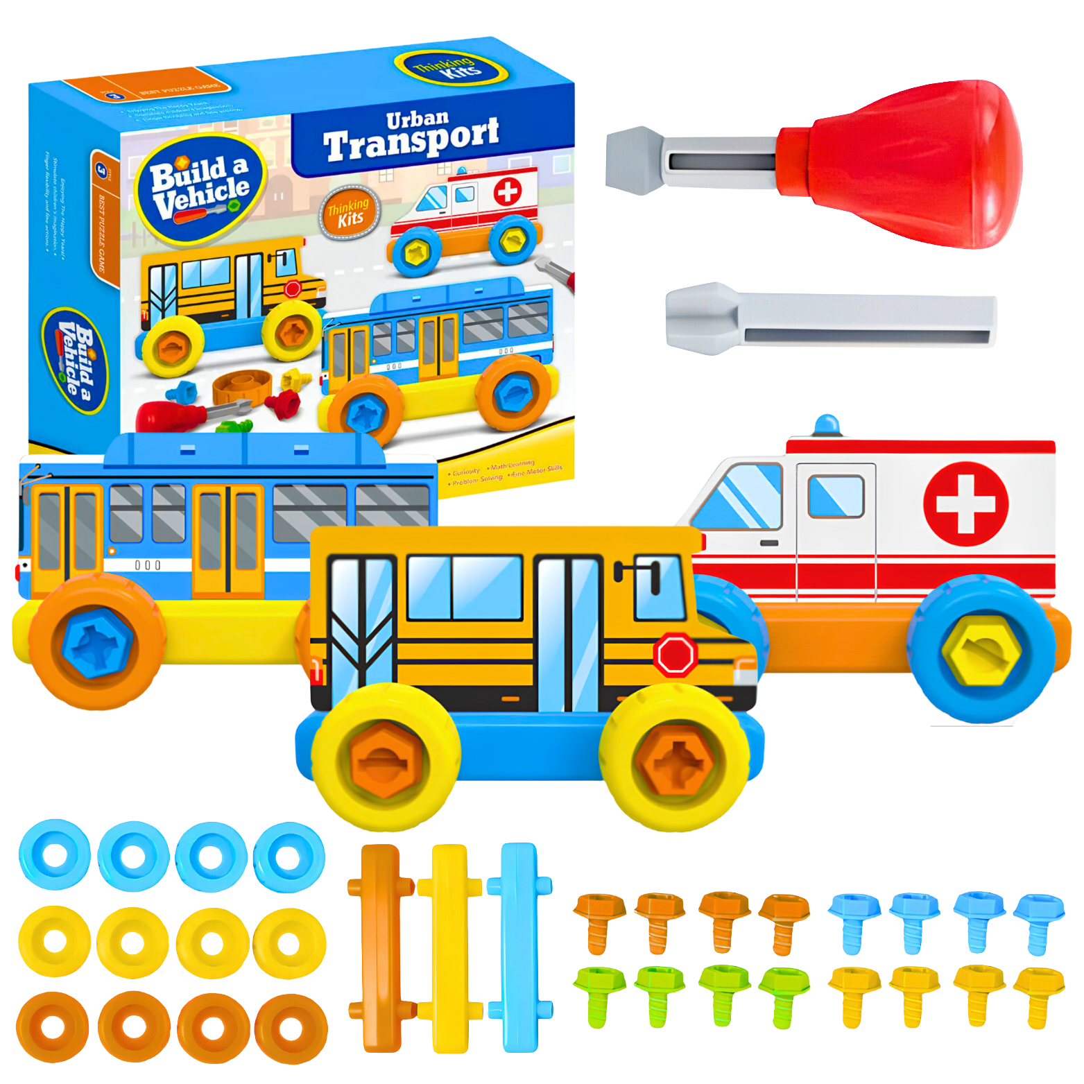 Prawdziwe montowanie: W zestawie znajduje się śrubokręt z wymiennymi końcówkami oraz komplet plastikowych śrubek, dzięki którym nawet najmłodsi będą mogli poznać świat budowania. Dzieci widząc dorosłych, którzy posługują się narzędziami, chcieliby być jak oni. Lepiej jednak nie dawać dzieciom prawdziwych sprzętów tego typu – zamiast tego, świetną alternatywą będą zabawki, które są bezpiecznie wykonane, a przy tym zachowują swoją prawdziwą funkcjonalność. Chcąc przyłączyć koła do podstawy pojazdu, należy użyć śrubek oraz śrubokrętu. W ten sposób pociechy w bezpieczeństwie poznają świat, uczą się do czego służą konkretne przyrządy, rozwijają umiejętności kreatywne i manualne, a najważniejsze, że równocześnie wspaniale się bawią.