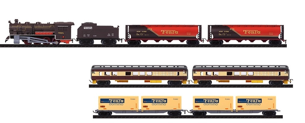 Oferowana kolejka wyposażona jest w lokomotywę oraz siedem różnych wagonów: 5x towarowe, które przewożą specjalistyczny ładunek oraz 2 pasażerskie, do których możemy zabrać mnóstwo osób. Taki skład gwarantuje pobudzenie wyobraźni i kreatywności!