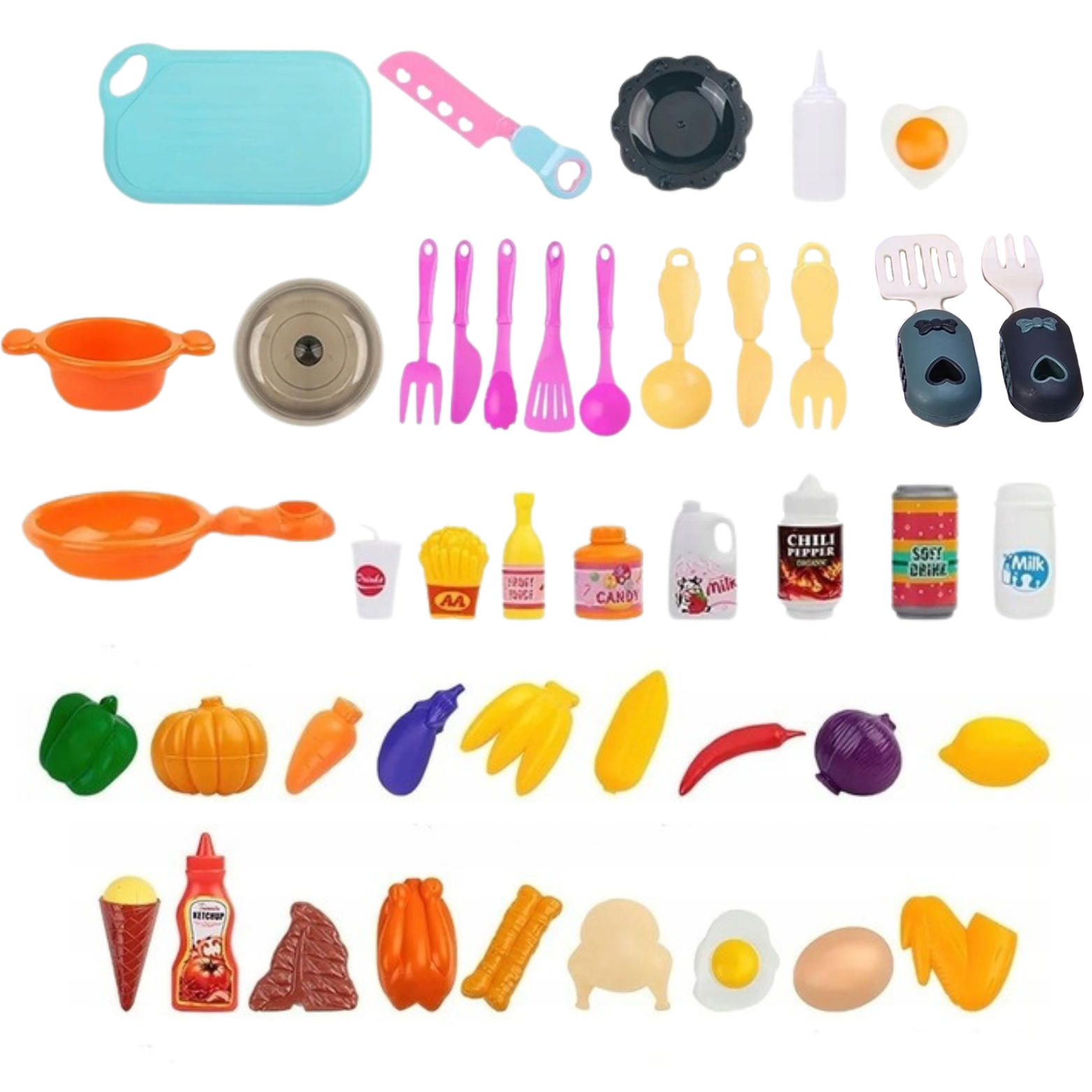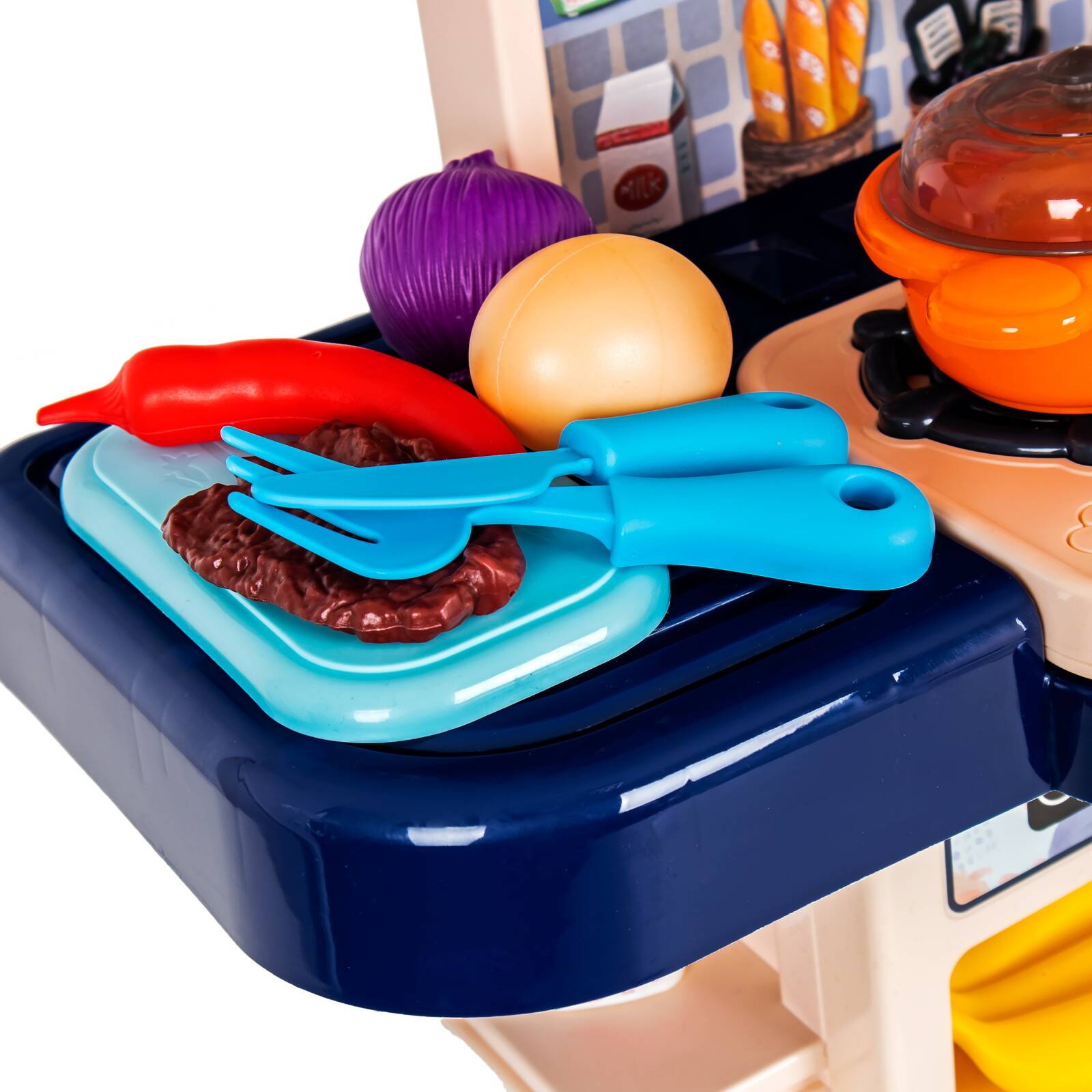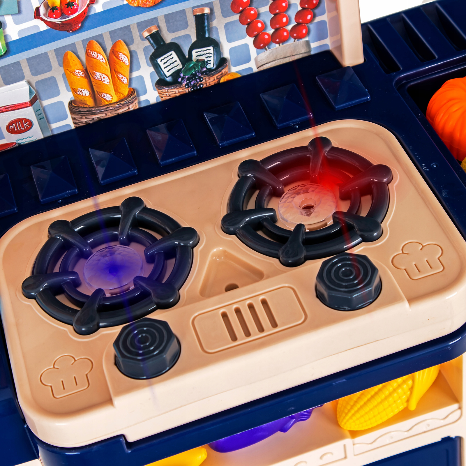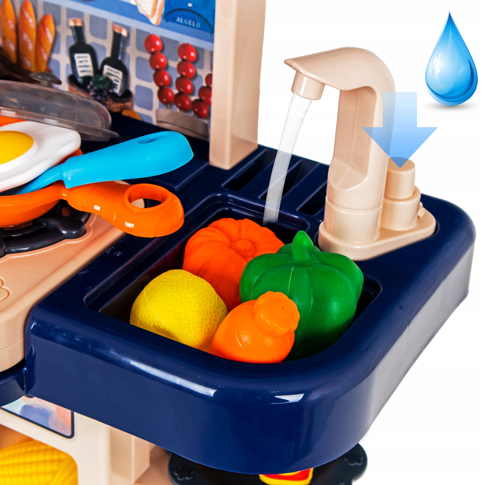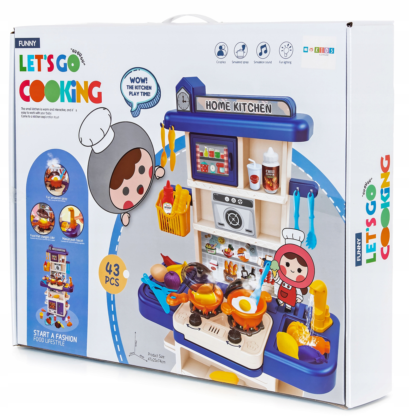 Kuchnia posiada prawdziwy kran z funkcją wody, co pozwala maluchowi na mycie warzyw, owoców i naczyń. Podczas gotowania na kuchence słychać autentyczne odgłosy gotowania i smażenia, a wydobywająca się para z jednego z palników sprawia, że zabawa nabiera realizmu. Dodatkowo, palniki kuchenki są podświetlane.
