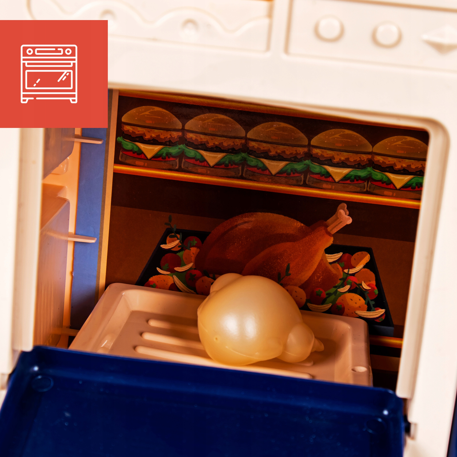 Wszystkie drzwi w kuchni, takie jak drzwi szafki, lodówki, piekarnika czy mikrofalówki są otwierane, dzięki czemu maluch ma miejsce na przechowywanie wszystkich elementów oraz pozwala to na interaktywną zabawę. Szeroka gama produktów spożywczych daje nieograniczone możliwości przyrządzania potraw.