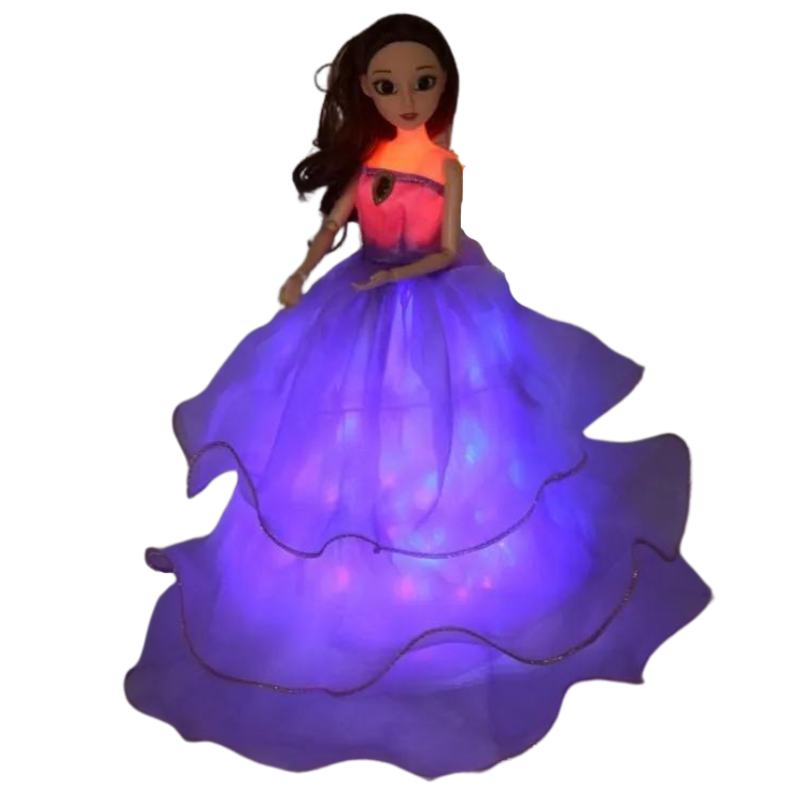 Zapraszamy do magicznego świata baśni z wyjątkową Lalką Księżniczką! Ta zachwycająca lalka jest ubrana w piękną fioletową sukienkę z falbankami, która nie tylko olśniewa swoim wyglądem, ale także świeci, dodając każdej chwili zabawy niesamowitego uroku.