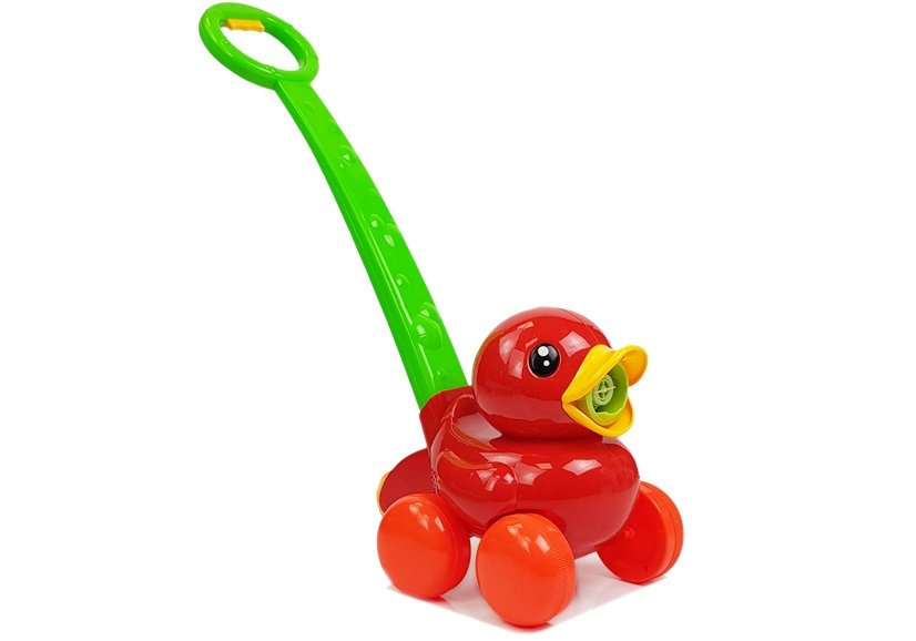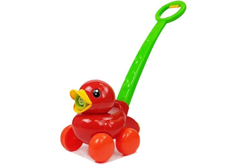 Robienie baniek mydlanych z użyciem prezentowanej maszyny jest bardzo prostym zajęciem. Po naciśnięciu na rączce przycisku Twój maluch usłyszy muzyczkę i odgłosy puszczania baniek. Zielona rączka ma długość 40 cm, dzięki czemu maluch będzie mógł swobodnie prowadzić kaczuszkę. Urozmaici każdy spacer i zabawę w ogrodzie. Pomoże dobrze rozwijać się Twojemu dziecku poprzez dotyk i słuch.