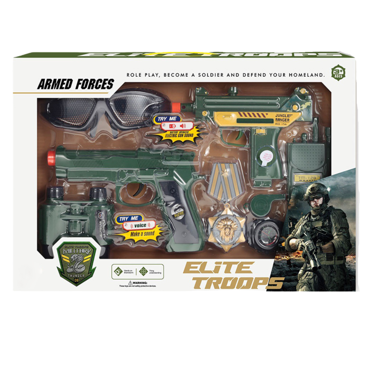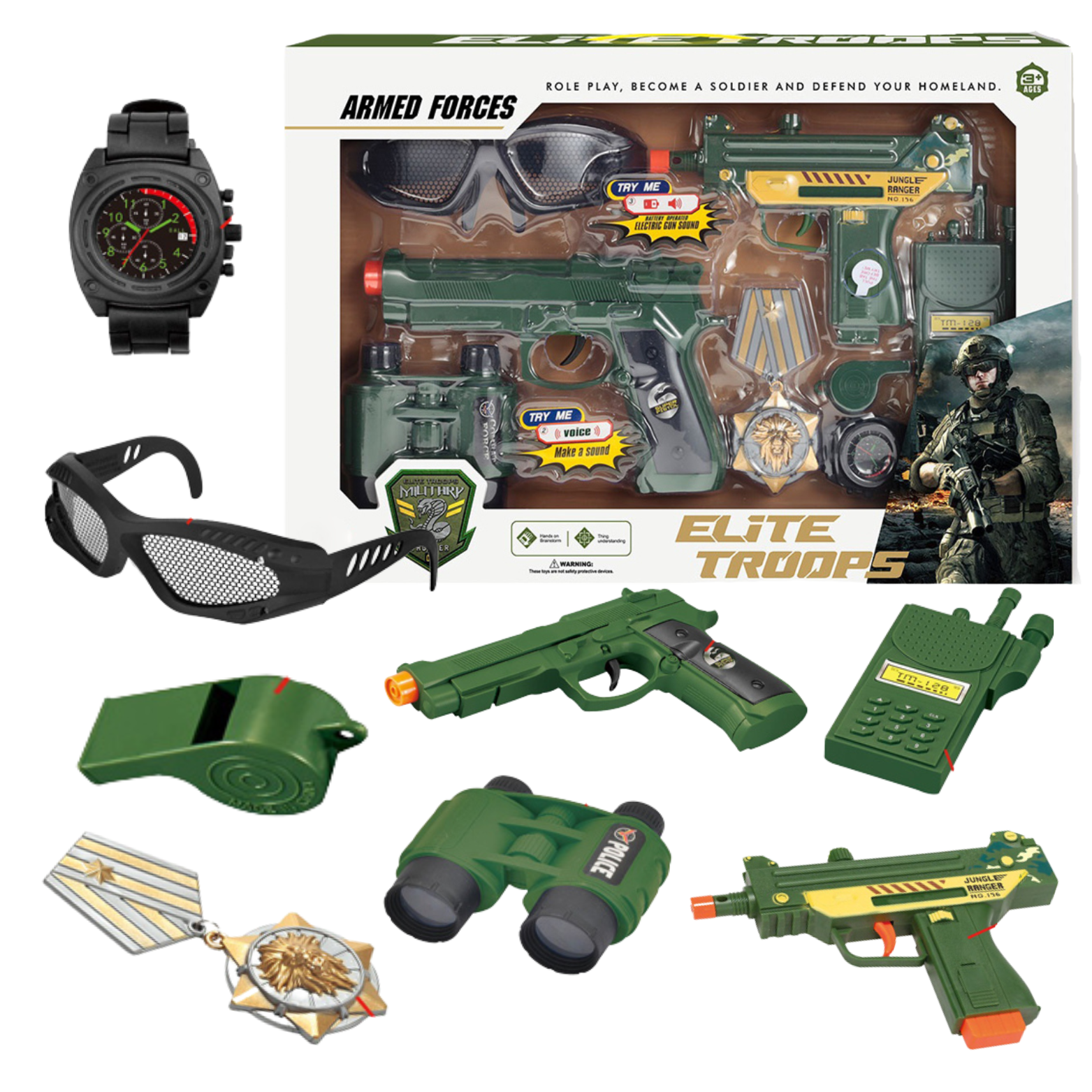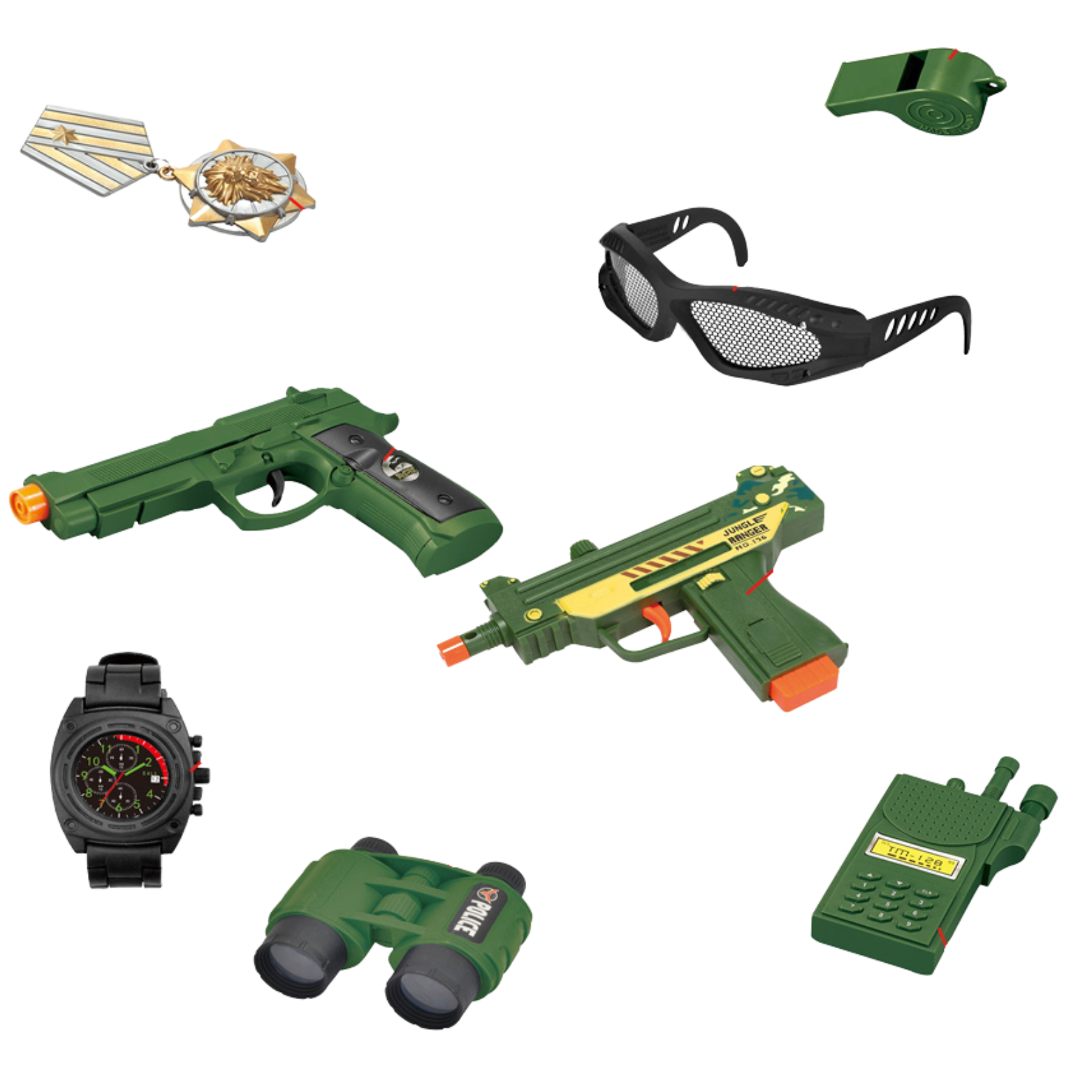 MEGA DUŻY ZESTAW WOJSKOWY OKULARY BROŃ PISTOLET LORNETKA PAS ZEGAREK RADIO