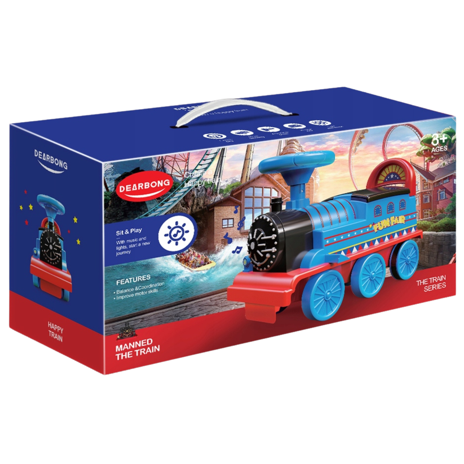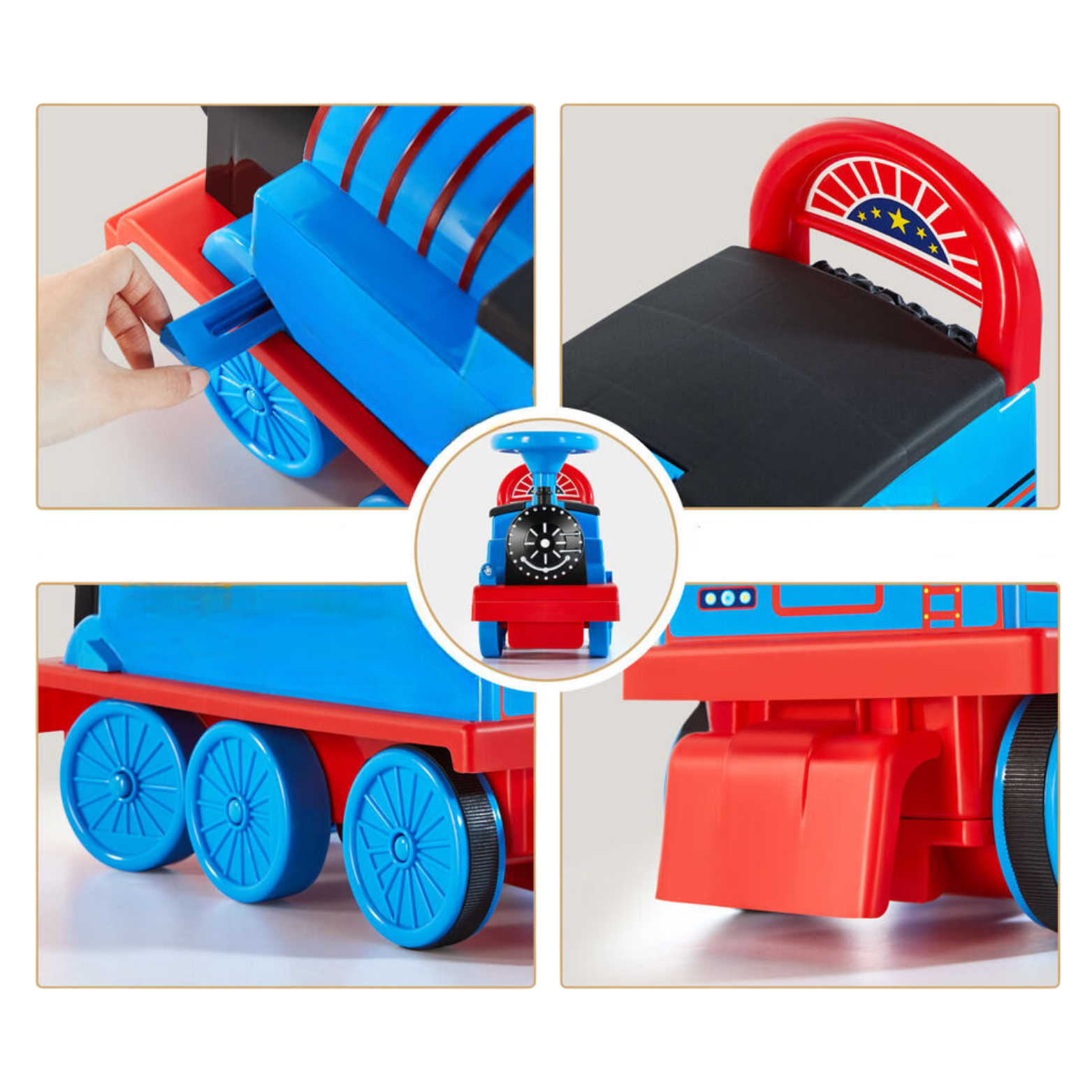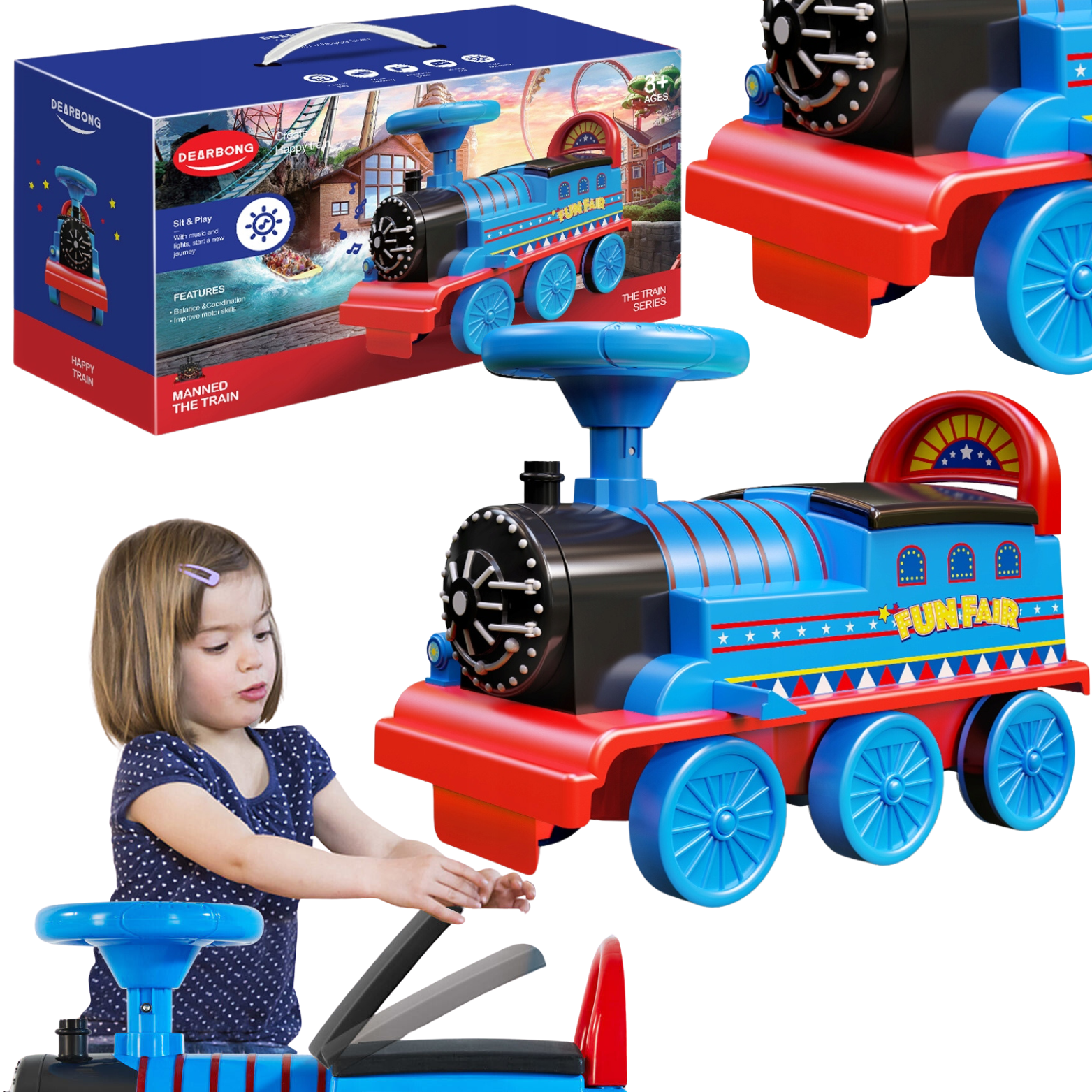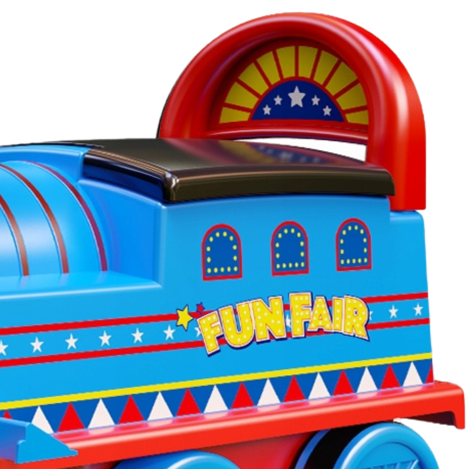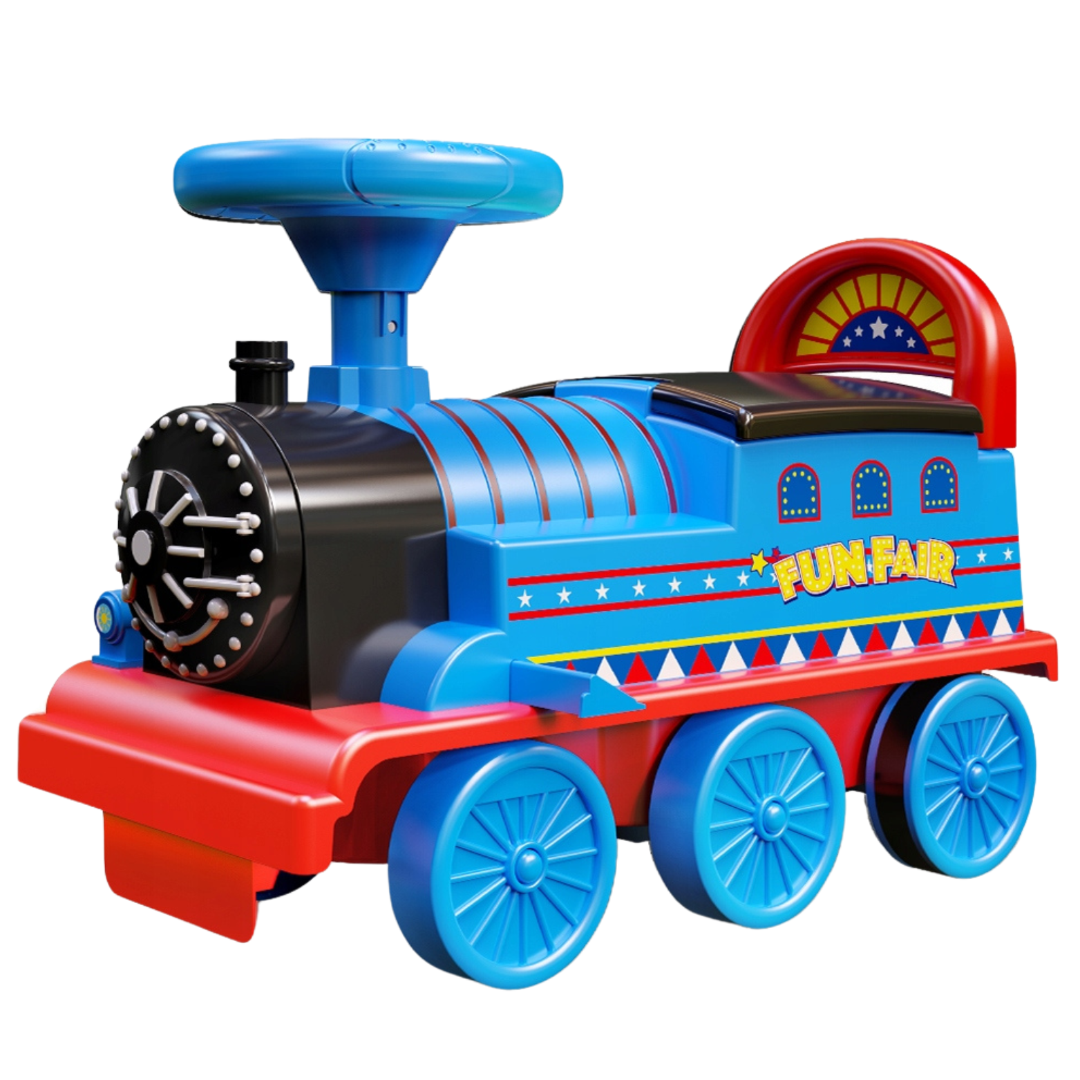 Jeździk i chodzik: Elektryczna lokomotywa pełni rolę zarówno chodzika, którym dziecko może poruszać się samodzielnie odpychając się nóżkami, jak i jeździka, który porusza się automatycznie. Tryb automatyczny zapewnia bezpieczną prędkość około 0,8-1,5 km/h. Zabawka może wozić dziecko nieprzerwanie przez 2 godziny po pełnym naładowaniu, co zapewnia długotrwałą zabawę. Dziecko może wygodnie prowadzić lokomotywę, używając jej także jako wsparcia podczas nauki chodzenia. Dzięki temu rodzajowi zabawy rozwijają się umiejętności motoryczne i koordynacja ruchowa dziecka.