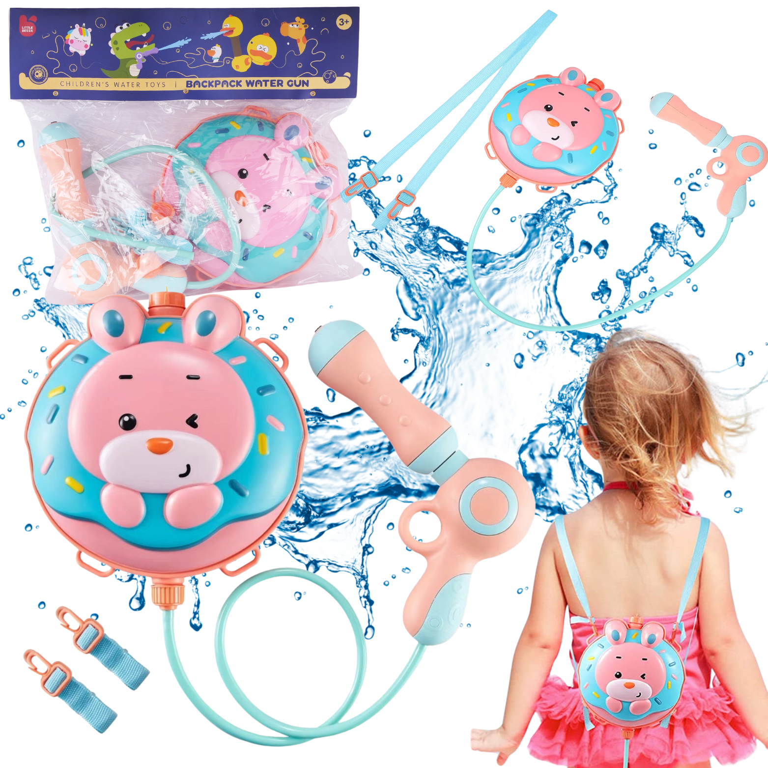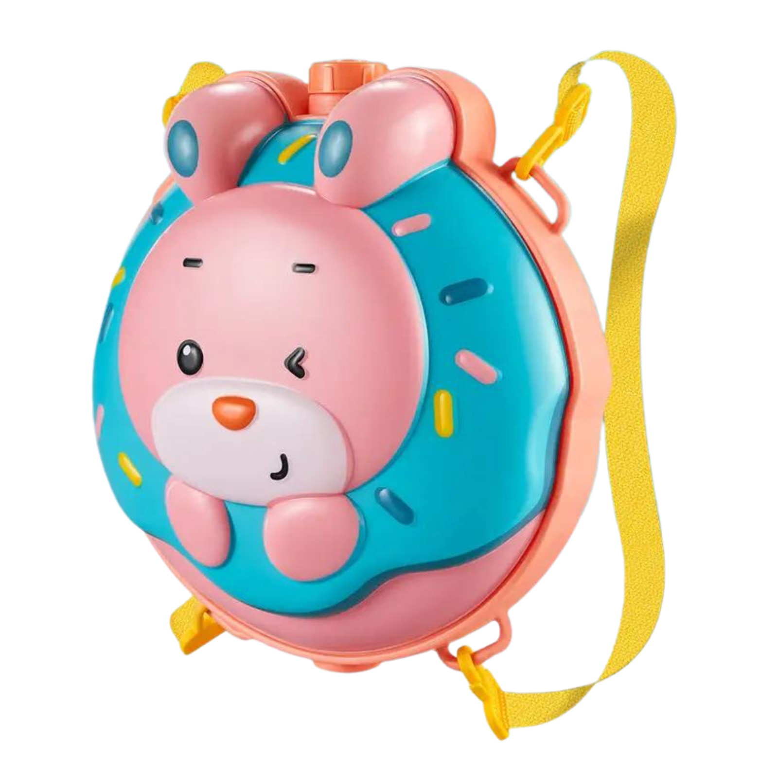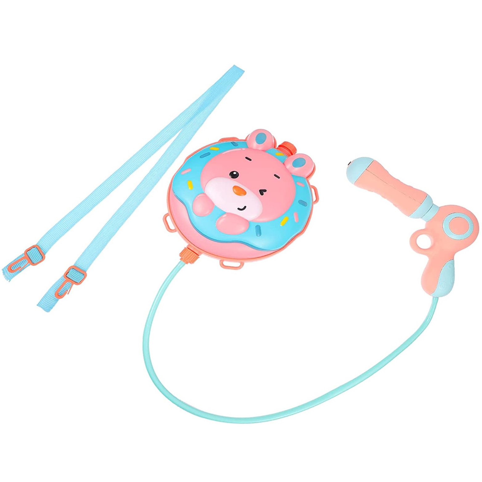 Atrakcyjny design: Uroczy motyw kreskówkowego królika z pączkiem dodaje przyjaznego klimatu całej zabawie. Jasne i żywe kolory, słodka grafika oraz precyzyjne detale sprawiają, że pistolet na wodę stanie się ulubioną zabawką każdego malucha oraz jego niezbędnym towarzyszem podczas upalnych dni.