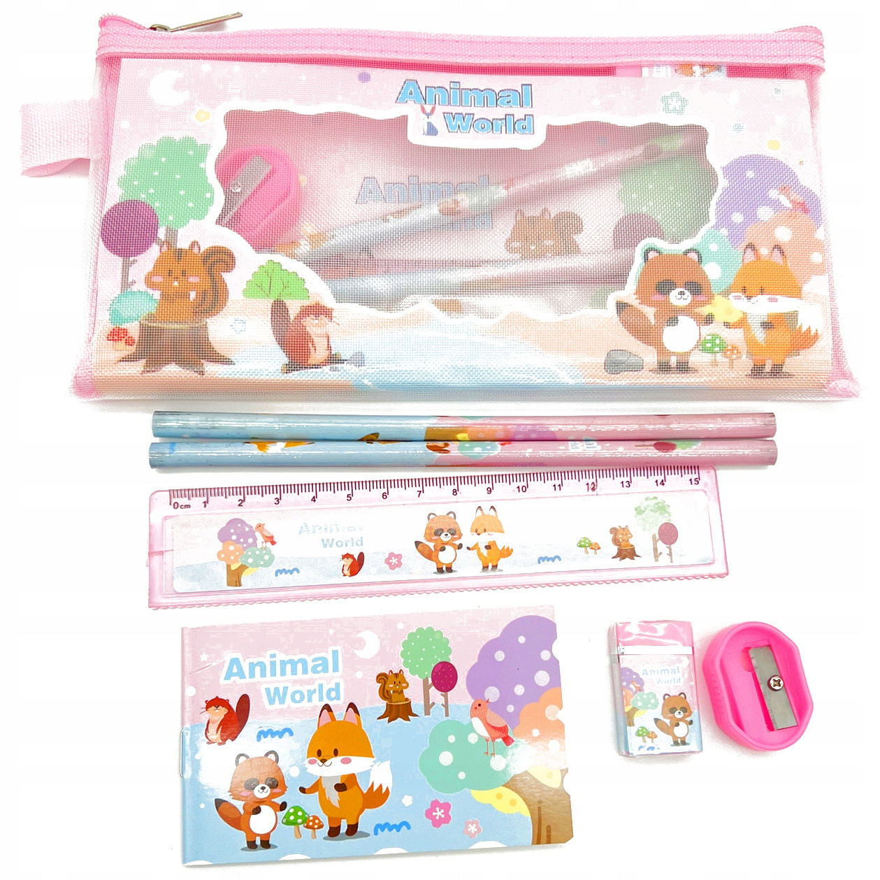 PRZYBORY SZKOLNE ZWIERZĘTA ZESTAW LINIJKA OŁÓWEK GUMKA PIÓRNIK DLA DZIECI