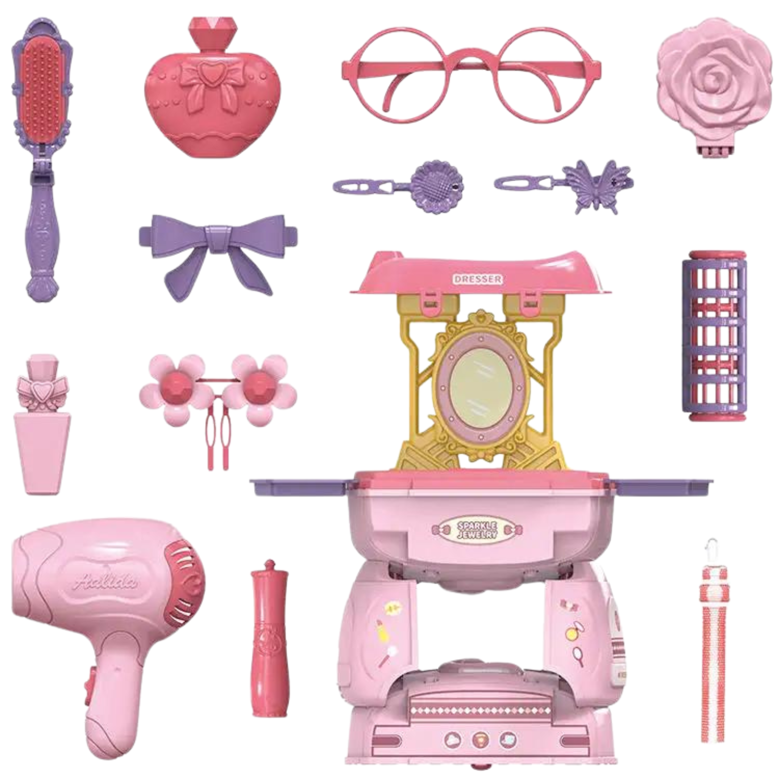 Toaletka wyposażona jest również w suszarkę do włosów, szminkę, perfumy, szczotkę do włosów, okulary, spinki, wałek do włosów oraz dodatkowe akcesoria. Zestaw zawiera wszystko, by zapewnić wspaniałą zabawę dla młodej damy.