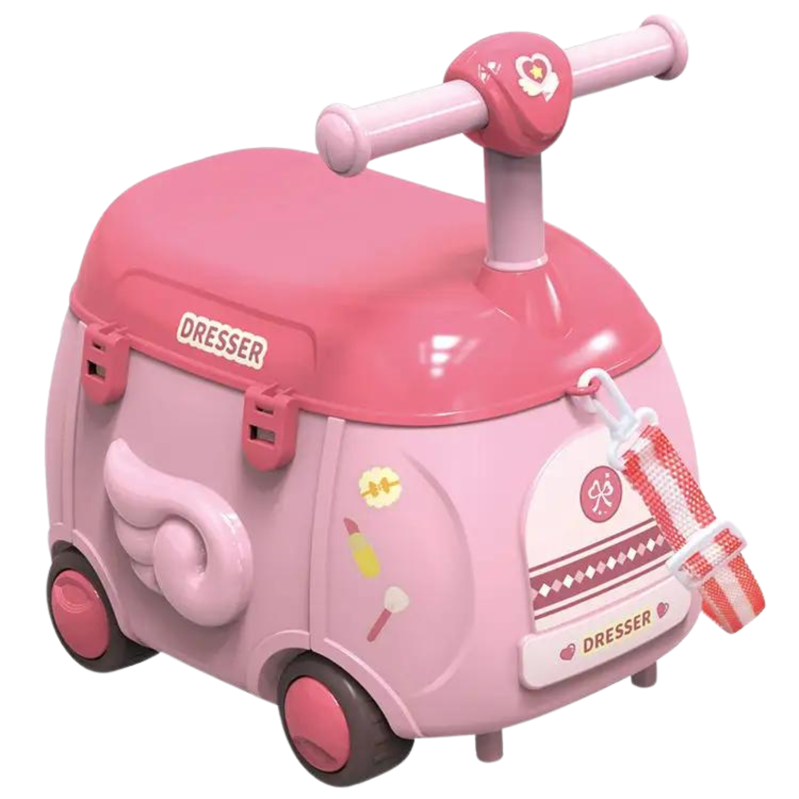 Jeśli dziecko zapragnie trochę ruchu, ta toaletka również na to znajdzie sposób. Po przyłączeniu do walizki kierownicy, zamienia się ona w jeździk, na którym dziecko może się przemieszczać! Dzięki tej zabawce dziecko może zadbać nie tylko o swój wygląd, ale również o ruch.