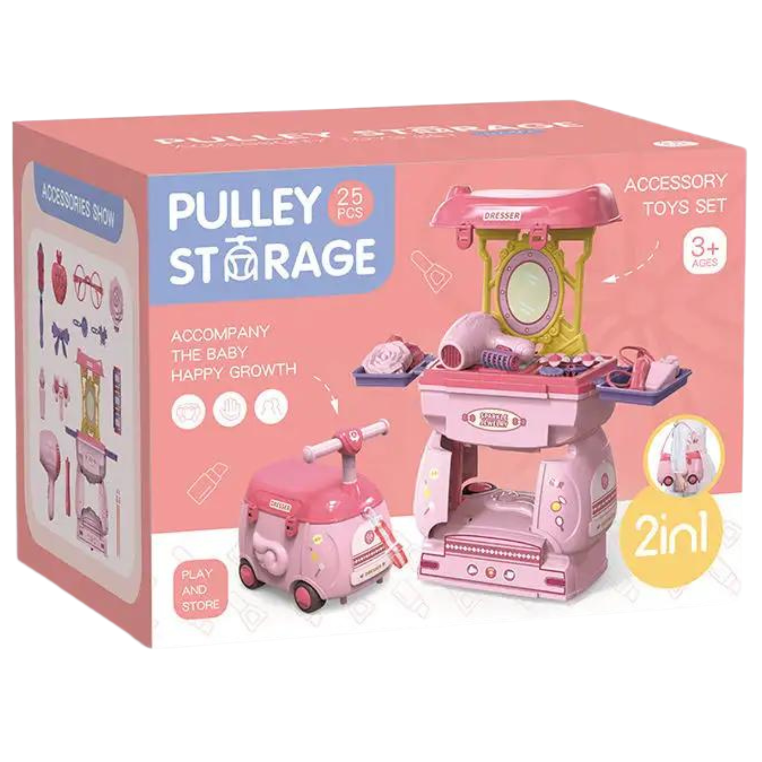 Zestaw toaletka, jeździk, walizka posiada najpotrzebniejsze rzeczy do stylizacji. Dziewczynka może poczuć się jak dorosła kobieta mając swój kącik piękności. Toaletka zwiera lusterko, w którym dziecko może się przeglądać podczas zabawy we fryzjerkę, kosmetyczkę lub mamę szykującą się do pracy.