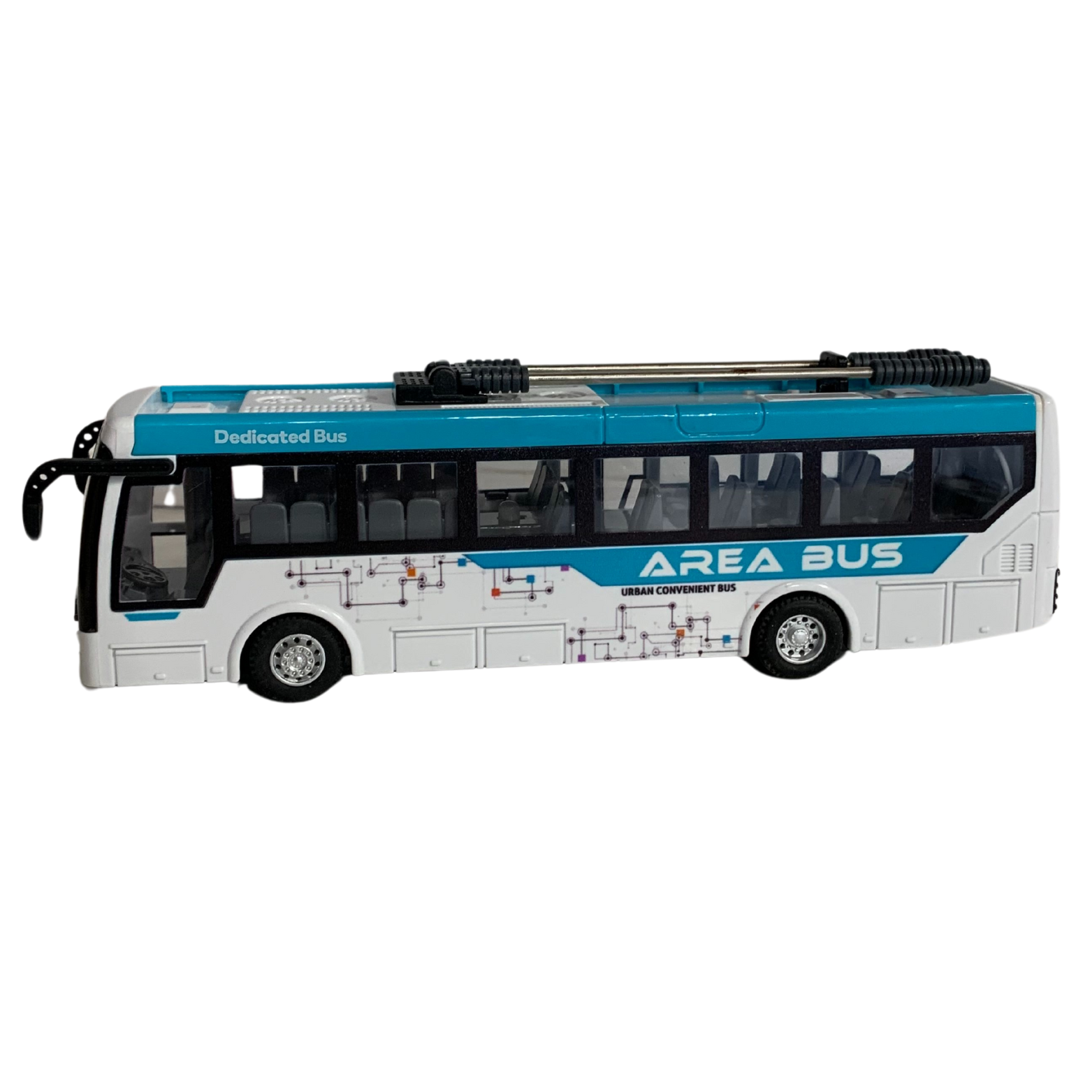 Zabawka wyposażona została w gumowane koła, które zapewniają płynne i ciche poruszanie się po różnorodnych powierzchniach. Dzięki temu trolejbus może jeździć zarówno po wykładzinie w pokoju, jak i po chodniku na zewnątrz.