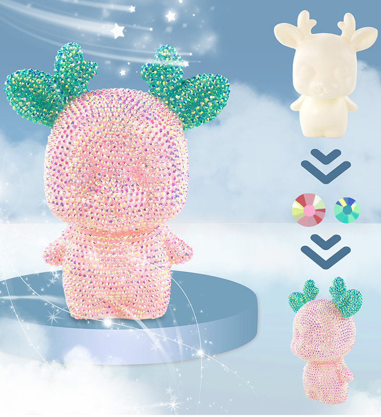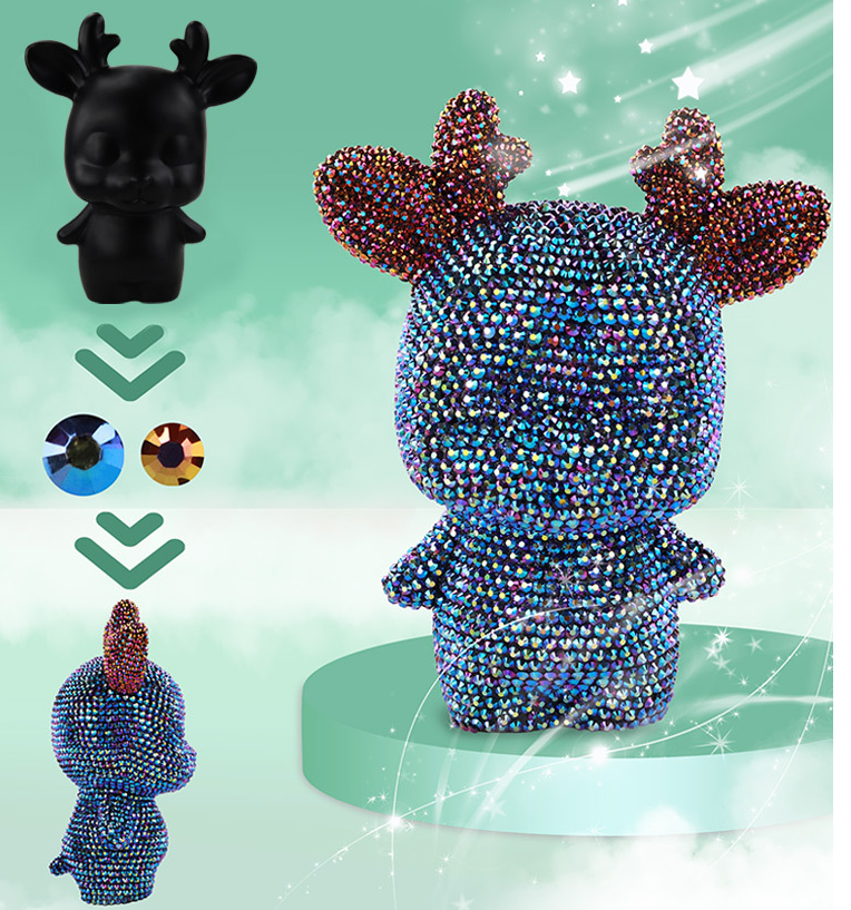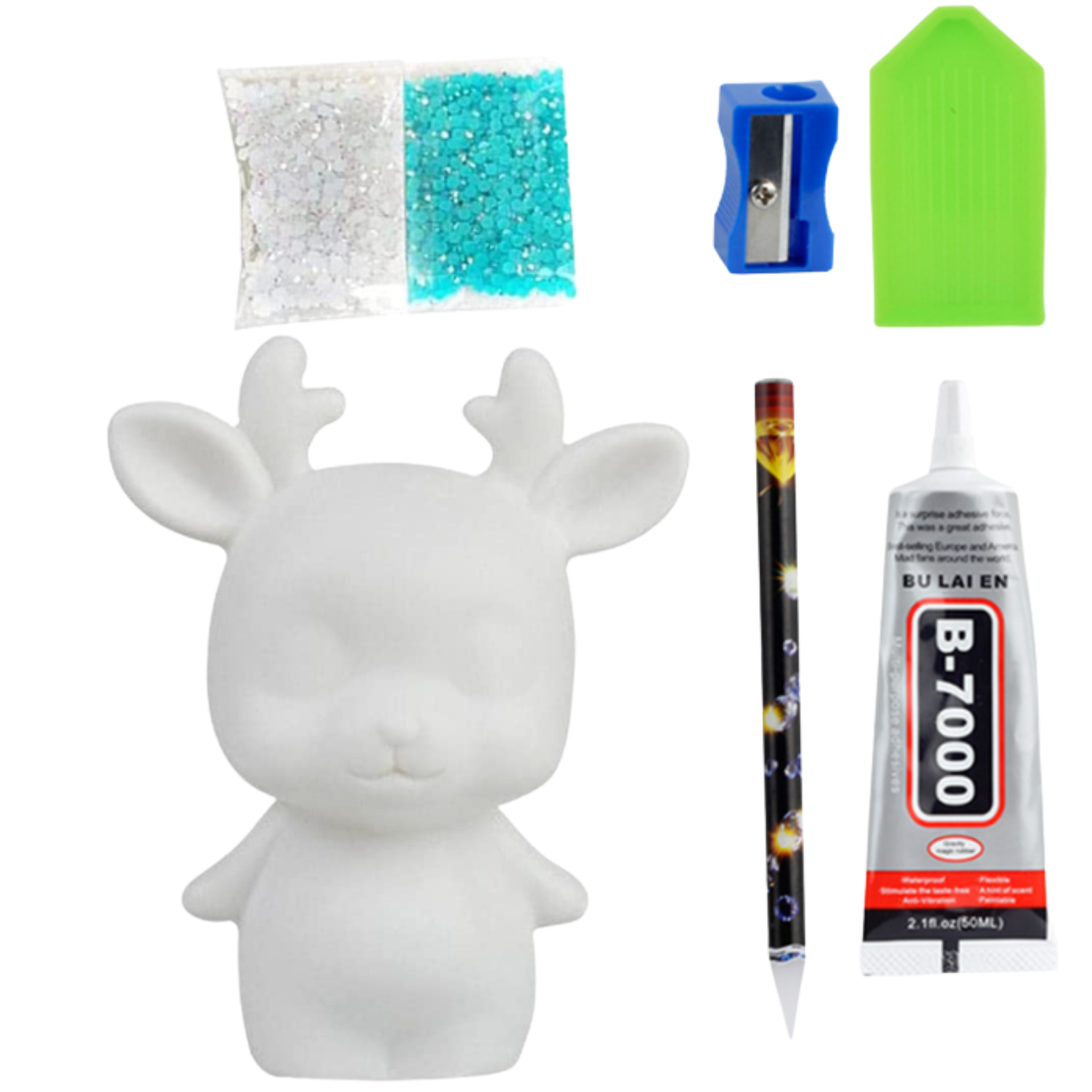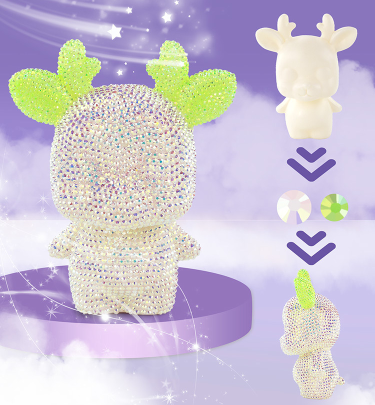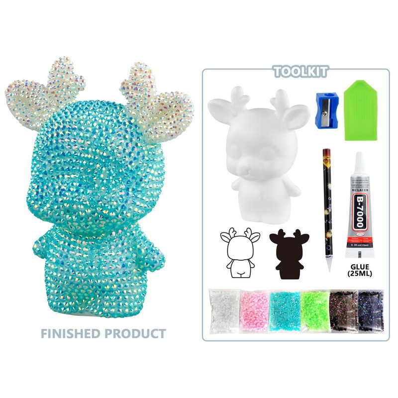 W zestawie znajduje się figurka jelonka, która stanowi bazę do wyklejania kryształkami.