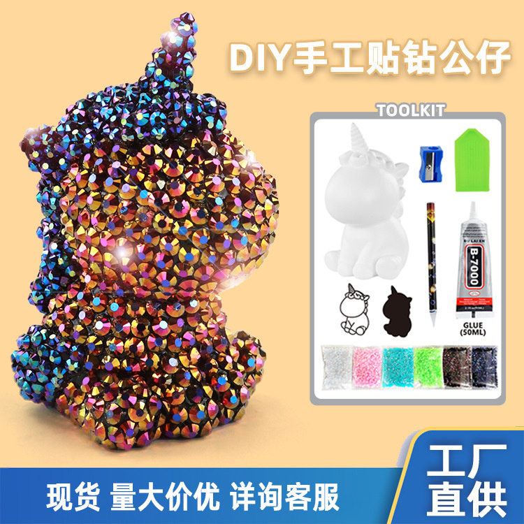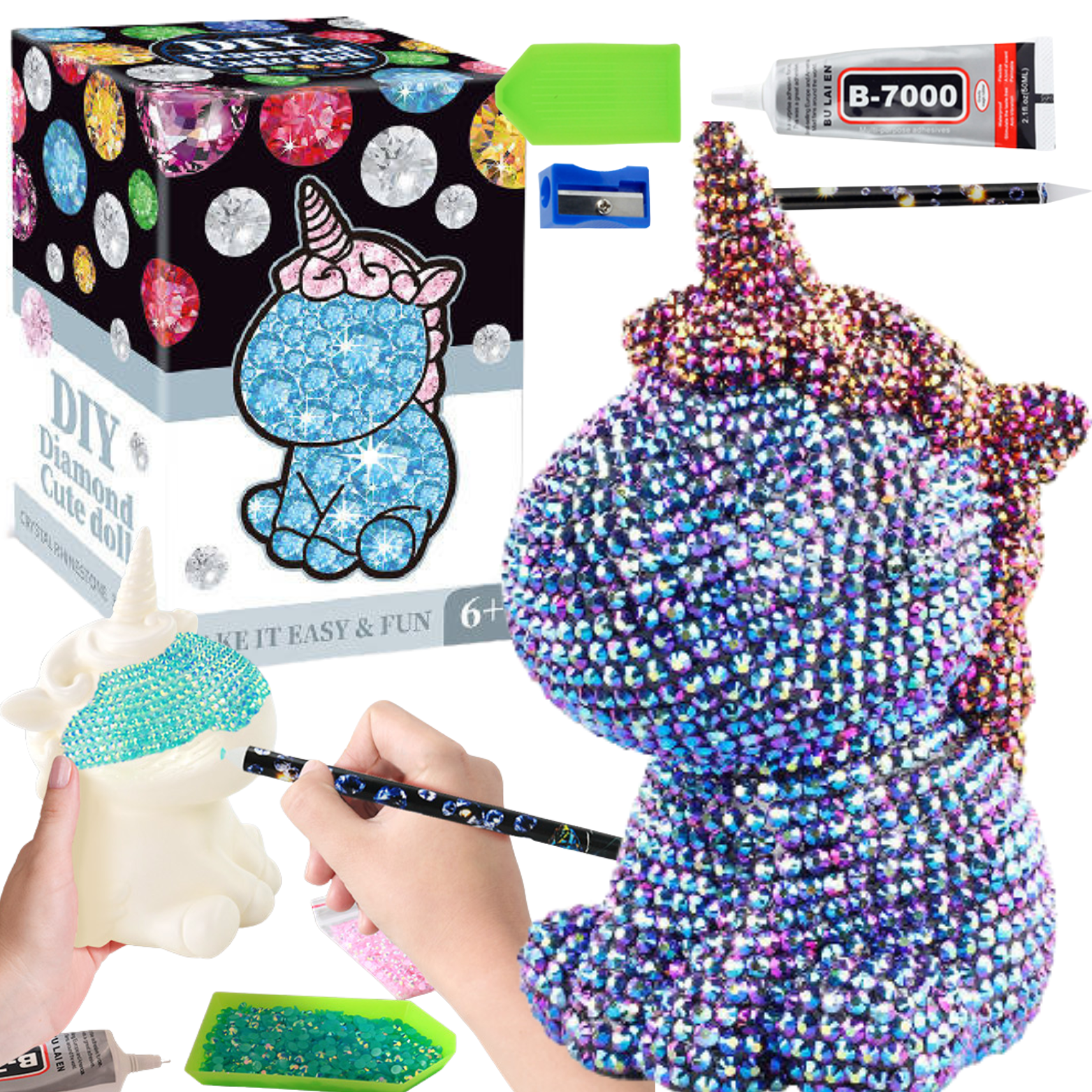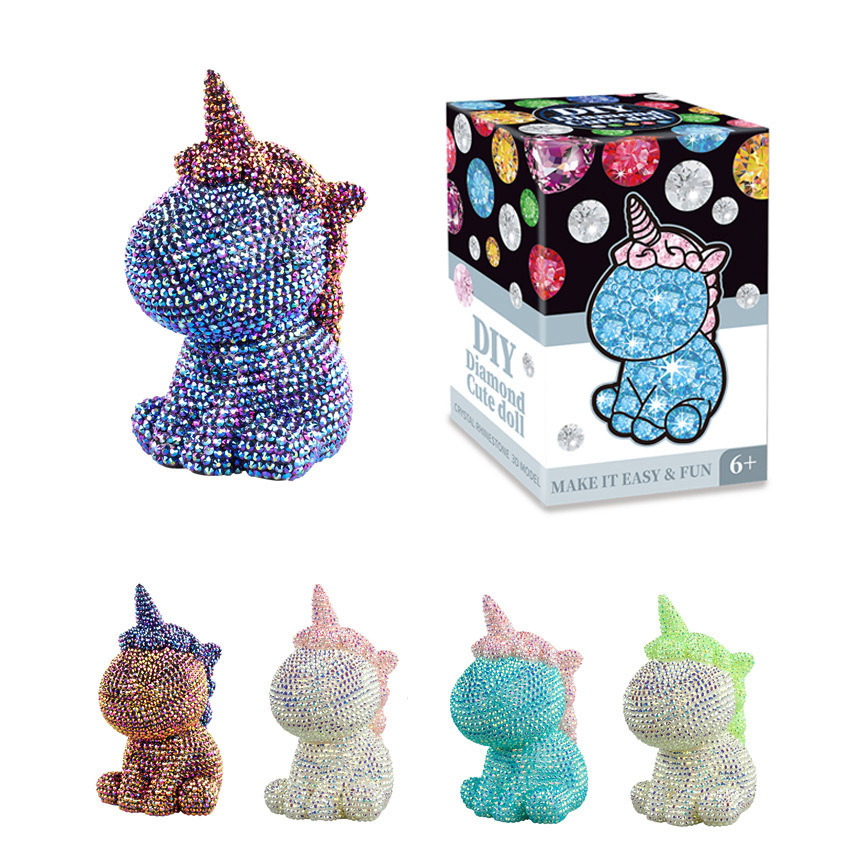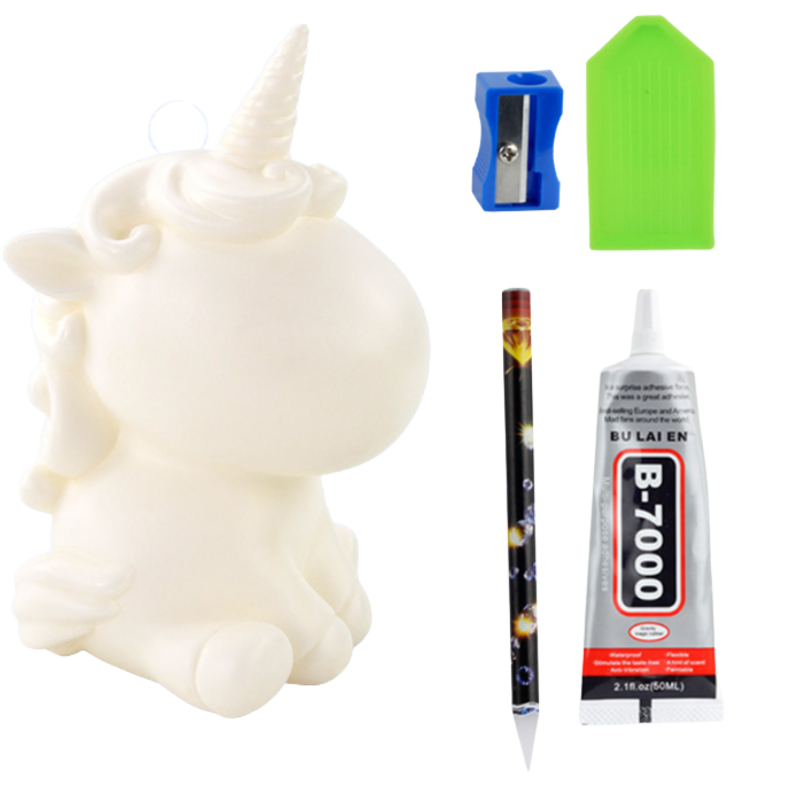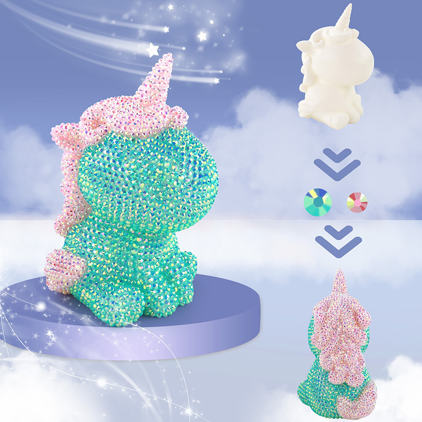 W zestawie znajduje się figurka jednorożca, która stanowi bazę do wyklejania kryształkami.