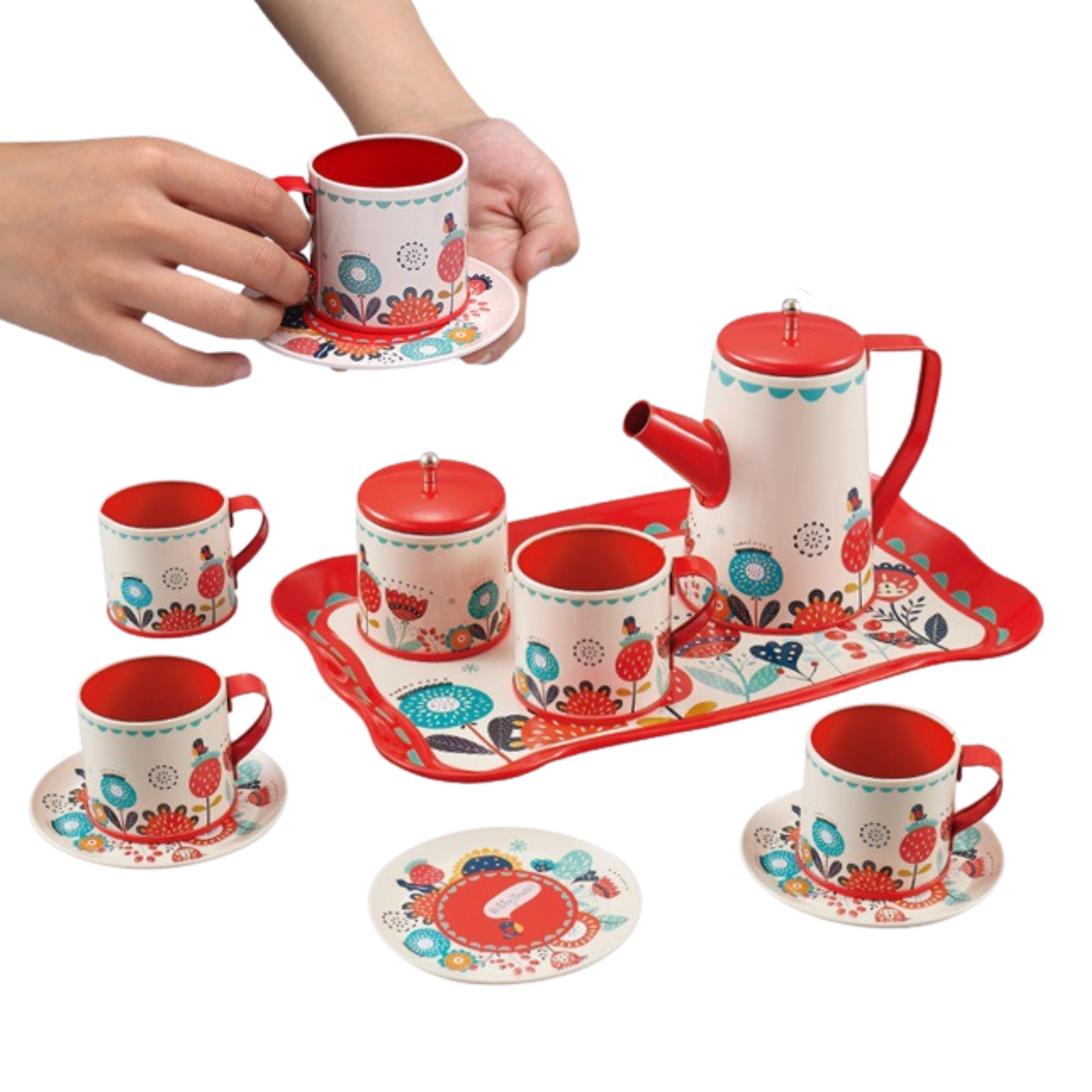 Zestaw jest wyposażony w uroczą tackę, na której można prezentować przygotowane napoje i przekąski. Tacka dodaje elegancji i autentyczności zabawie, a jednocześnie pomaga dzieciom w organizacji ich herbatkowych spotkań.