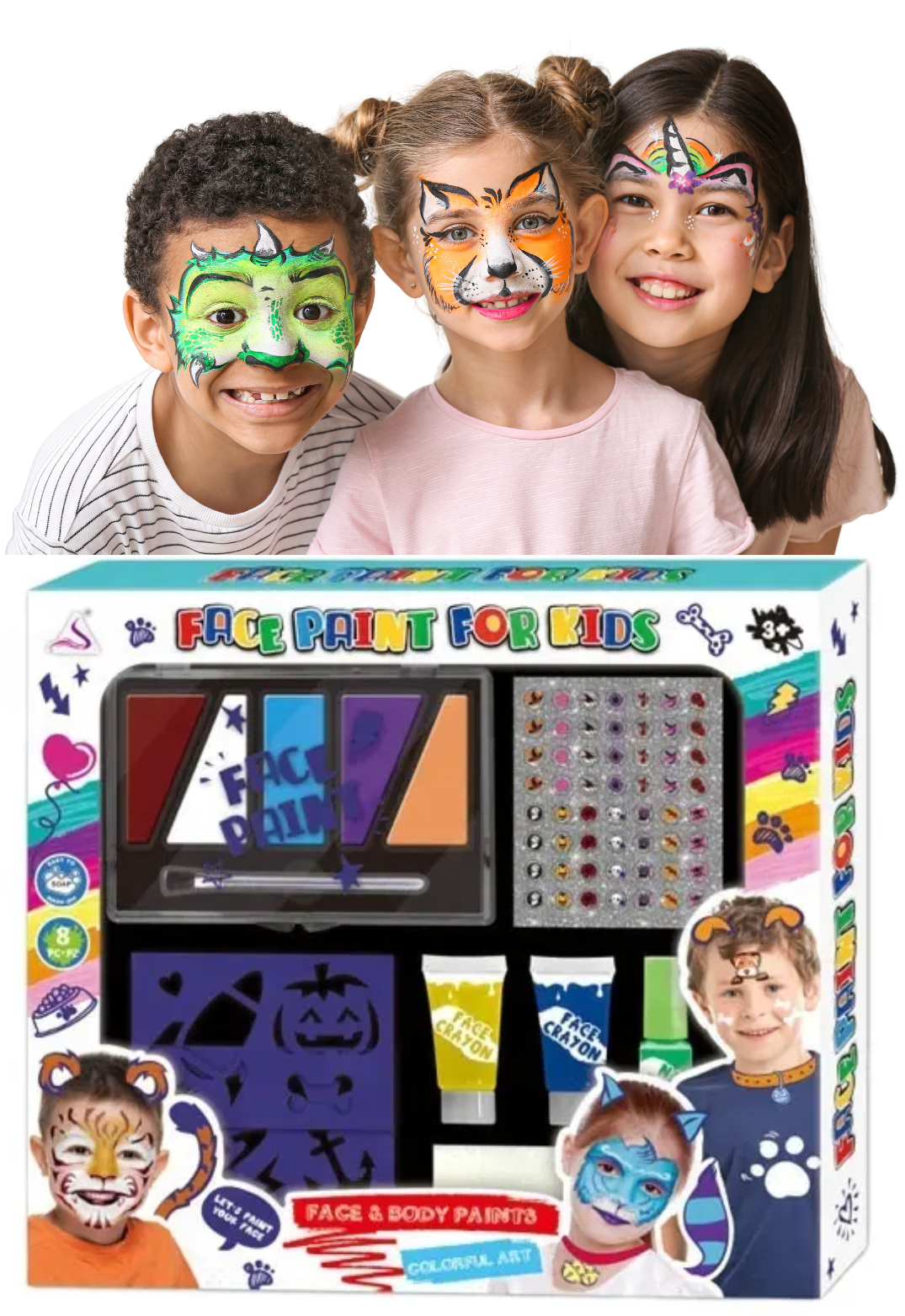Łatwe w użyciu: Ten zestaw został zaprojektowany tak, aby był łatwy w użyciu dla dzieci. Farby są bezpieczne dla skóry i można je łatwo nakładać za pomocą pędzelka .