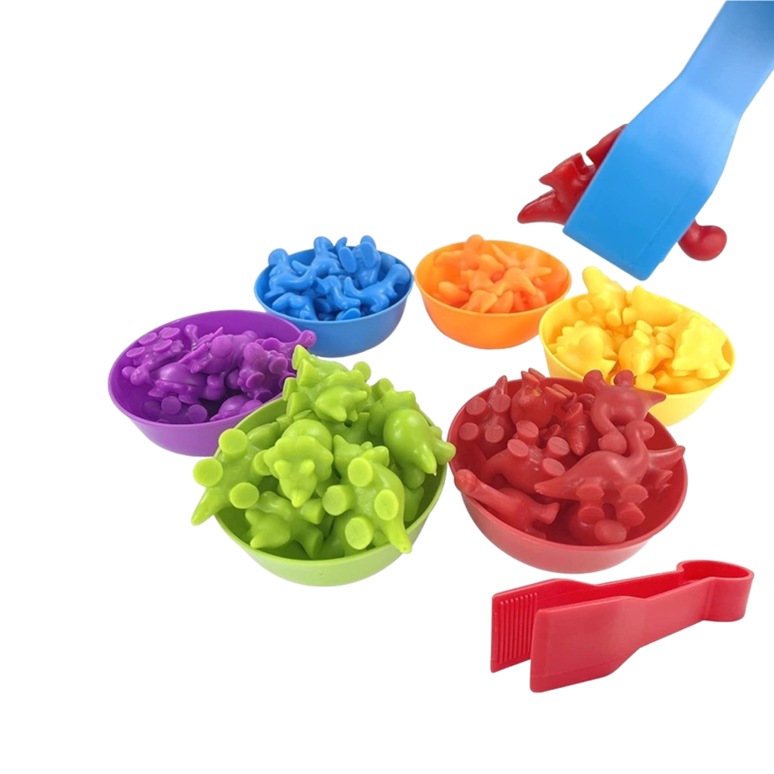 Zestaw zawiera figurki dinozaurów, które można sortować według liczby lub innego kryterium, rozwijając zdolności matematyczne i logiczne myślenie. Kolorowe miseczki oraz różnorodność dinozaurów zachęcają dzieci do rozpoznawania i porównywania kolorów.