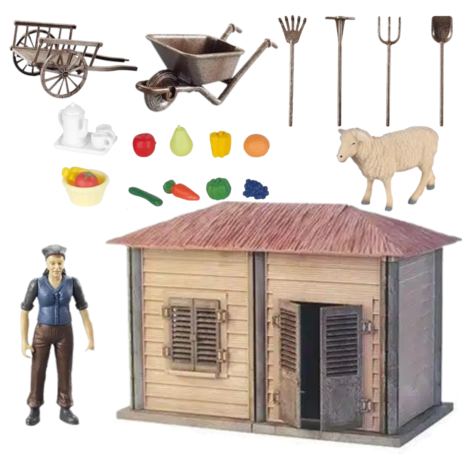 ZESTAW FARMA DOMEK Z GOSPODYNIĄ OWIECZKĄ NARZĘDZIAMI TACZKI WÓZEK OWOCE