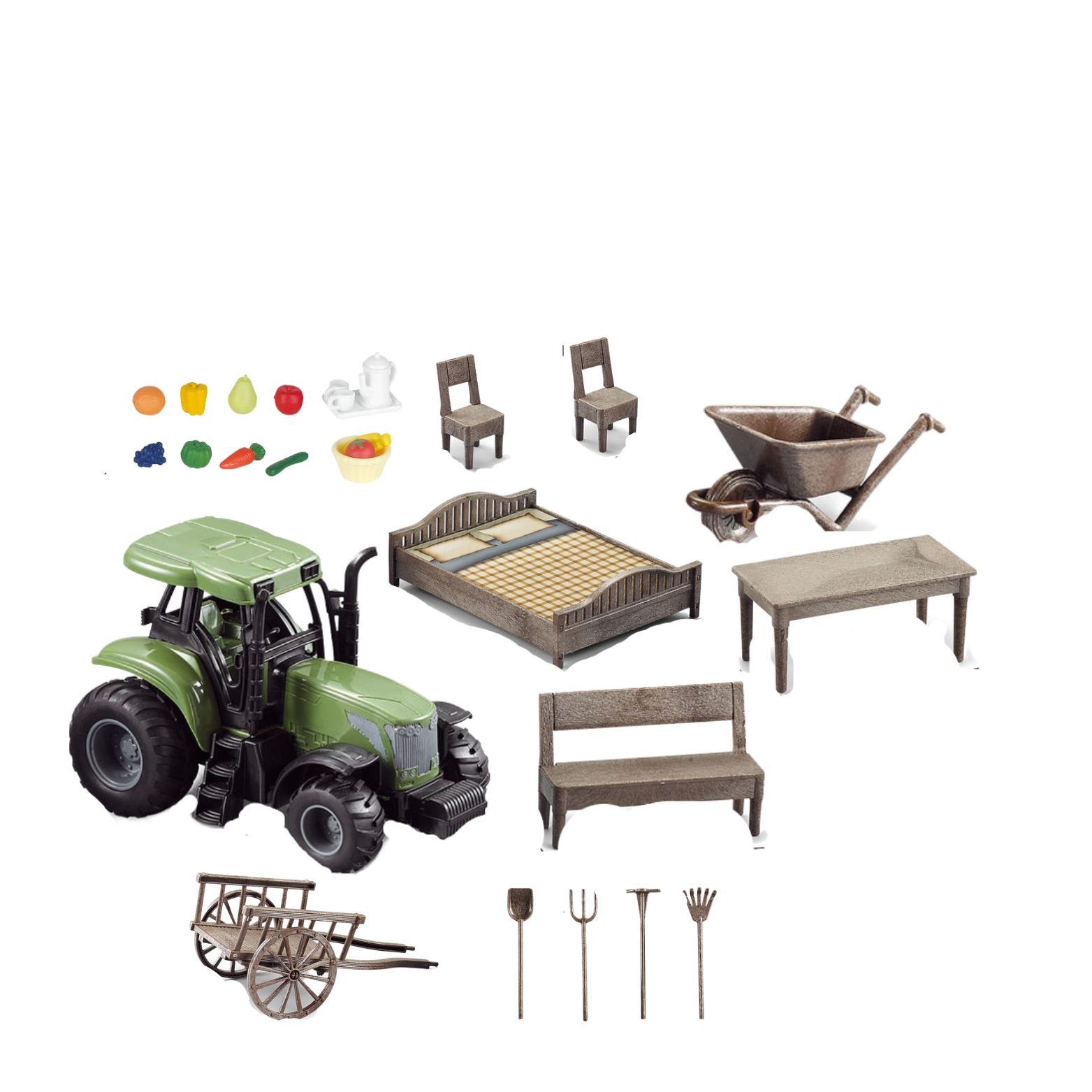 Traktor to niezbędny sprzęt na farmie. Dziecko może nim przewozić zwierzęta, przyczepiać wózek budowalny i wykonywać różne prace rolnicze. Zestaw zawiera narzędzia rolnicze, takie jak łopata, widły i grabie. Dzięki nim można pomóc w pracach na farmie i utrzymać ją w doskonałym stanie. Oprócz tego na farmie znajdują się taczki, wózek.
