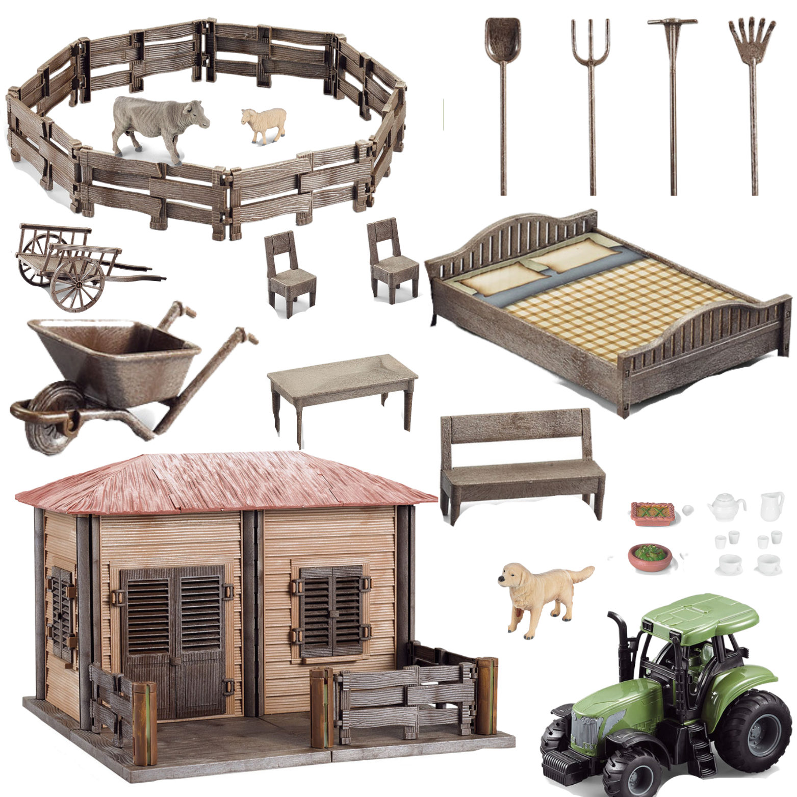 Traktor to niezbędny sprzęt na farmie. Dziecko może nim przewozić zwierzęta, przyczepiać wózek budowalny i wykonywać różne prace rolnicze. Zestaw zawiera narzędzia rolnicze, takie jak łopata, widły i grabie. Dzięki nim można pomóc w pracach na farmie i utrzymać ją w doskonałym stanie. Oprócz tego na farmie znajdują się taczki, wózek.