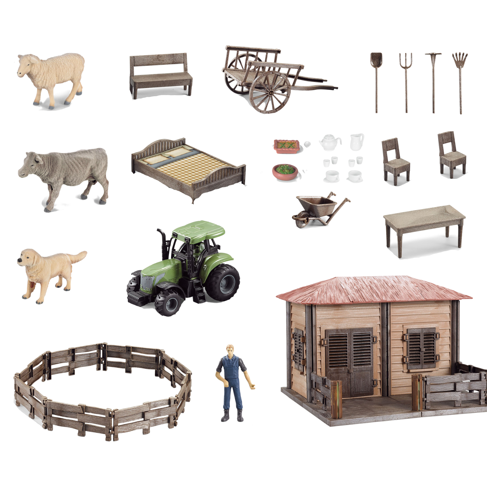 Trzy figurki różnych zwierząt można karmić, zabawiać i troszczyć się o nie. Nie zabraknie kompletu do herbaty, do przyjmowania gości! Ponadto w zestawie znajdują się meble do domku rolnika, takie jak łóżko, krzesła, ławka i stół, a także akcesoria kuchenne, takie jak talerze, kubki i dzbanek.
