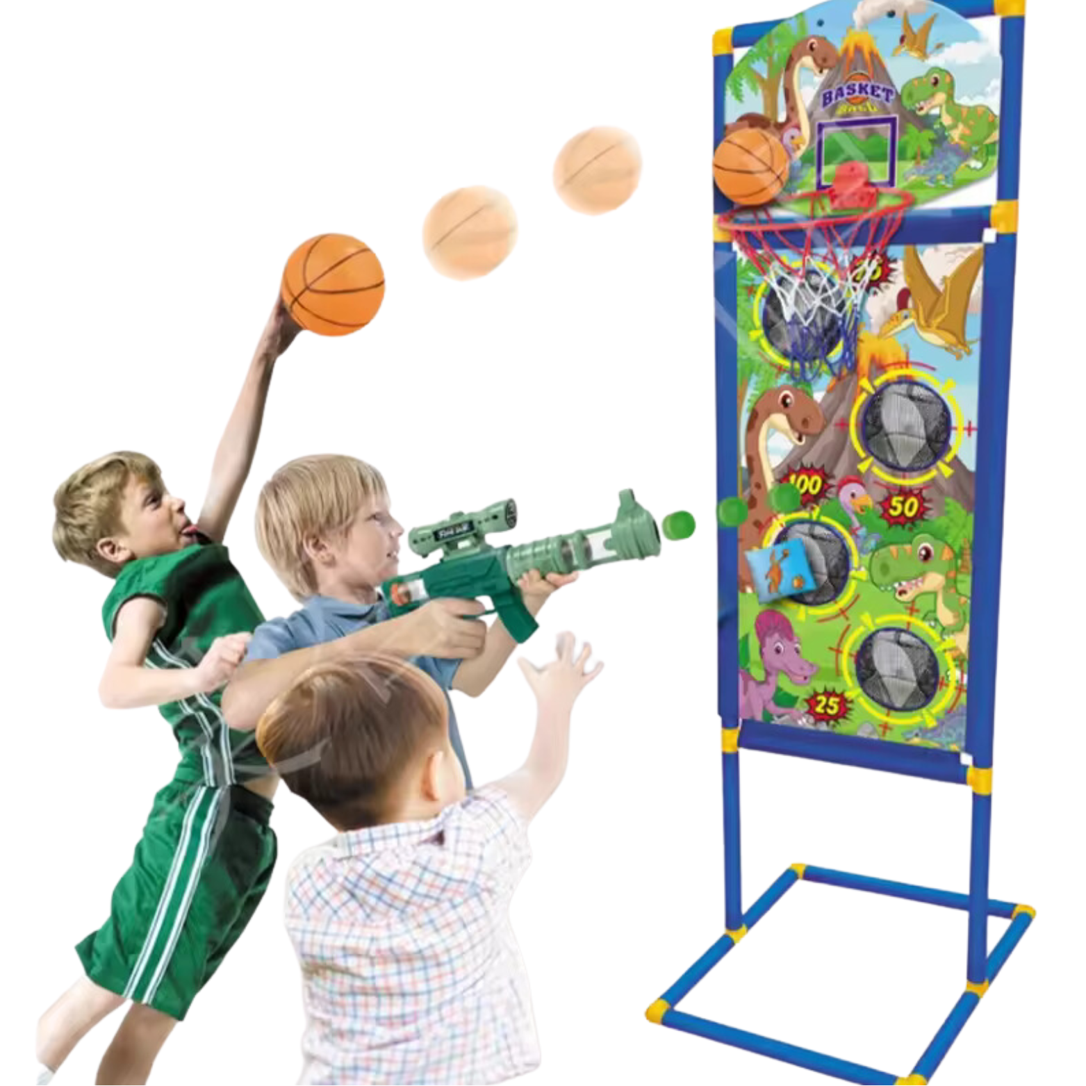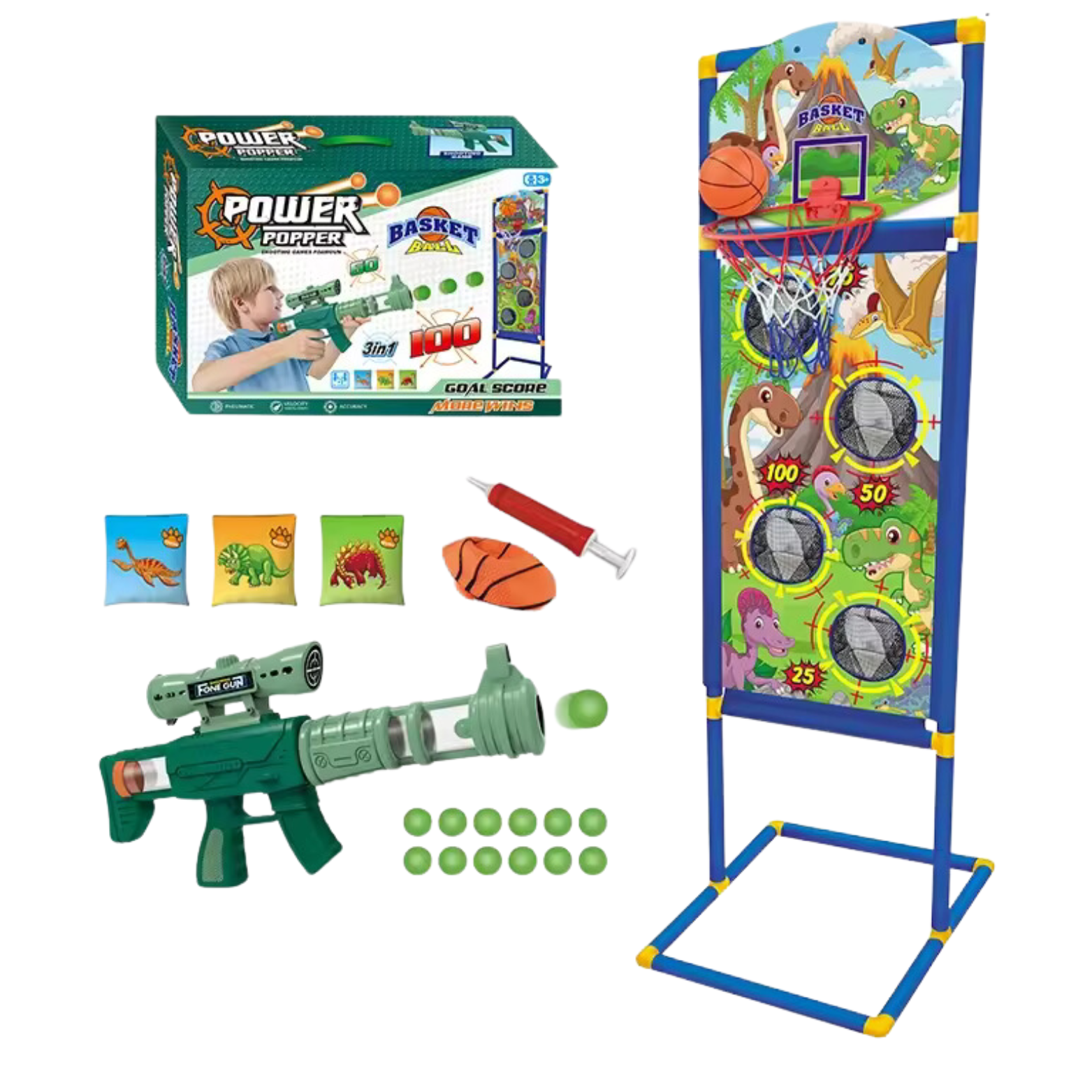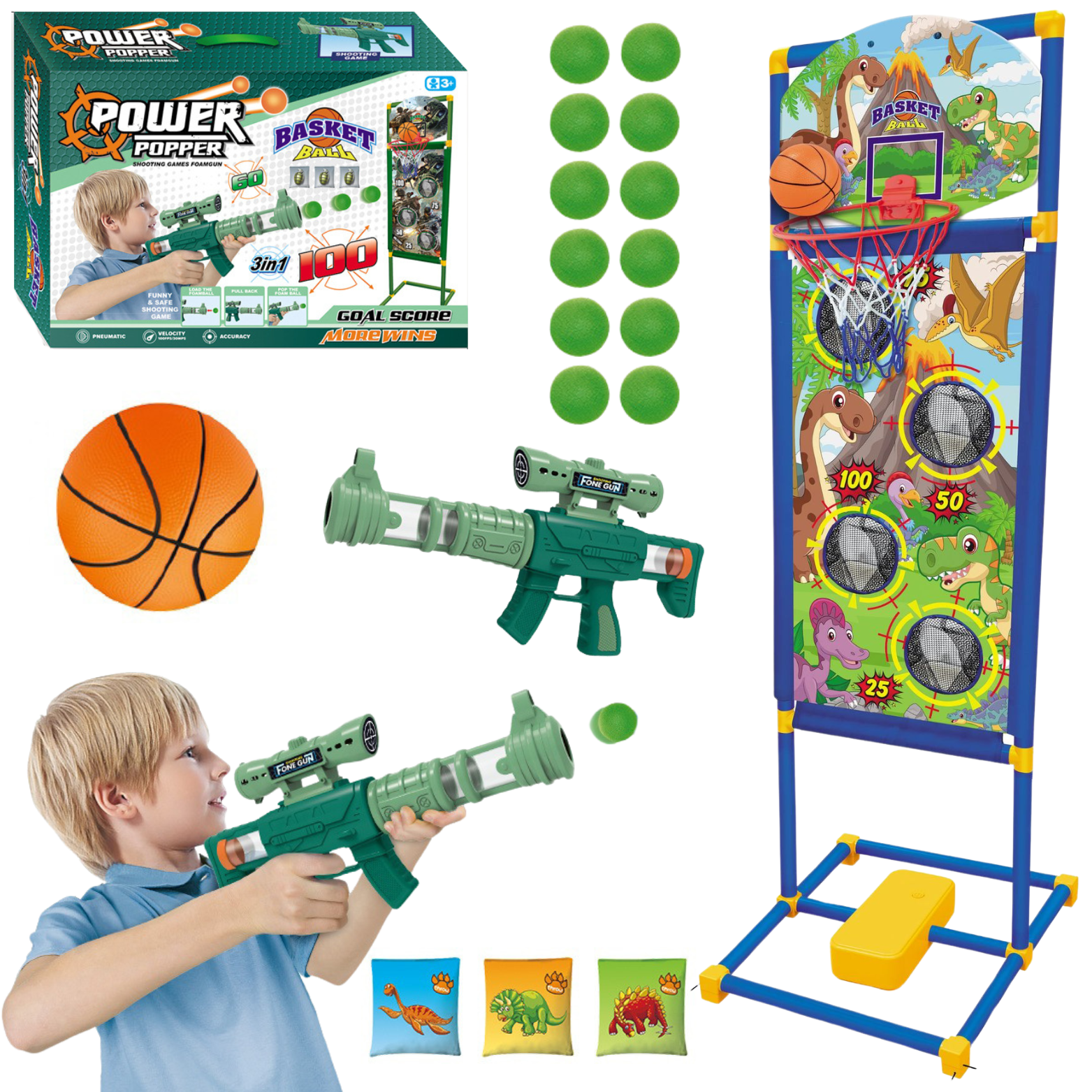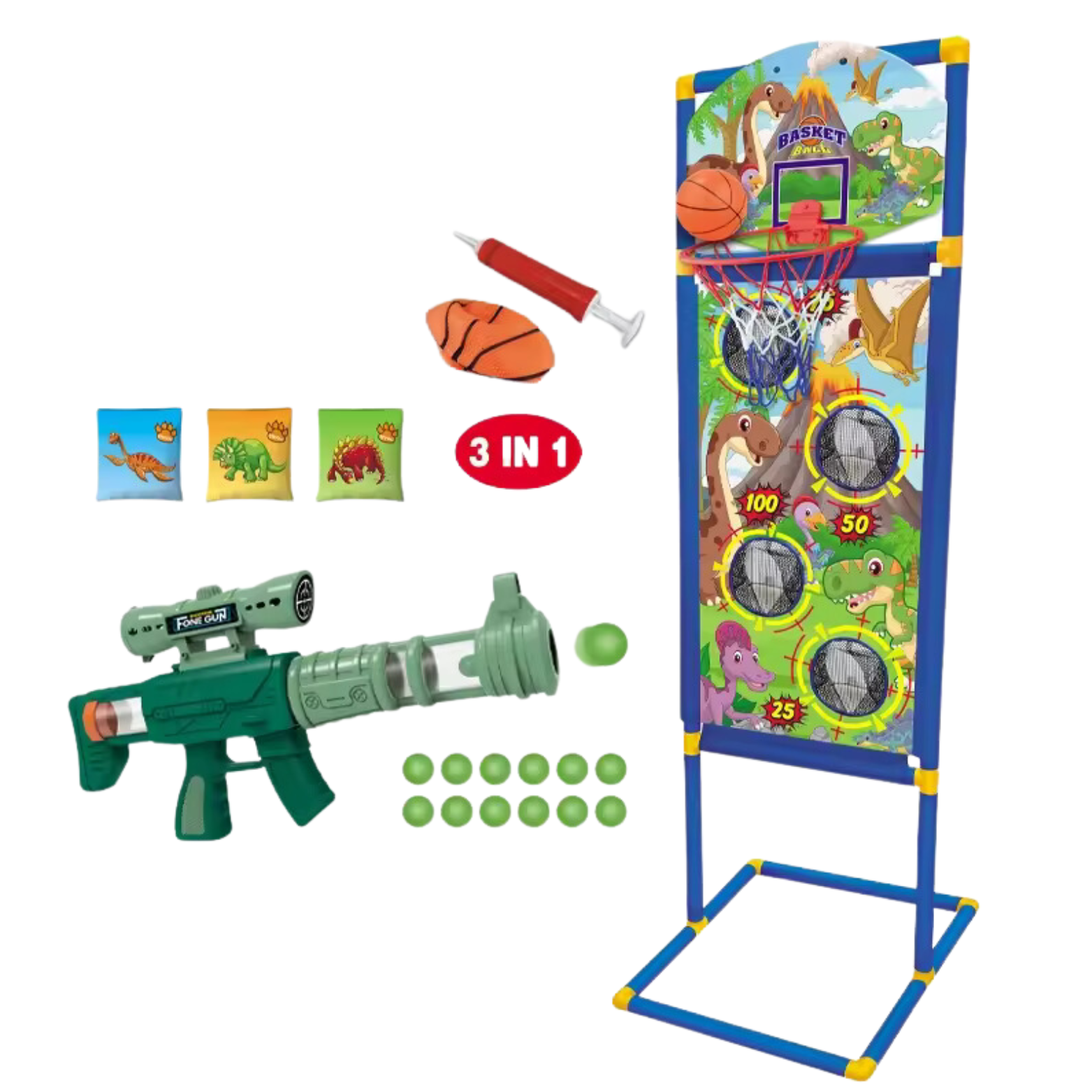Zestaw Gier 3w1 Stojak Koszykówka Rzucanie Woreczkami Strzelanie Pistoletem
