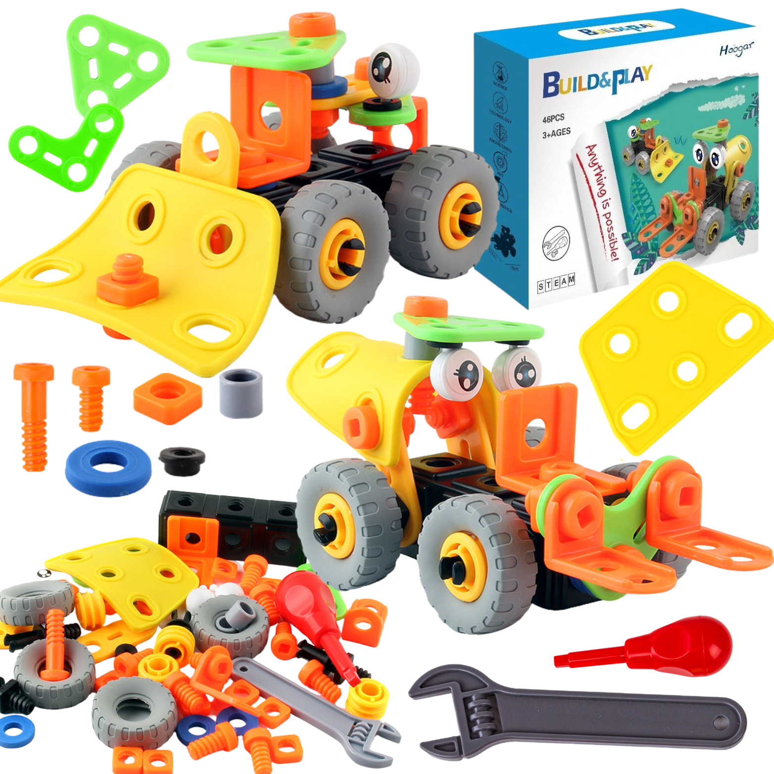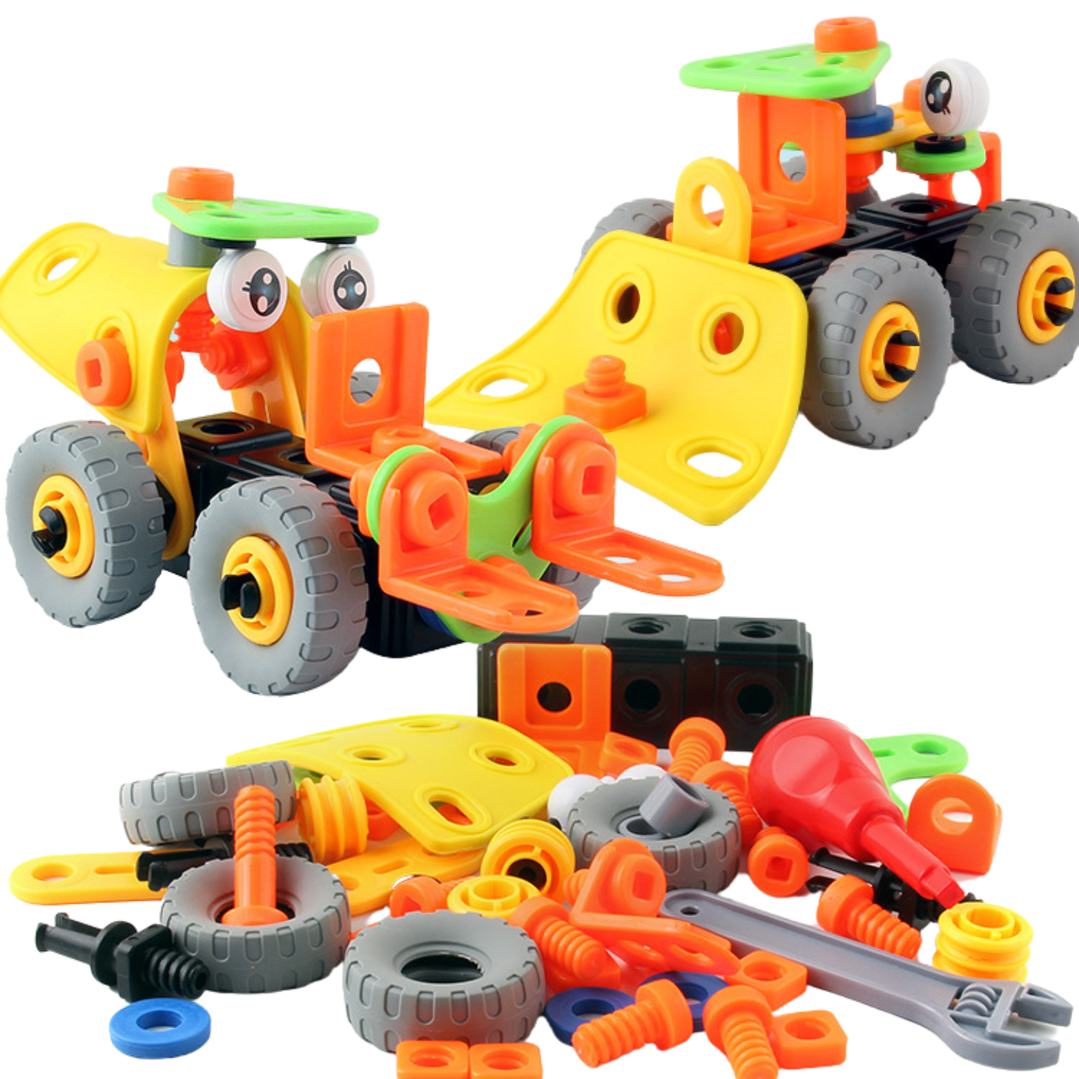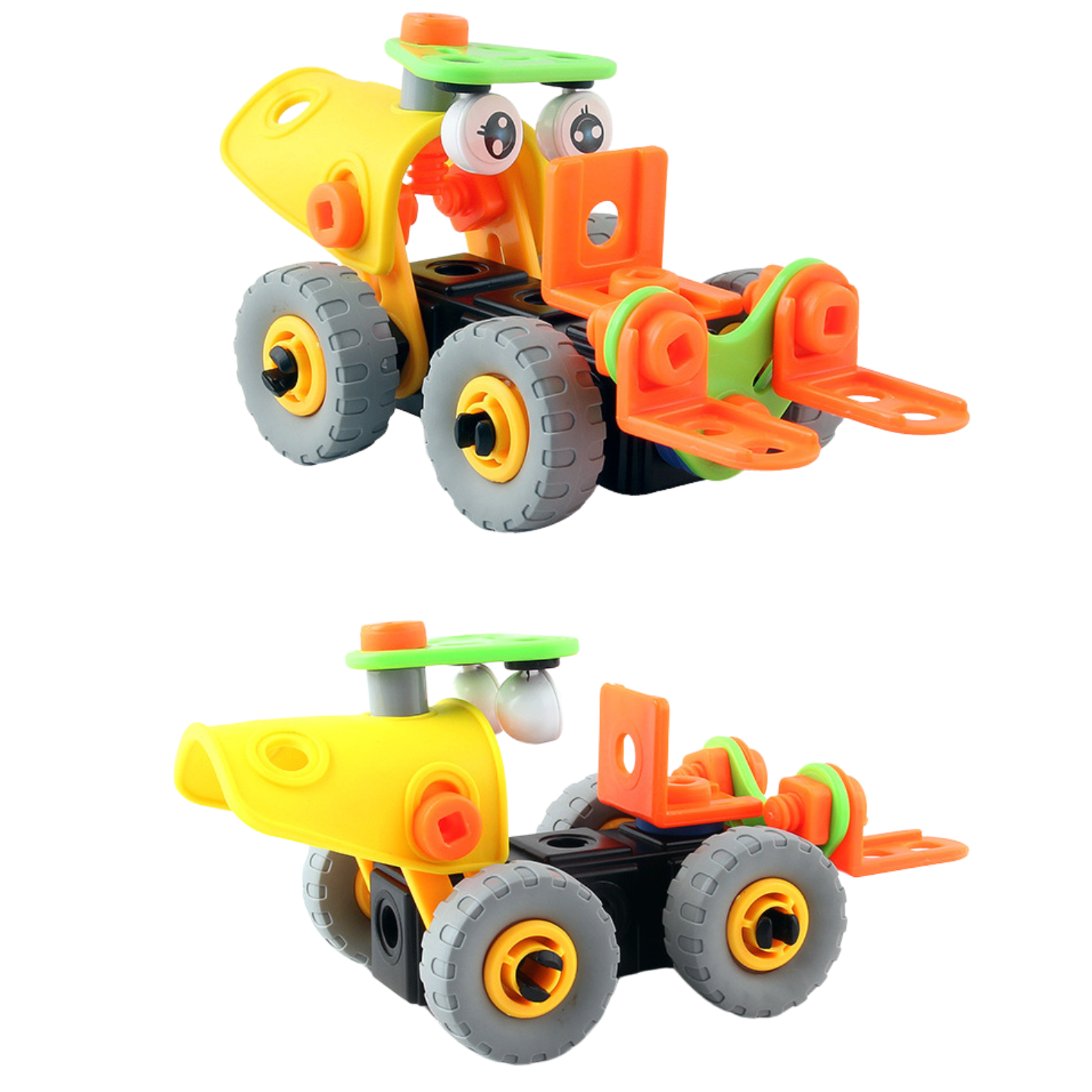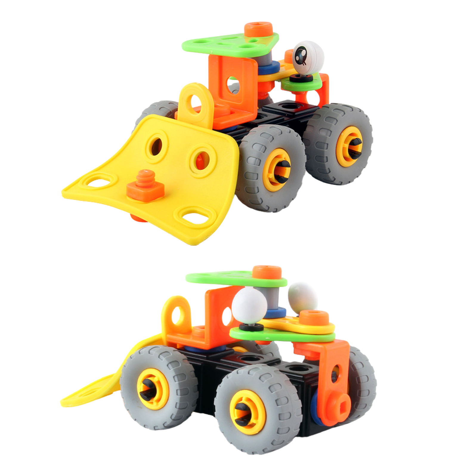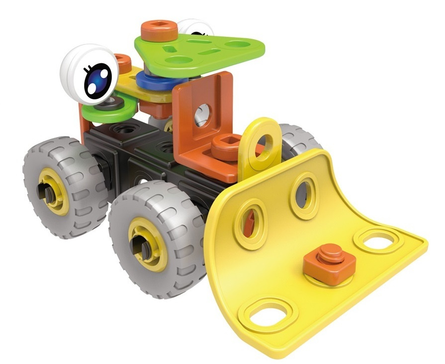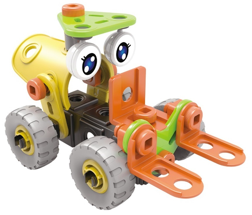 Z naszym zestawem będziesz mógł rozpocząć przygodę z majsterkowaniem i stworzyć dwa ciekawe modele pojazdów budowlanych: spych i wózek widłowy.