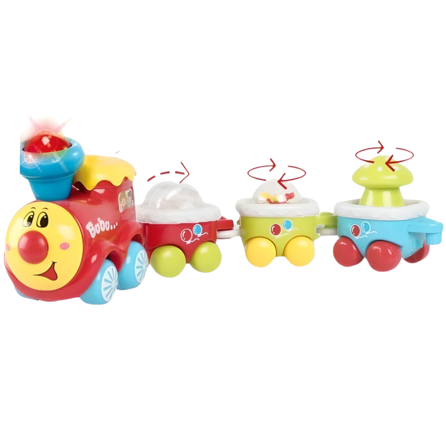 Lokomotywa i wagoniki: Zestaw zawiera główną lokomotywę oraz trzy wagoniki, które mogą być dowolnie zestawiane i łączone ze sobą. To pozwala na tworzenie różnorodnych składów pociągów, co rozwija kreatywność i zdolności motoryczne dzieci. Zestaw podczas jady wydaje dźwięki oraz efekty świetlne.