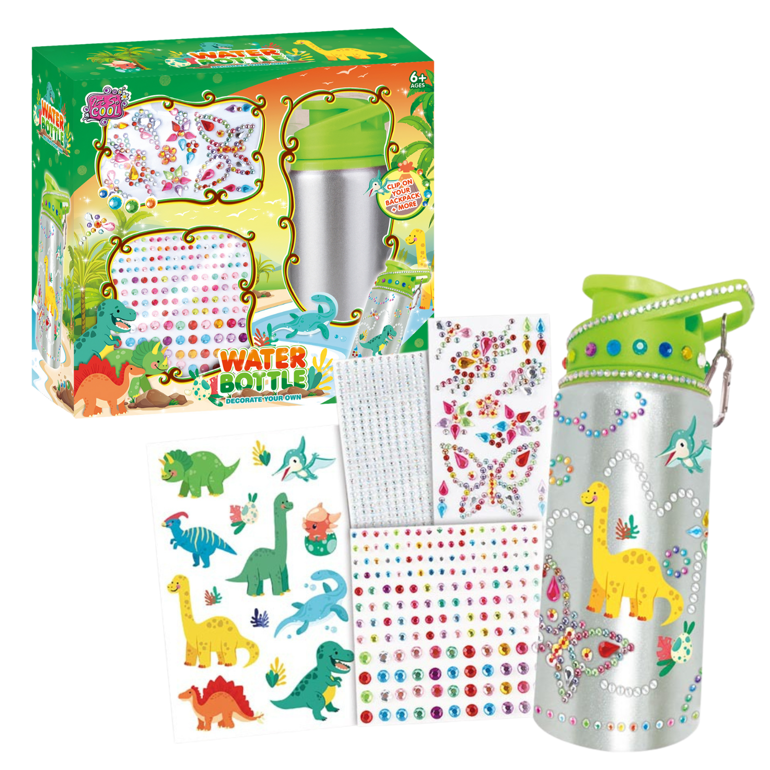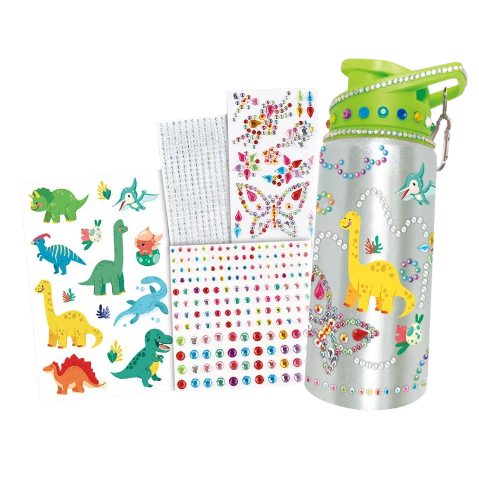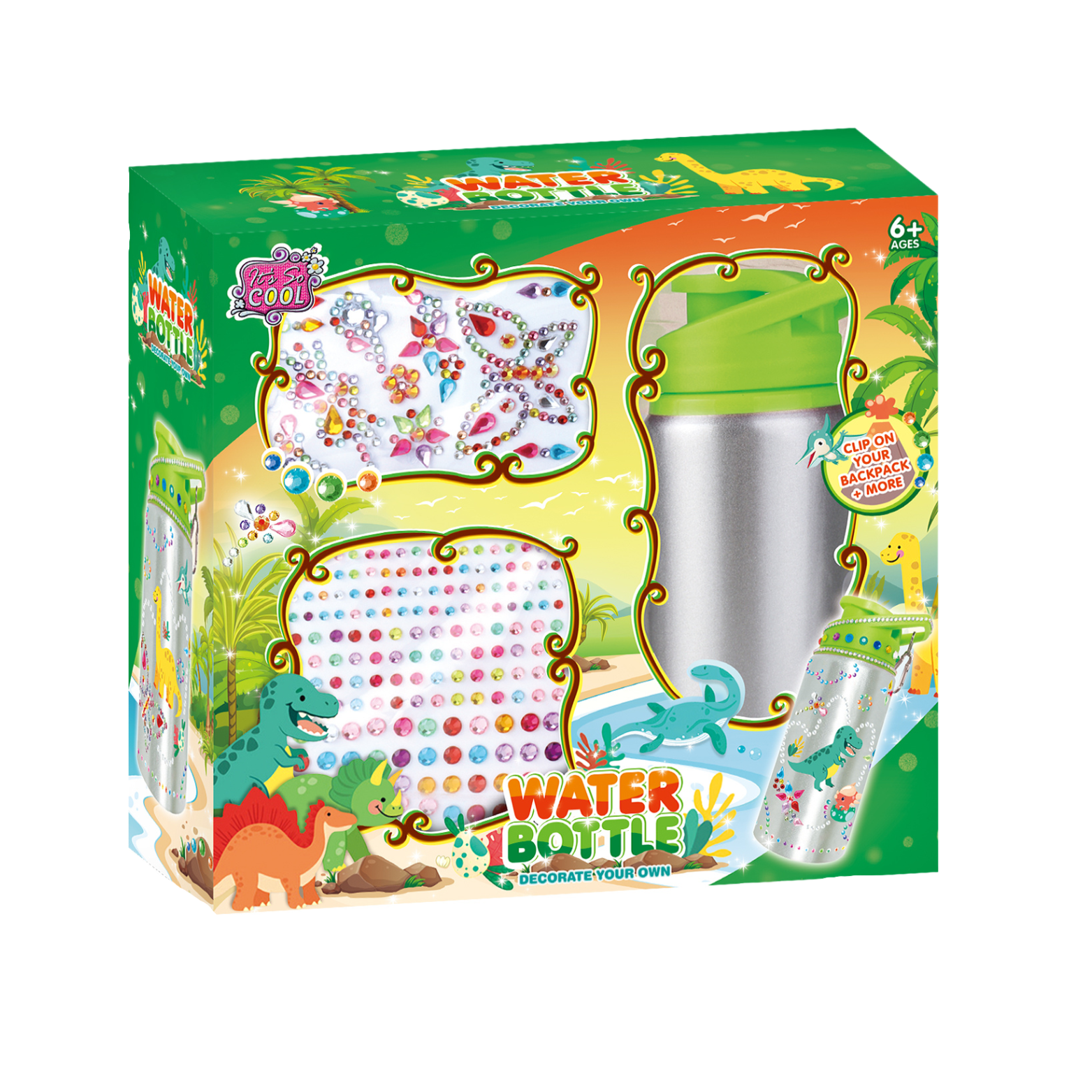 Zestaw zawiera butelkę na wodę, naklejki oraz diamenciki. Wystarczy oderwać naklejkę z wybranym wzorem i przykleić do butelki. Dzięki temu dzieci mają szansę na tworzenie różnorodnych kompozycji, układając wybrane wzory.