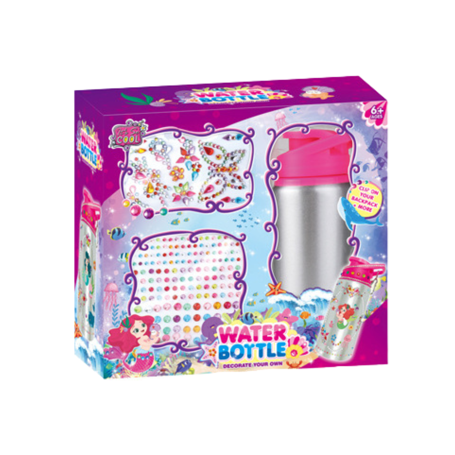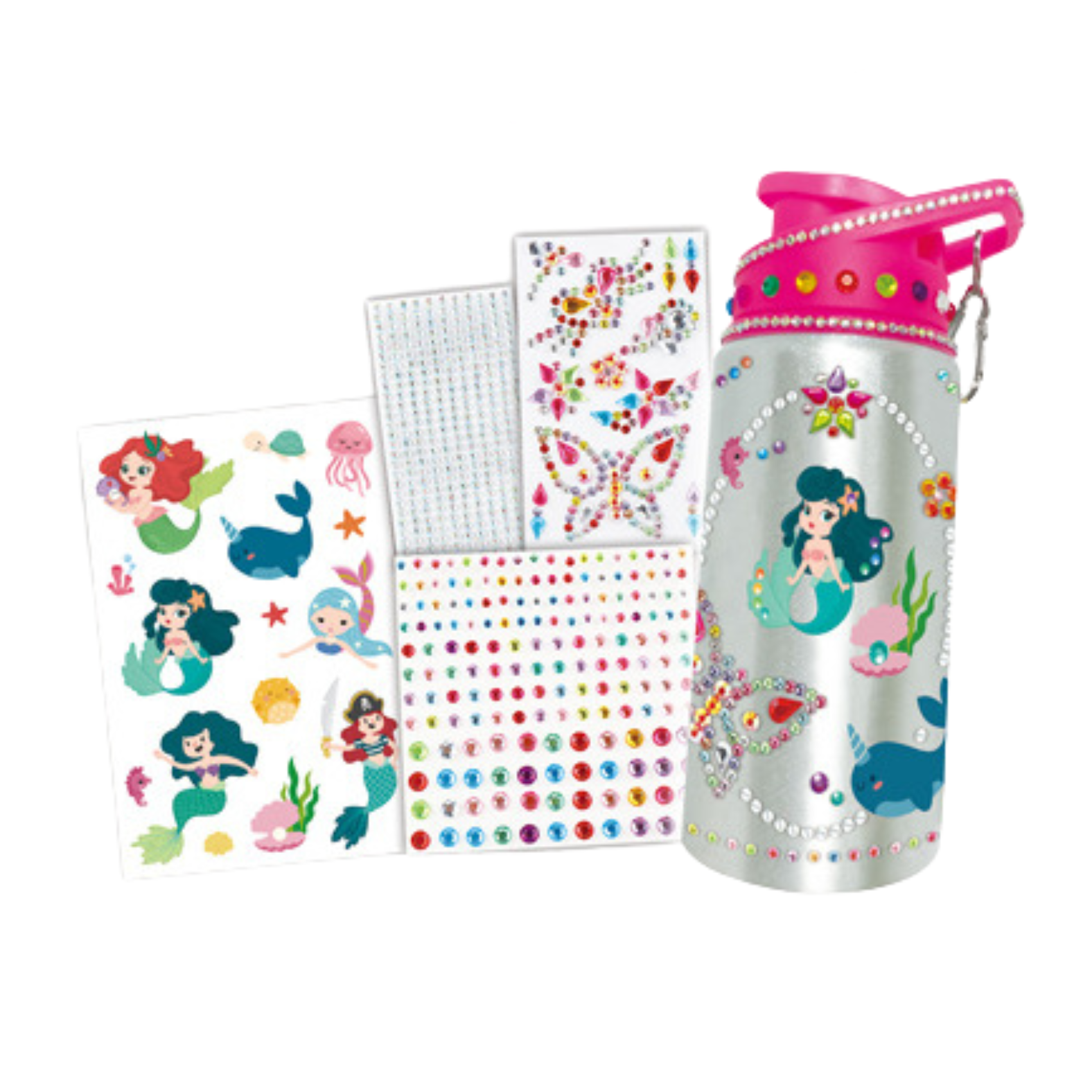 Zestaw zawiera butelkę na wodę, naklejki oraz różnokolorowe diamenciki. Dzieci mogą wybierać spośród różnych wzorów i układów, tworząc własne, unikalne dzieła sztuki.