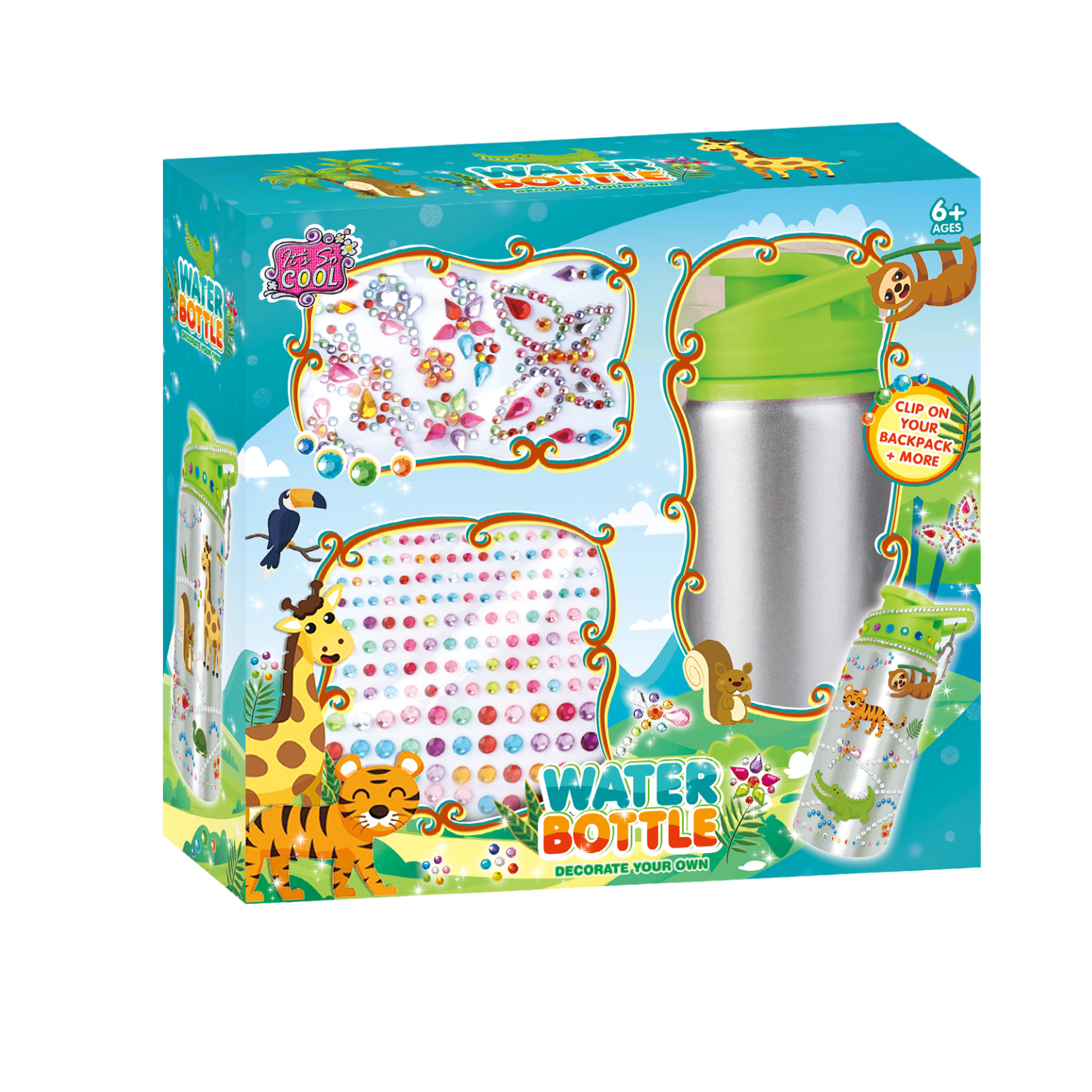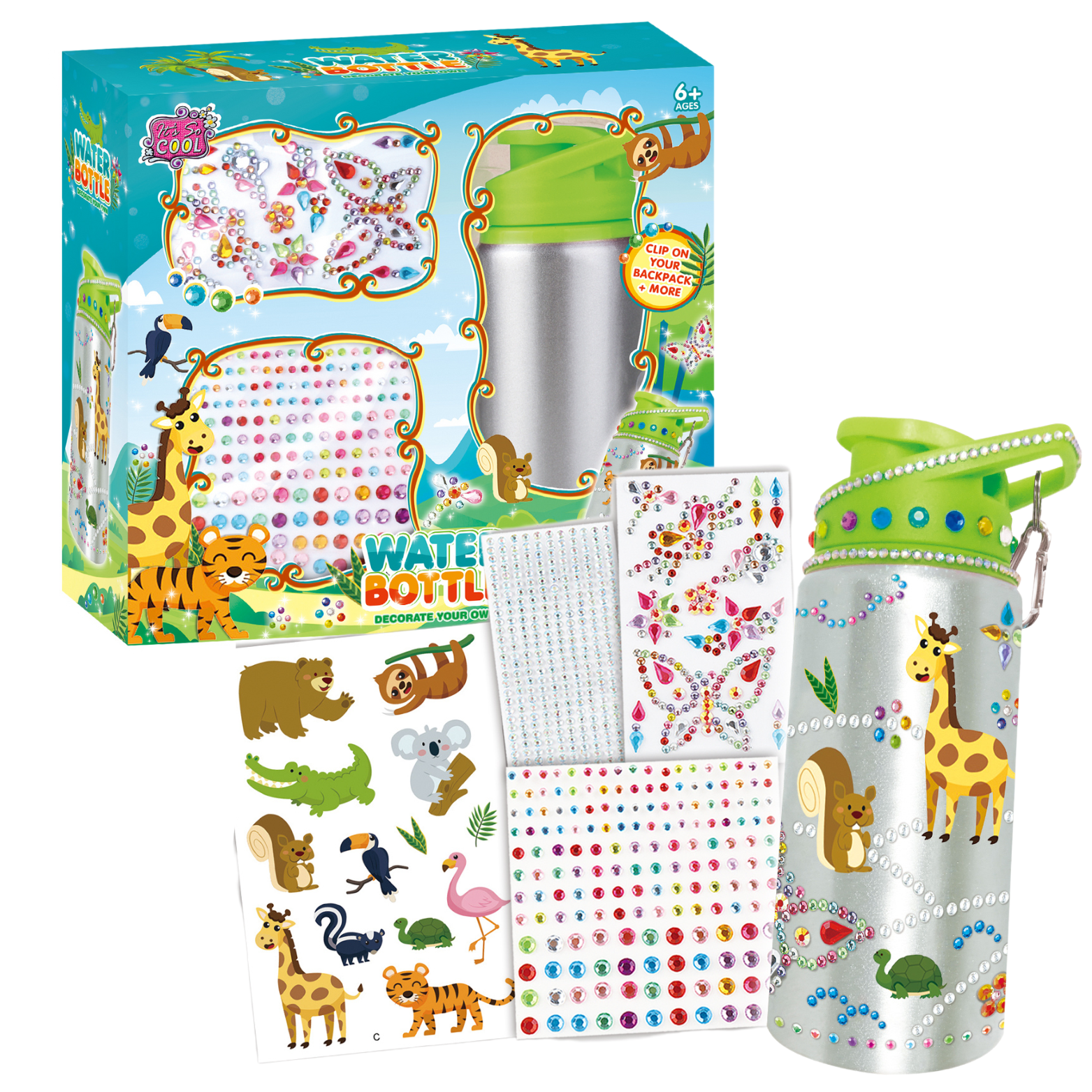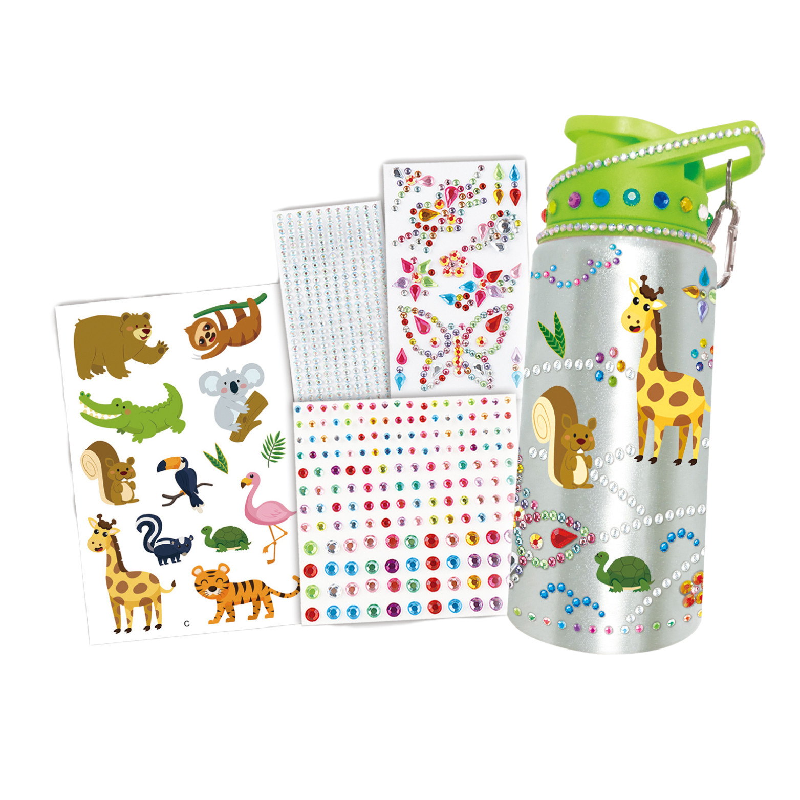 Zestaw zawiera butelkę na wodę, naklejki oraz różnokolorowe diamenciki. Dzieci mogą wybierać spośród różnych wzorów i układów, tworząc własne, unikalne dzieła sztuki.