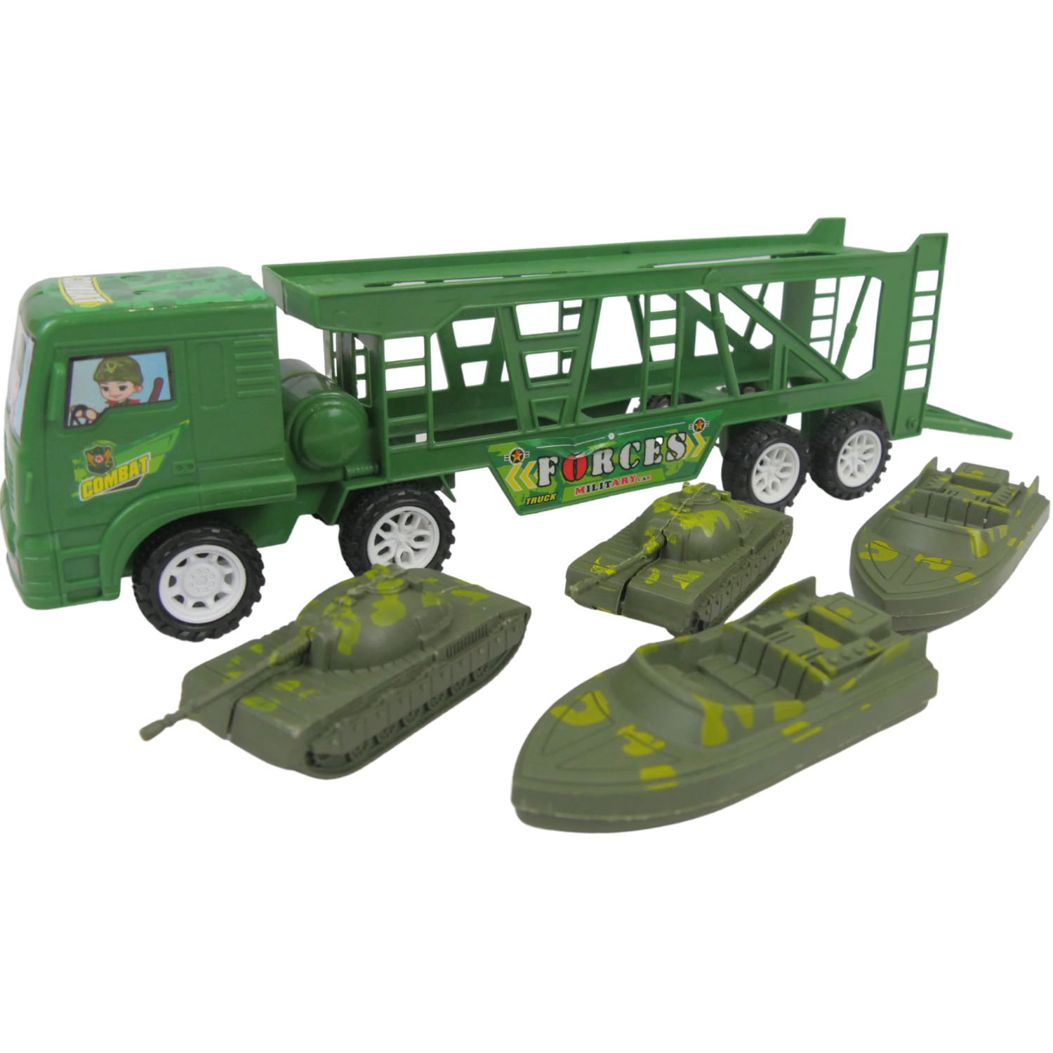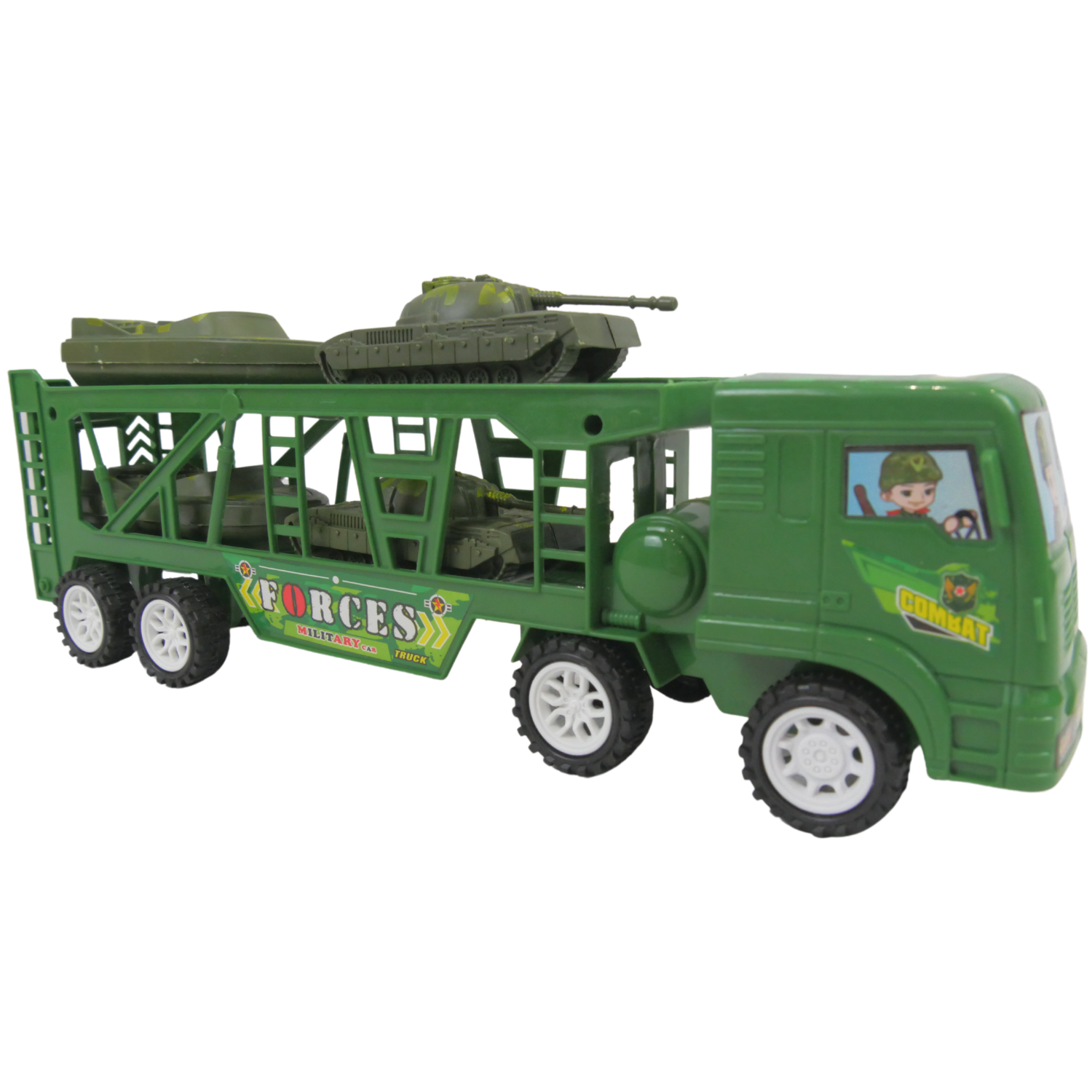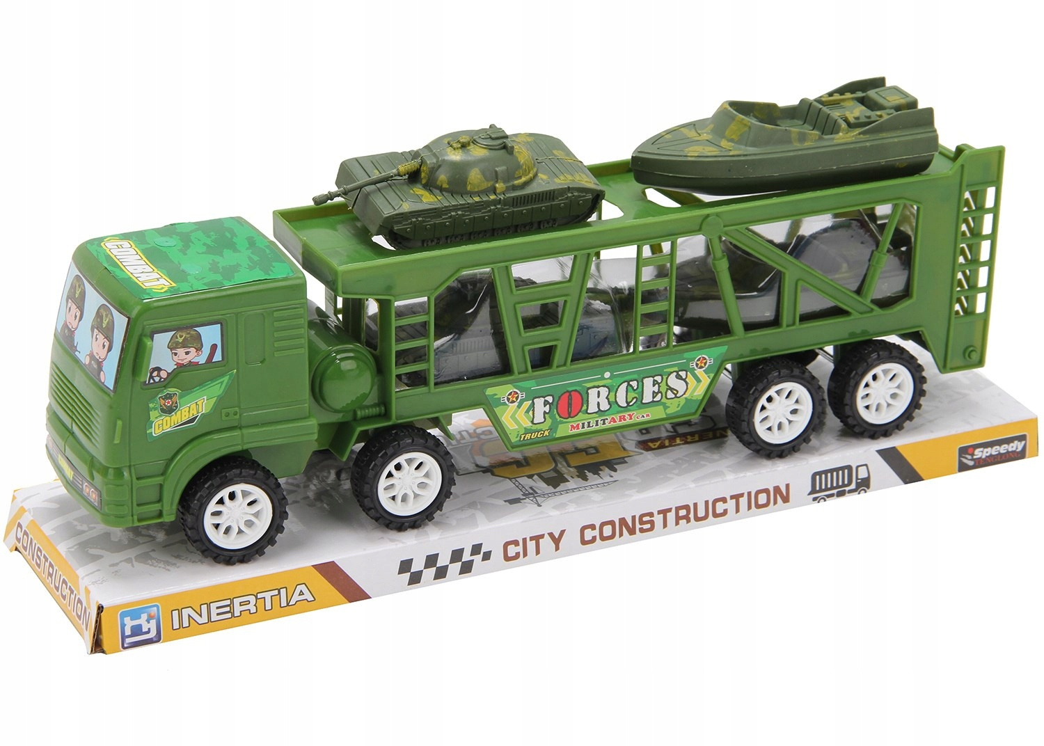 Jeśli twoje dziecko jest fanem militarnych rzeczy, to mamy coś  dla niego! Przedstawiamy lawetę wojskową z czterema modelami czołgówMaszyny możemy bezproblemowo umieścić na naczepie pojazdu. Na tylnej ścianie przyczepy jest możliwość otwarcia i wydostania pozostałych pojazdów.