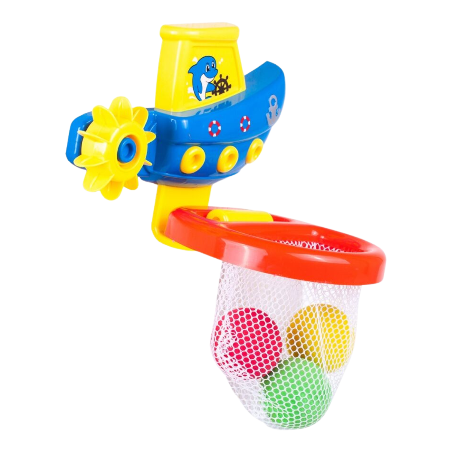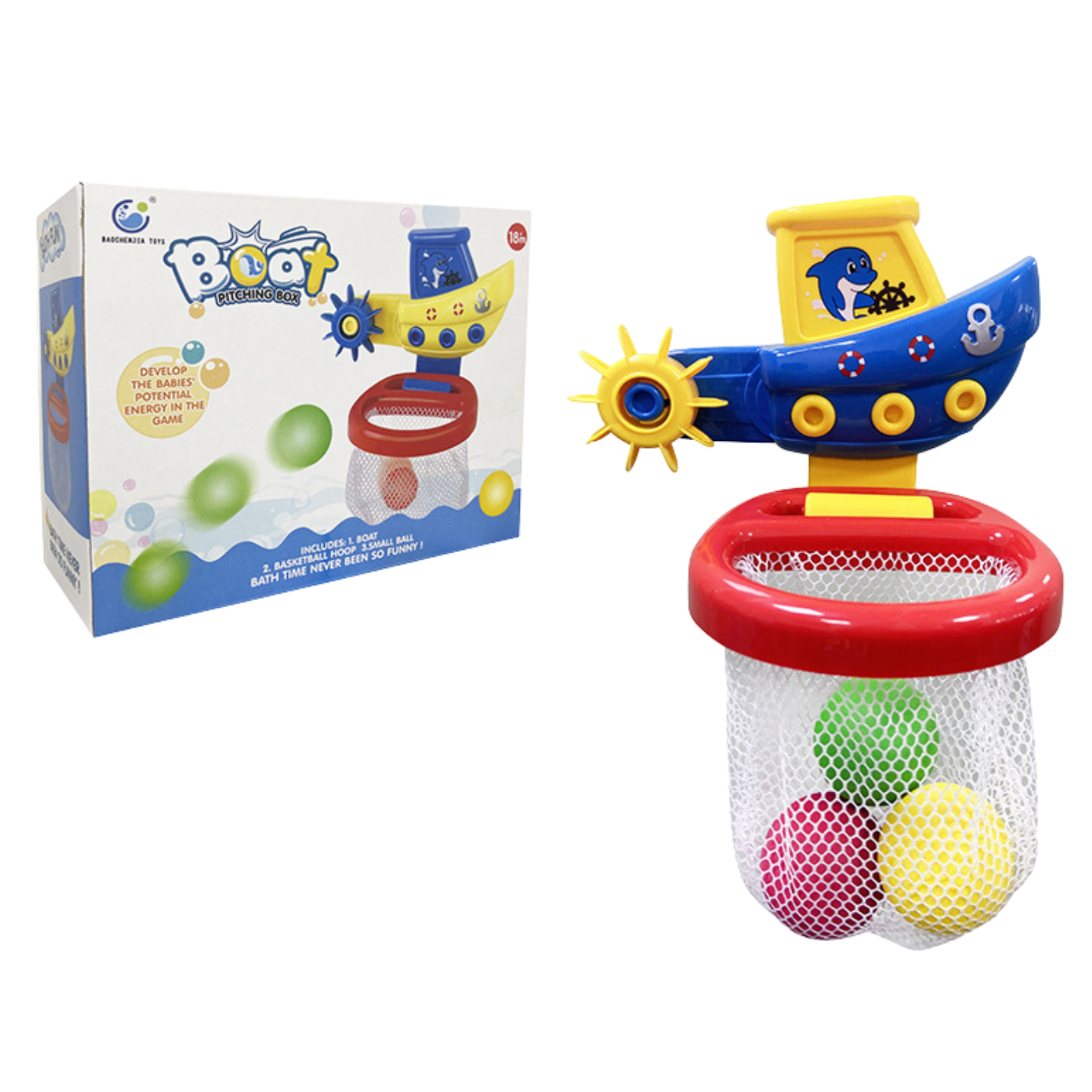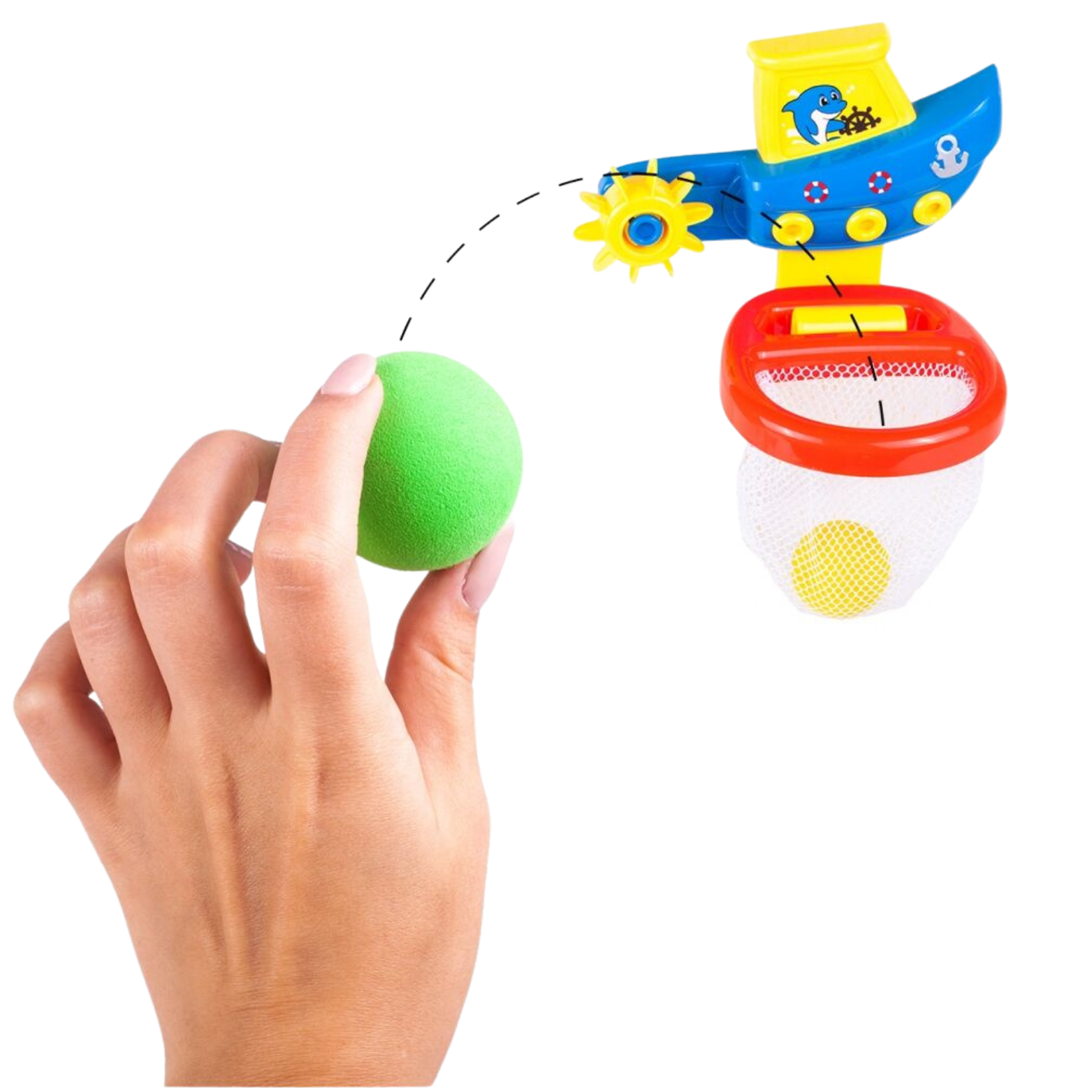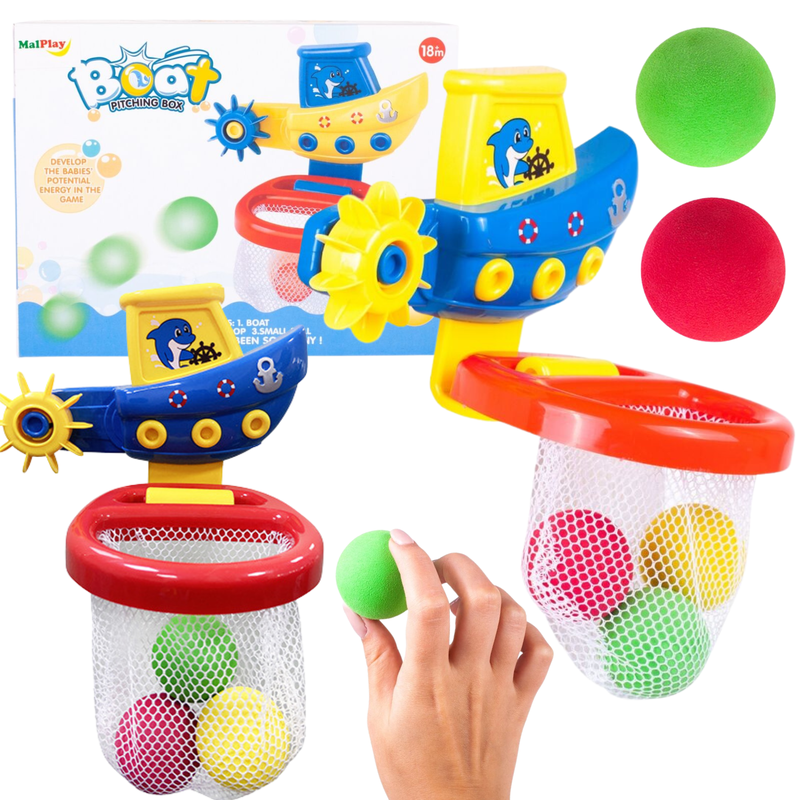 Zestaw składa się z uroczej łódki z koszem oraz trzech kolorowych piłeczek, które stanowią element interaktywnej zabawy. Podczas kąpieli maluch ma możliwość poczuć się jak na prawdziwej wyprawie łodzią. Zabawka z łatwością przyczepia się do ściany w łazience, dzięki czemu jest gotowa do użycia w każdej chwili.