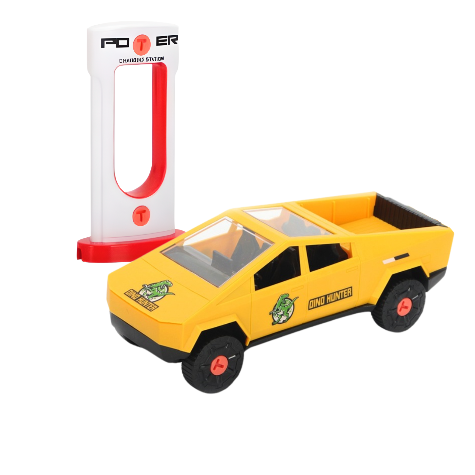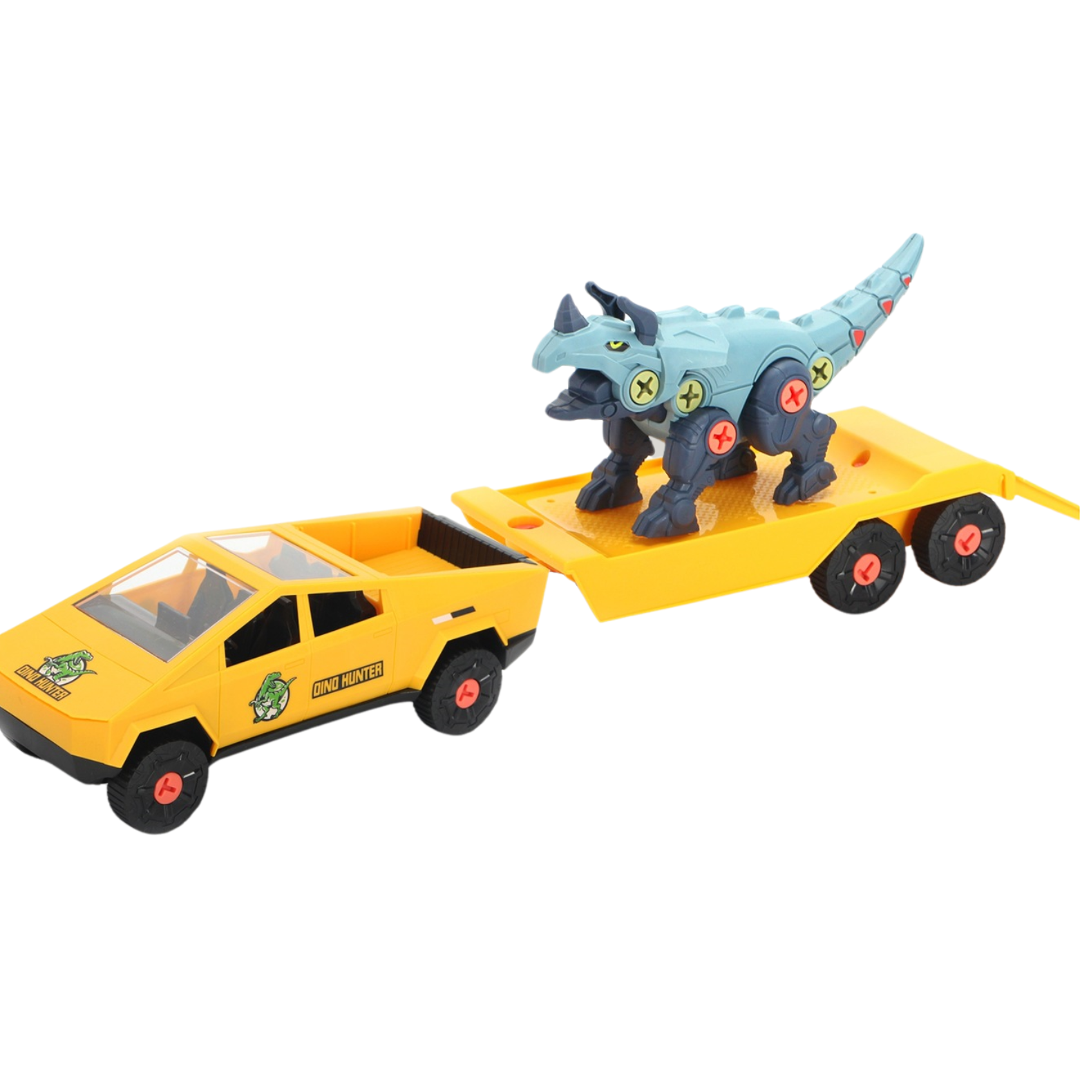 Samochód z przesuwaną przyczepą to główny element zestawu. Wyposażony w ruchome części, samochód oferuje pełen zakres zabawy. Koła pojazdu można samodzielnie wkręcać i wykręcać, co rozwija zdolności motoryczne dziecka. Przyczepa zawiera strasznego dinozaura oraz czołg, oba również posiadają rozkręcane elementy.