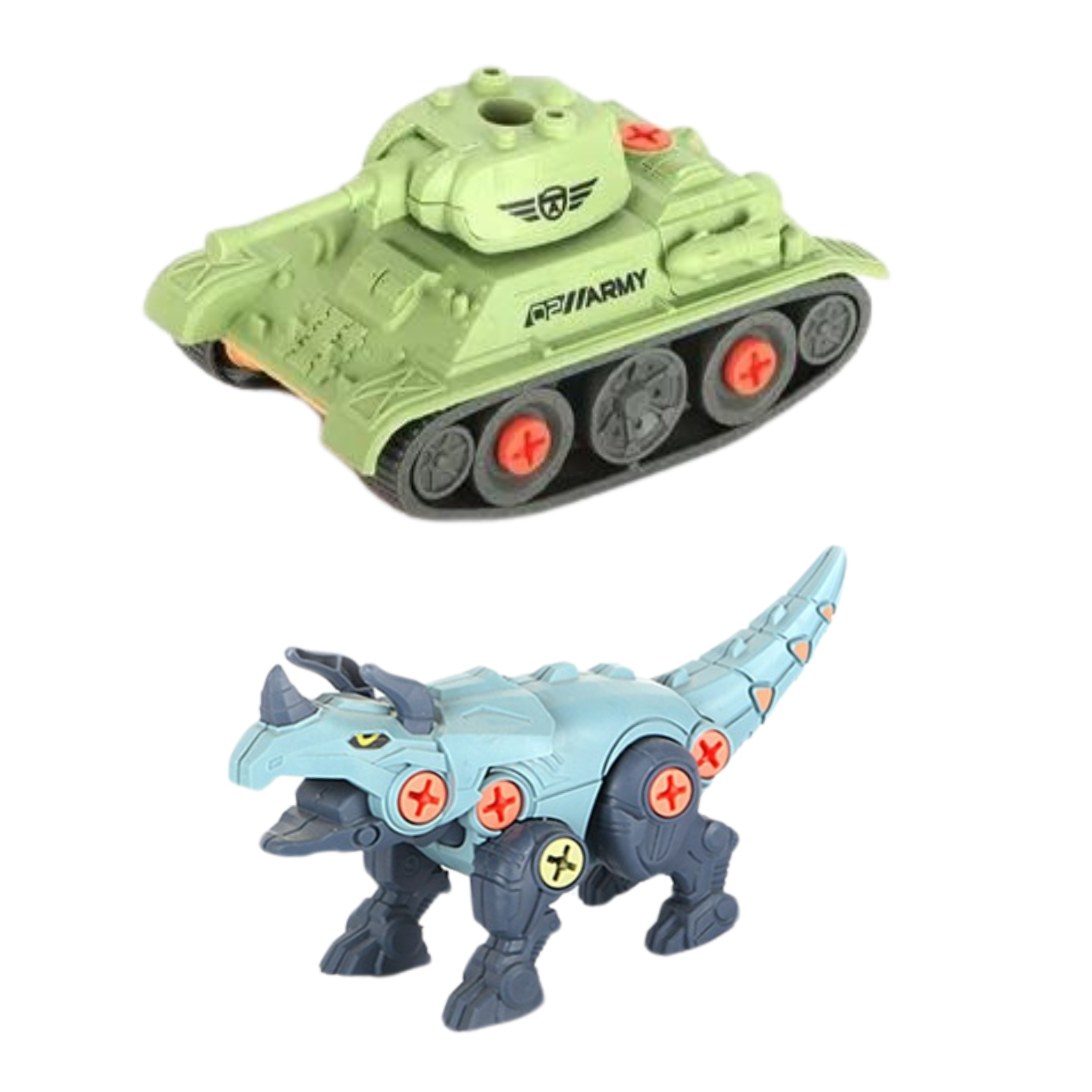 Zestaw z samochodem do samodzielnego montażu z przyczepą, dinozaurem, czołgiem i akcesoriami to fascynujące doświadczenie konstrukcyjne dla dziecka. Jest to idealny wybór dla małego inżyniera.