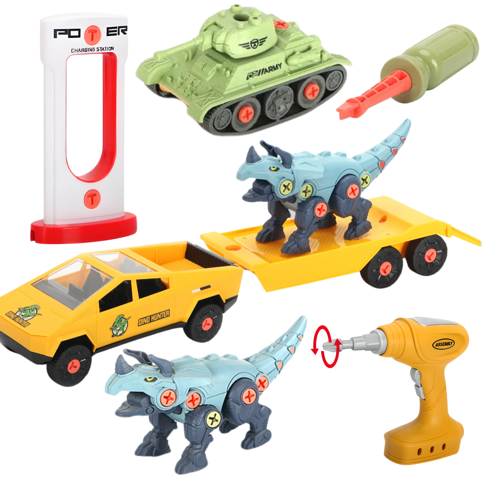 ZESTAW SAMOCHÓD DO MONTAŻU Z PRZYCZEPĄ CZOŁG DINOZAUR WIERTARKA ŚRUBOKRĘT
