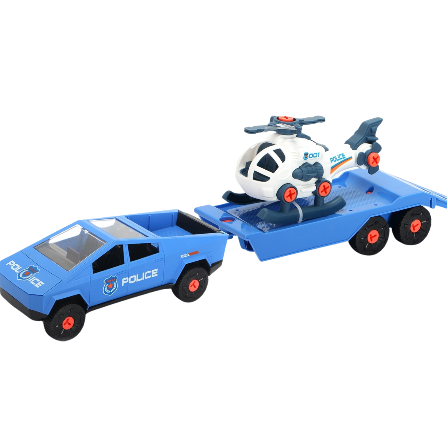 Samochód z przesuwaną przyczepą to główny element zestawu. Wyposażony w ruchome części, samochód oferuje pełen zakres zabawy. Koła pojazdu można samodzielnie wkręcać i wykręcać, co rozwija zdolności motoryczne dziecka. Przyczepa zawiera helikopter oraz czołg, które również posiadają elementy do montażu i demontażu.