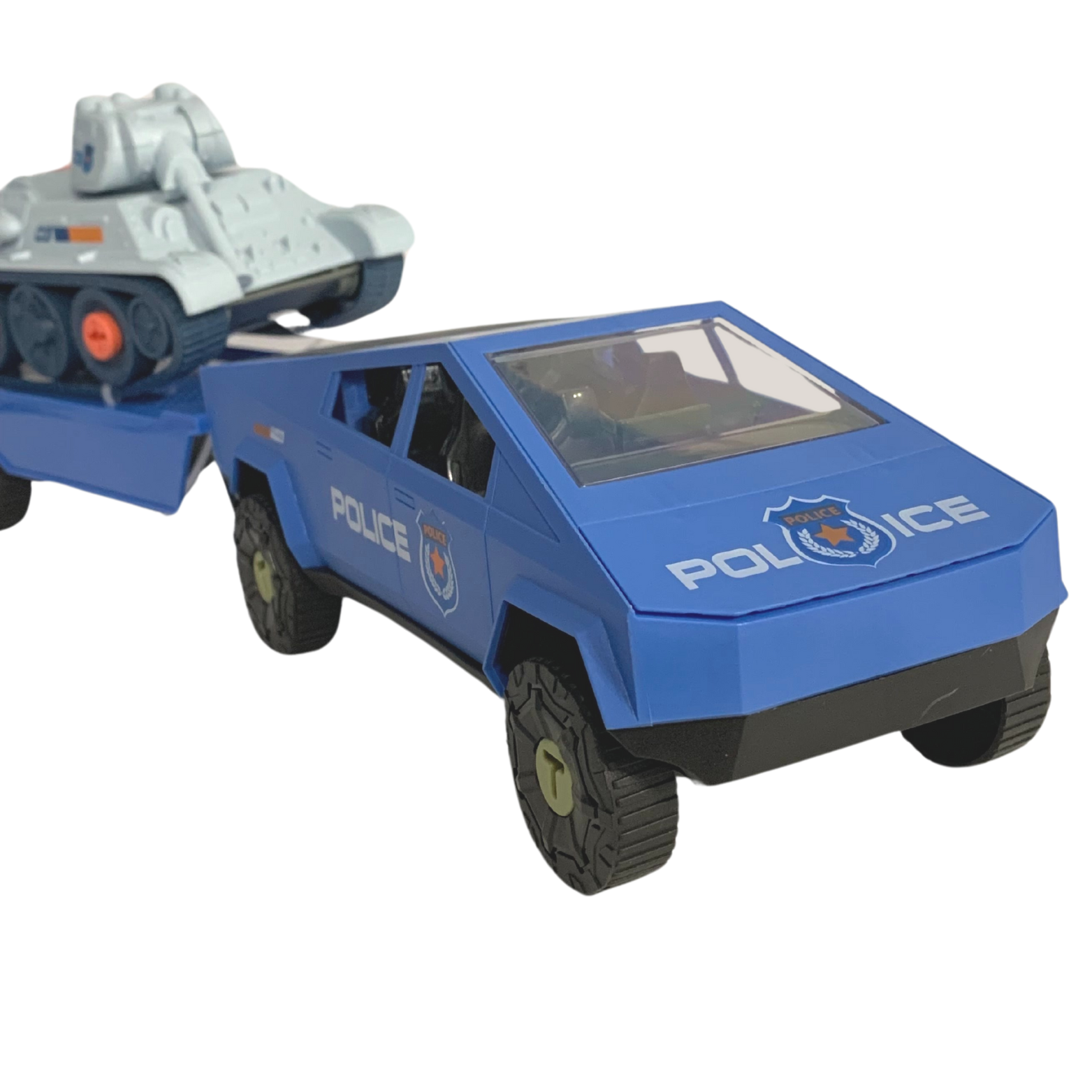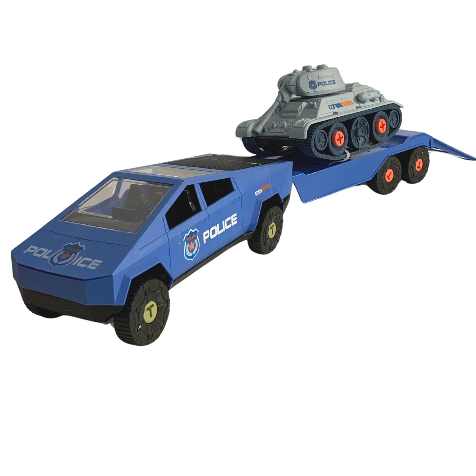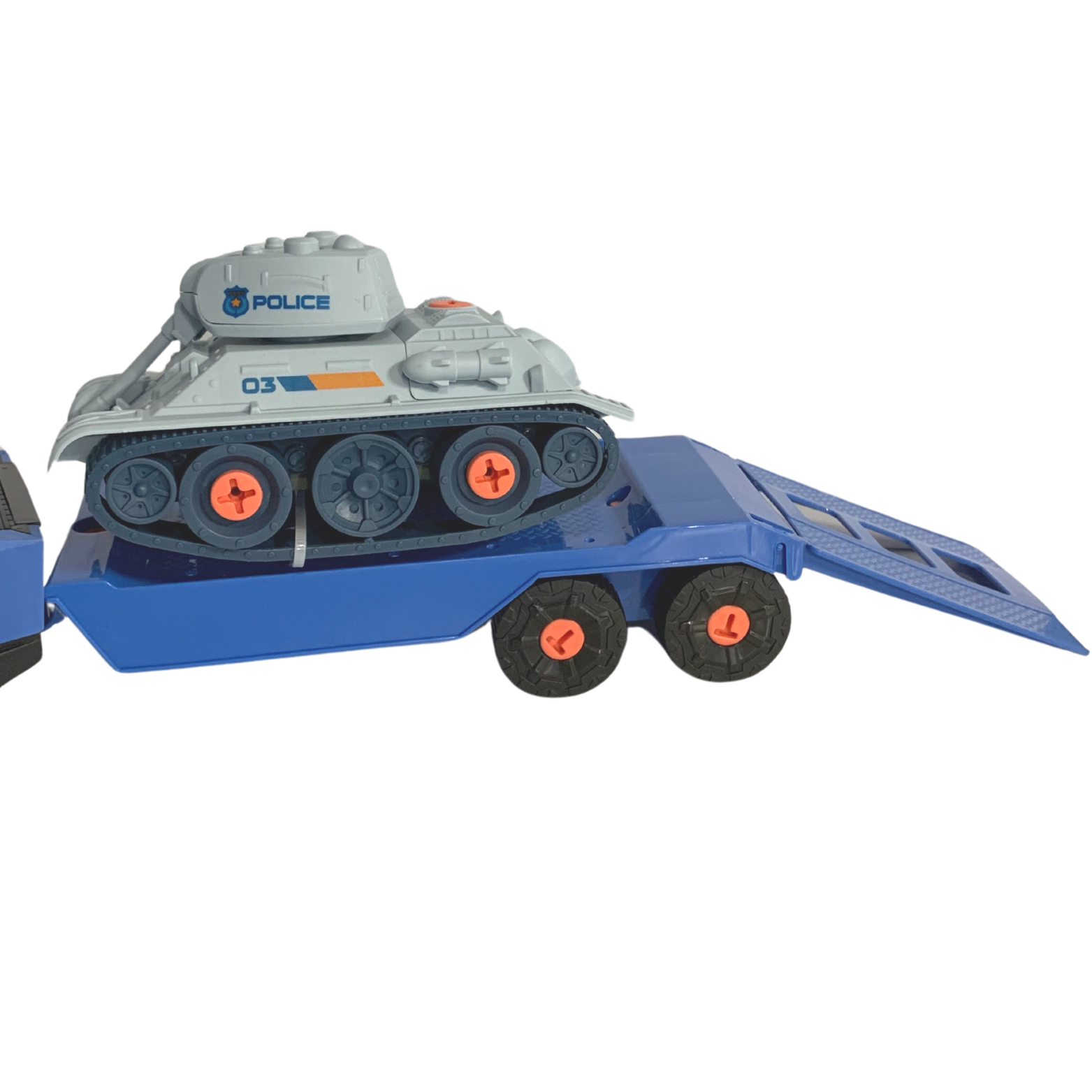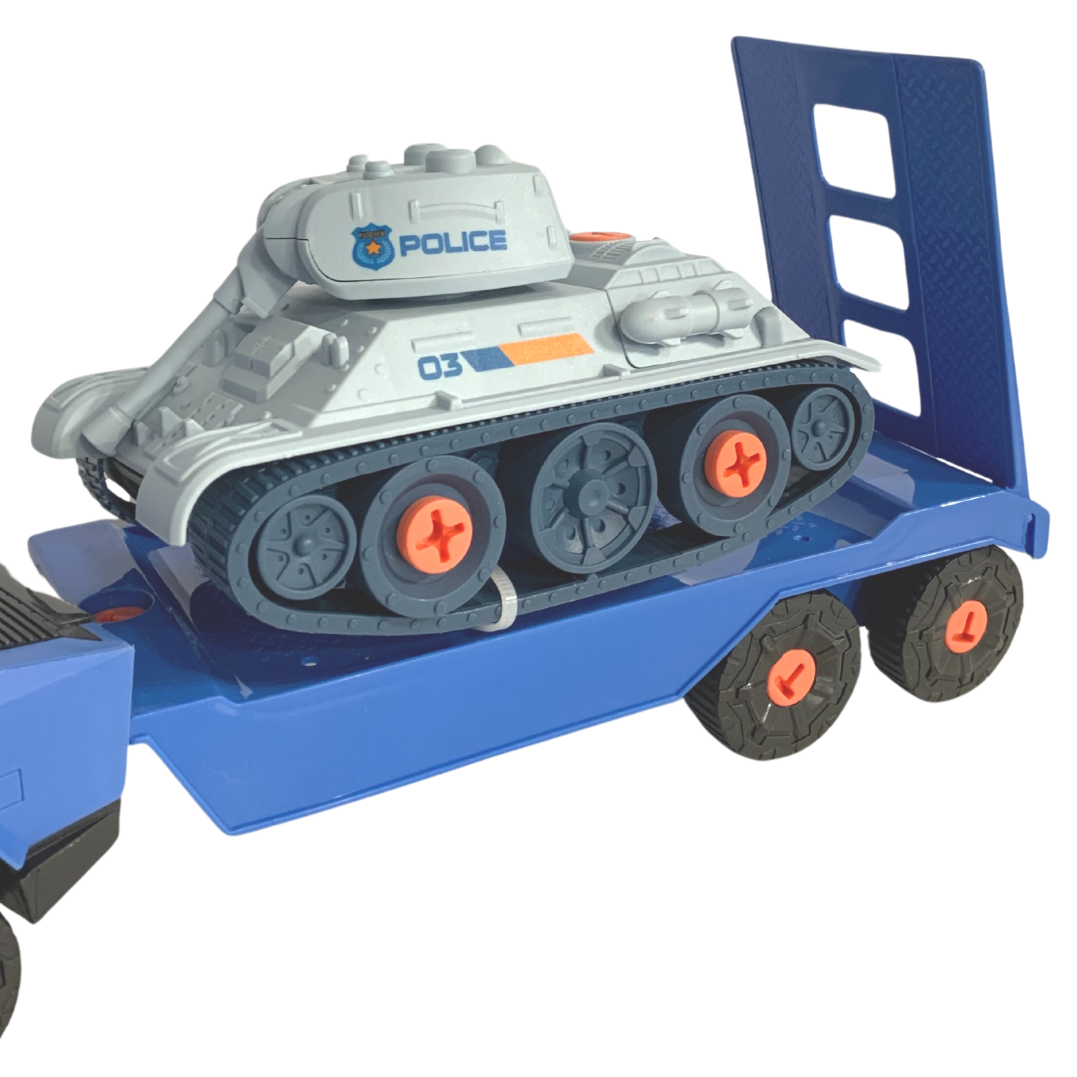 Samochód z przesuwaną przyczepą to główny element zestawu. Wyposażony w ruchome części, samochód oferuje pełen zakres zabawy. Koła pojazdu można samodzielnie wkręcać i wykręcać, co rozwija zdolności motoryczne dziecka. Przyczepa zawiera czołg gotowy do jazdy! Elementy czołgu również można wkręcać i wykręcać według uznania.