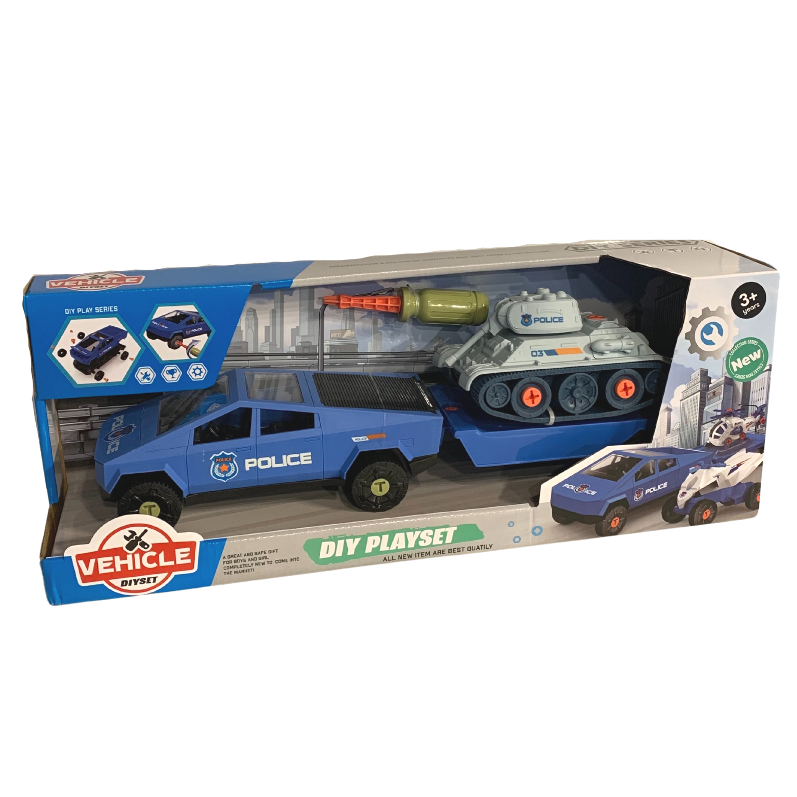 ZESTAW SAMOCHÓD DO MONTAŻU Z PRZYCZEPĄ CZOŁG ŚRUBOKRĘT WÓZ POLICYJNY